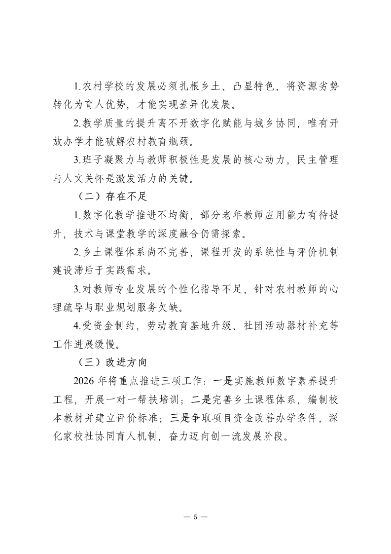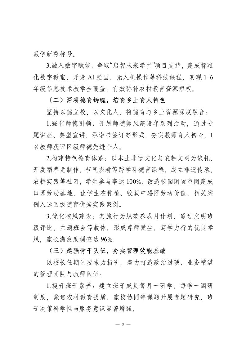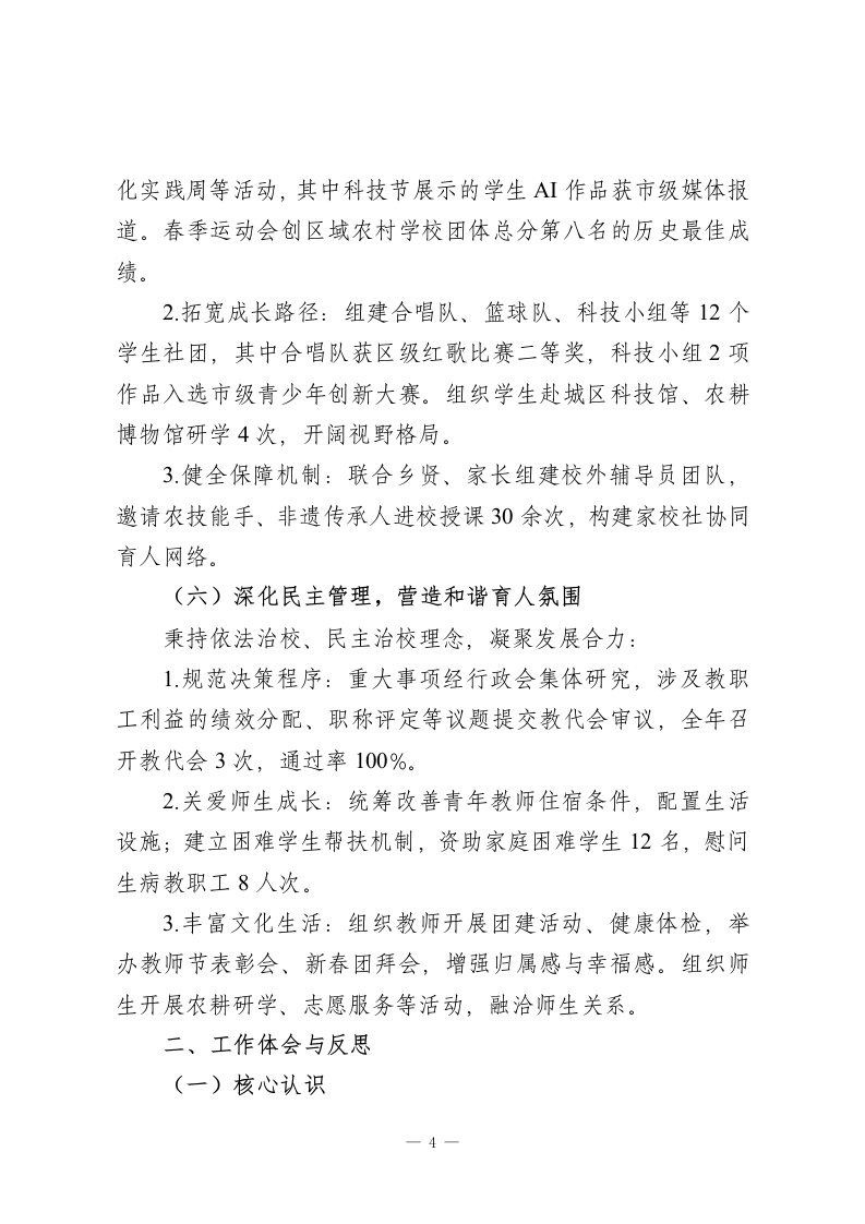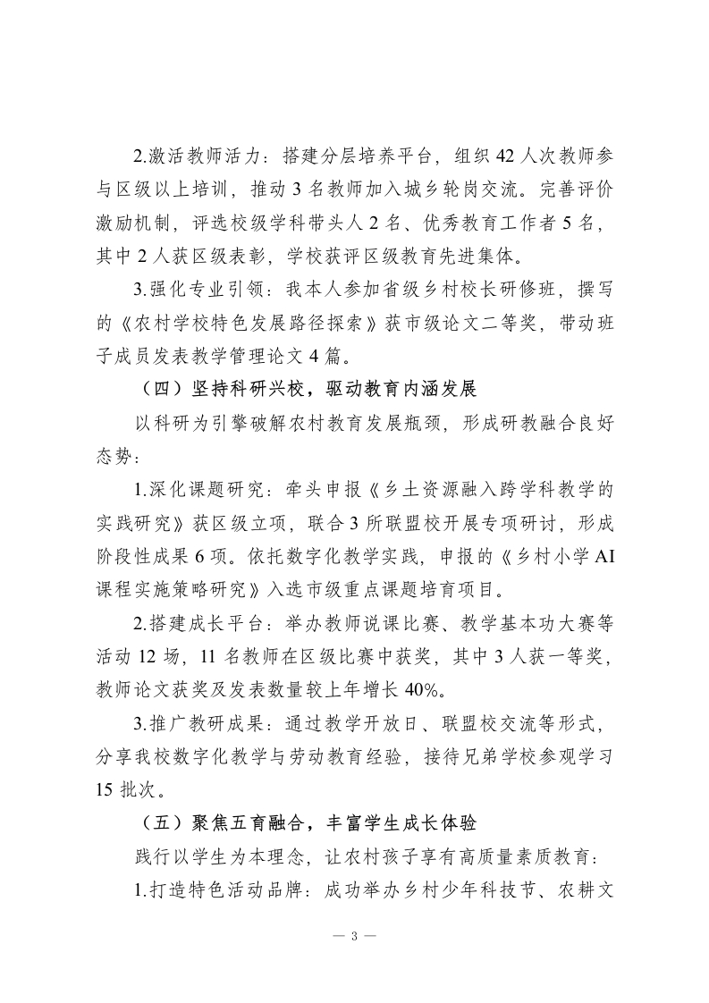 2025年度农村学校校长个人工作总结:以质立校谋发展,乡土特色筑根基2025年是我校落实三年发展规划谋发展阶段的关键一年,更是乡村教育振兴战略深入推进的重要节点。在上级教育部门的精准指导与全体教职工的协同奋斗下,学校各项工作紧扣质量提升、特色发展、内涵提质核心目标,办学成效获得家长、社会广泛认可,多项成果获区级表彰。在此,谨向给予我工作指导的各位领导、鼎力支持的全体教职工致以诚挚感谢。现将本年度个人履职与学校工作情况汇报如下,请予审议。一、核心工作与成效(一)锚定质量核心,构建乡村教学新生态教学质量是农村学校的立身之本,更是回应群众期盼的关键。面对农村生源流动性增强、基础差异扩大的现实挑战,我校以精准施策、协同提质为路径,筑牢质量根基:1.聚焦毕业班突破:实施中层干部包联责任制与学科教师捆绑评价机制,建立学情诊断一策略制定一过程监控闭环体系,毕业班核心学科成绩较上年提升8%英语学科超出区域平均水平5个百分点,获教委专项奖励。2深化教研改革:依托城乡教研共同体,推行线上备课+线下研讨的混合式备课模式,成立6个学科教研组,开展同课异构、名师送教活动28场。建立青年教师成长档案,通过师徒结对、专业考核、优秀课评选三维培养体系,3名青年教师获区级1