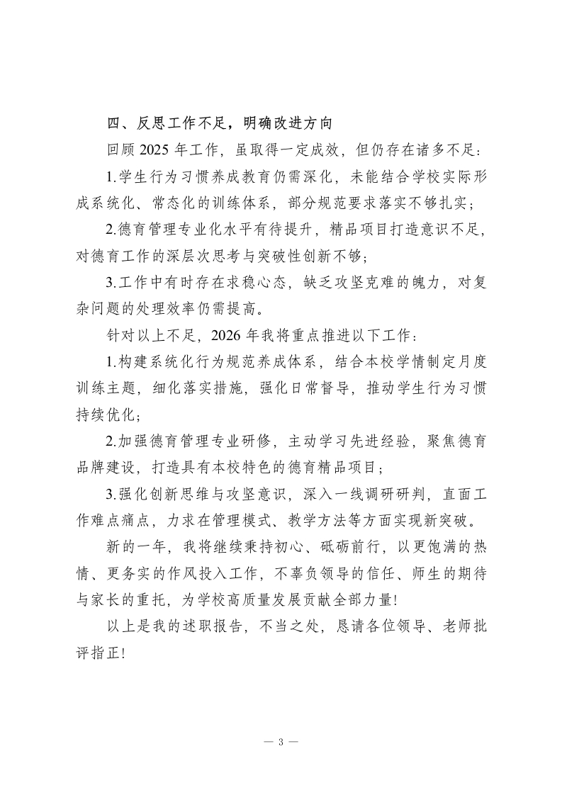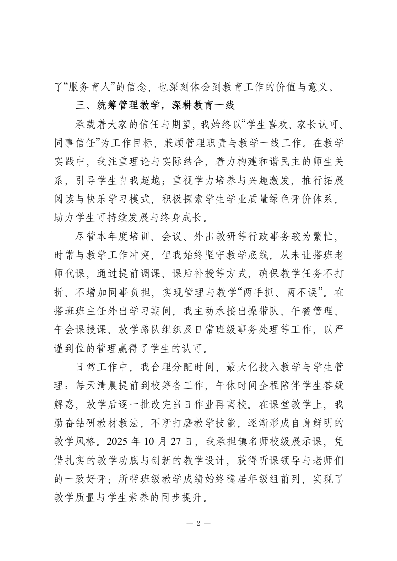 2025年度校长个人述职报告:聚焦育人实效,深耕教育一线尊敬的各位领导、老师们:大家好!2025年,在上级领导的悉心指导与全体教职工的鼎力支持、理解配合下,我圆满完成了各项工作任务。在此,向大家致以诚挚的感谢!现将本年度个人工作情况汇报如下:一、强化理论学习,筑牢履职根基“德为师之本”,作为学校德育工作管理者,我始终将师德修养放在首位。在工作与生活中,无论是面对学生还是同事,均以高标准严要求约束自身言行,率先垂范,努力以人格魅力凝聚师生合力。2025年,我持续深化学习提升,先后参加2025年市中小学校长暑期专题培训、市新优质项目暑期校长培训、区教育系统校级干部进阶培训班,坚持学思践悟、总结沉淀。日常保持每日半小时学习习惯,重点钻研学校管理、德育专业知识,不断优化知识结构,提升履职能力。二、聚焦师生需求,提升服务效能师生满意、家长认可是教育工作的核心追求。本年度,我始终秉持“以人为本”理念,主动回应师生及家长诉求,积极化解各类矛盾纠纷。无论是教师工作中的困惑、家长育儿中的难题,还是学生成长中的烦恼,我都竭尽所能运用教育智慧耐心协调解决。每当收到大家的真诚认可与感谢,都让我更加坚定1