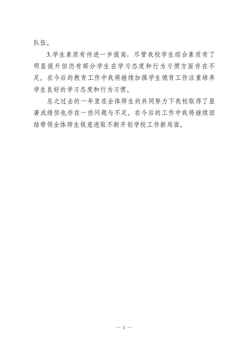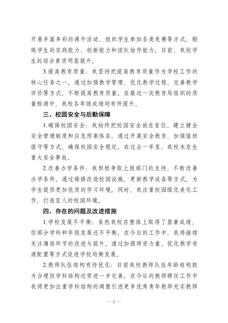 2025年度校长年度考核个人总结:取得了显著成绩但也存在一些问题与不足在过去的一年里,我作为校长,全面负责学校的行政和教育工作。在上级领导的关心和支持下,在全体师生的共同努力下,我校取得了显著的成绩。现将年度工作汇报如下:一、学校管理1.制定学校发展规划:年初,我组织班子成员,结合学校实际情况,制定了详细的发展规划,明确了年度工作目标和重点任务。规划注重实际性、可行性和创新性,为学校发展提供了明确的方向。2加强制度建设:我重视制度建设,完善了学校各项管理制度,确保学校各项工作有章可循、有据可依。同时,我推动学校内部管理体制改革,激发了广大教职工的工作积极性」3.强化师德师风建设:我注重教师职业道德和业务能力的培养与提升,通过开展师德师风教育活动、组织教师培训等方式,提高教师的综合素质。目前,我校教师队伍稳定、团结,教育教学水平不断提高。二、教育教学工作1.推进课堂教学改革:我积极响应教育部门号召,推动课堂教学改革。通过开展公开课、观摩课等活动,推广先进的教学方法和手段,提高课堂教学效率。同时,我鼓励教师开展课题研究,提升科研能力和教学水平。2.加强学生素质教育:我重视学生综合素质的培养,通过1
