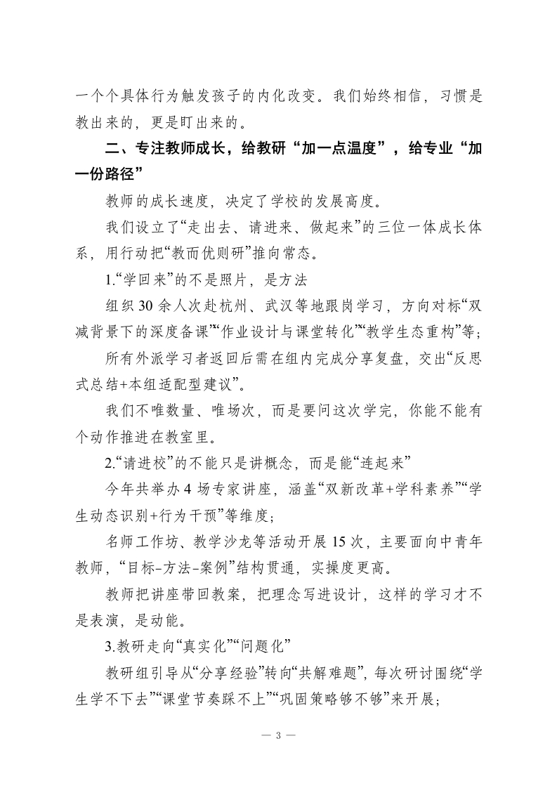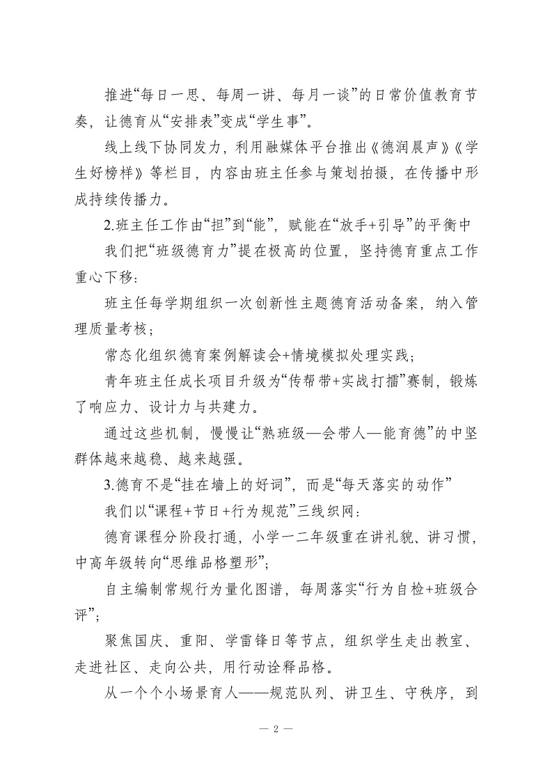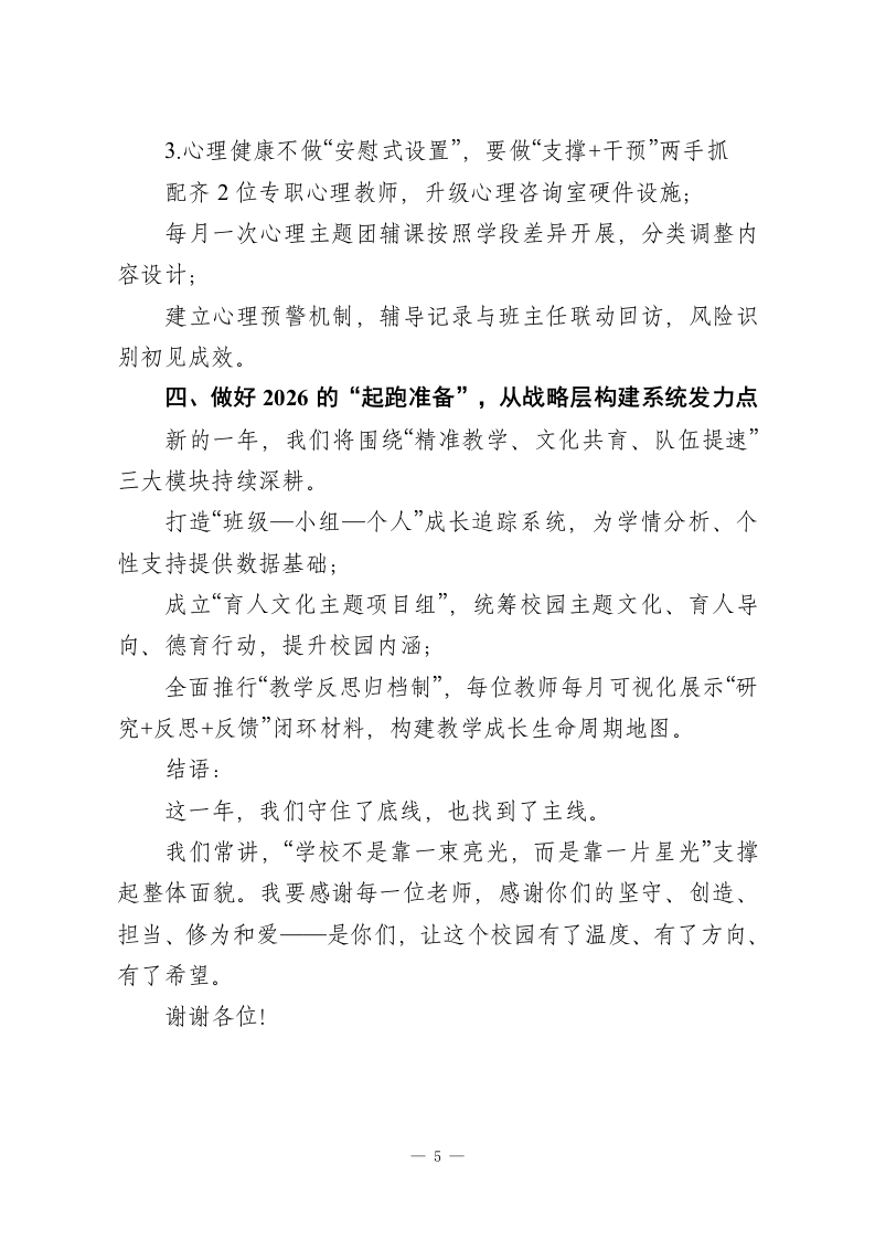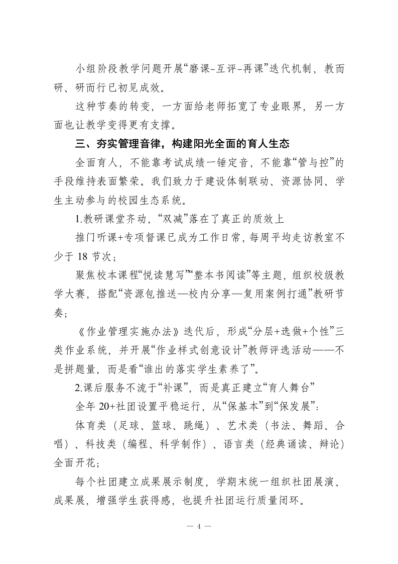 2025年度校长述职报告,道出了教育的初心与理想:做有思想的校长,办有文化的学校尊敬的各位领导、亲爱的老师们:大家下午好!时间从不怠慢,转眼2025年已画上句号。这一年,是我们持续深耕、稳步推进的重要一年。走过这一程,我深知,每一个阶段成果的取得,离不开上级的有力指导,离不开全体教师的同频同行,离不开家长的理解支持,更离不开一批批心中有光、脚下有力的学生,是你们成就了学校的一切荣光。作为学校工作的主要管理者,我始终保持“把工作干在前、把责任扛在肩”的初心,也时时提醒自己:在其位、谋其政、尽其责。在此,我围绕本学年度重点工作推进与目标达成,做一个全景式的工作汇报,请大家批评指正。一、守根固基,做实德育,让“育人”落地有声1.思想引育双并行,构建融合型德育新框架德育是一所学校真正的“精气神”。这一年,我们以德育为主线,以党建为引擎,统筹推动德育与校园日常管理治理深度嫁接,努力让价值浸润进学生学习生活的每一个场景中。我们重组了德育工作架构,把“党建+德育”系统打通:优化党团队组织联动机制,全年组织集体宣讲、实地参访、主题晨会40余次,提高教育覆盖强度;
