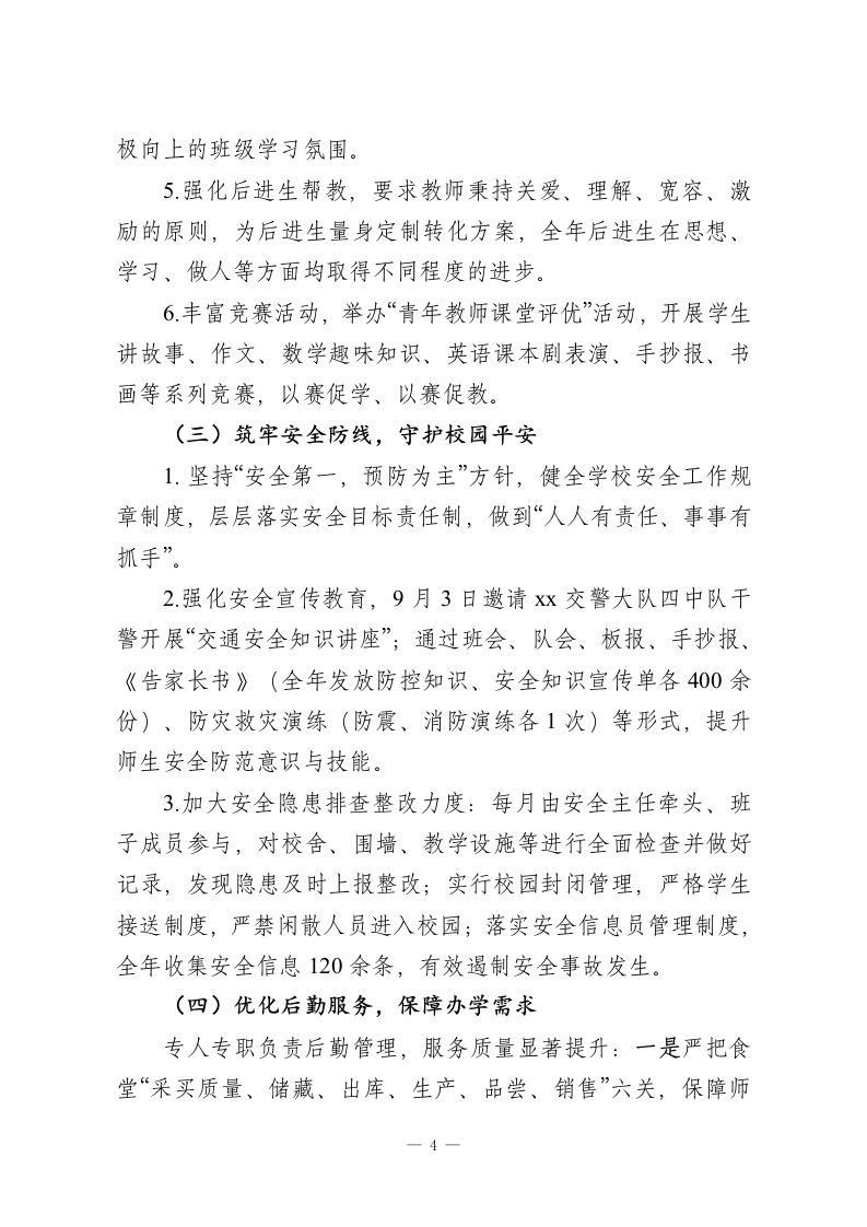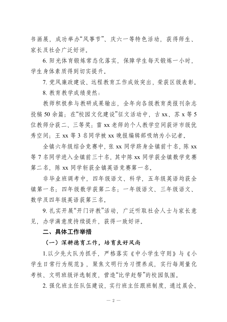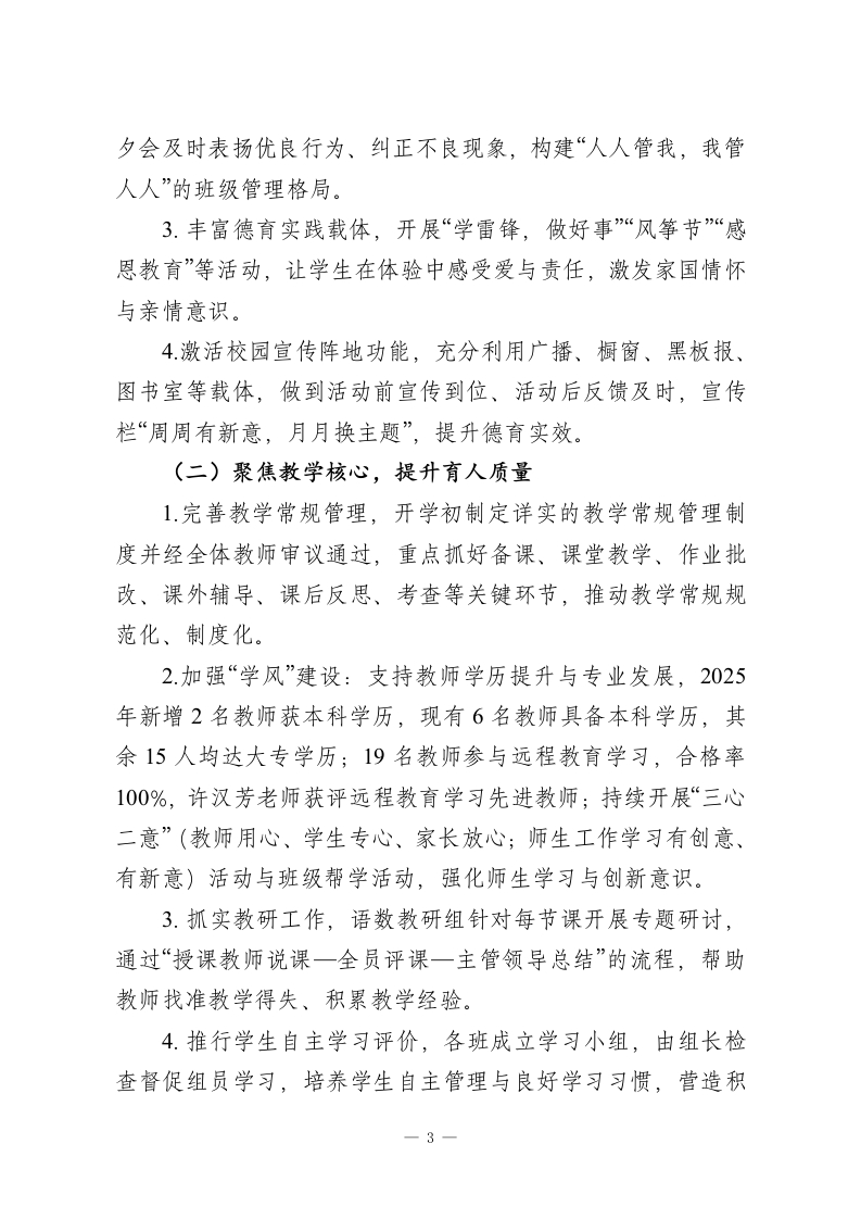 2025年度校长述职报告及2026工作规划尊敬的各位领导、各位老师:大家好!2025年,在教育主管部门的指导与关怀下,我校秉持“育人为本”的核心理念,坚守“把学校办成适应当地发展需要、学生向往、家长放心、社会声誉好的全日制农村小学”的办学目标,以“脚踏实地做事,诚实守信做人”为校训,围绕“提升教学质量”核心、“校园文化建设”主线,全体教职工团结拼搏、真抓实干,圆满完成学年初既定的各项工作目标。现将本年度工作述职如下:一、年度主要成绩1.成功入选省教育厅、省台办2025年xx项目学校,已全面完成施工前各项筹备工作,为学校硬件升级奠定基础。2.深化教育教学“传、帮、带”机制,青年教师成长成效显著,x、x等一批教学新秀脱颖而出,教师队伍整体教学水平大幅提升。3.德育素质化工程落地见效,“学雷锋,做好事”“感恩教育”等活动常态化开展,教师以身作则引领学生,学生助人为乐、爱国爱乡爱亲人的情感进一步激发。4.安全卫生工作筑牢防线,成功组织防震、消防逃生演练,建立安全卫生教育与管理长效机制,全年未发生一起安全卫生责任事故。5.校园文化建设持续推进,完善各项管理制度,每月开展1
