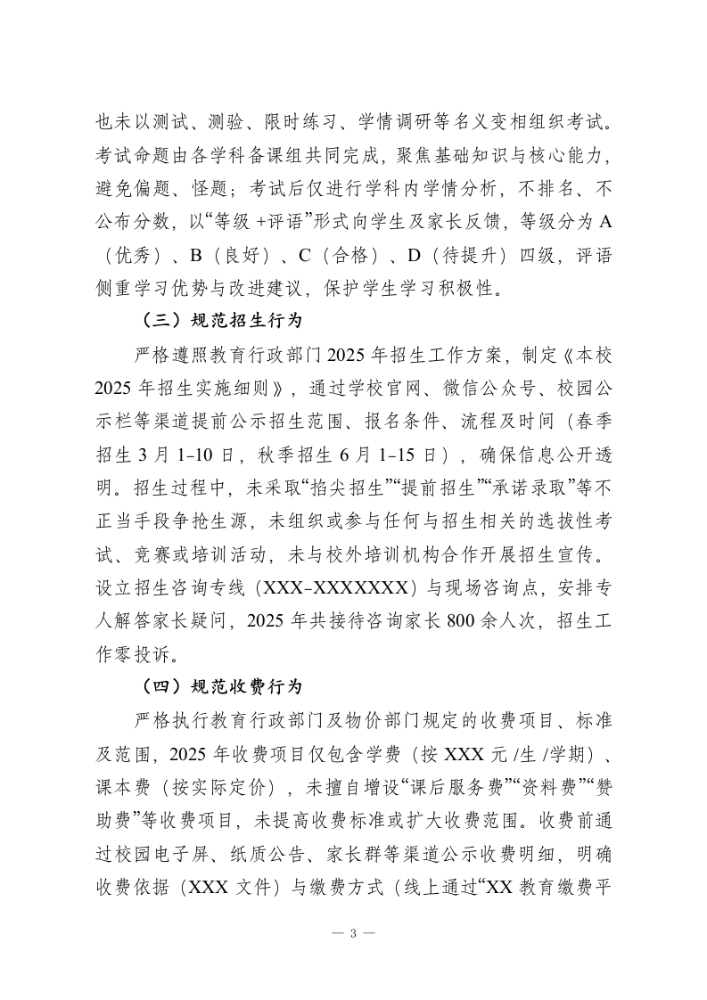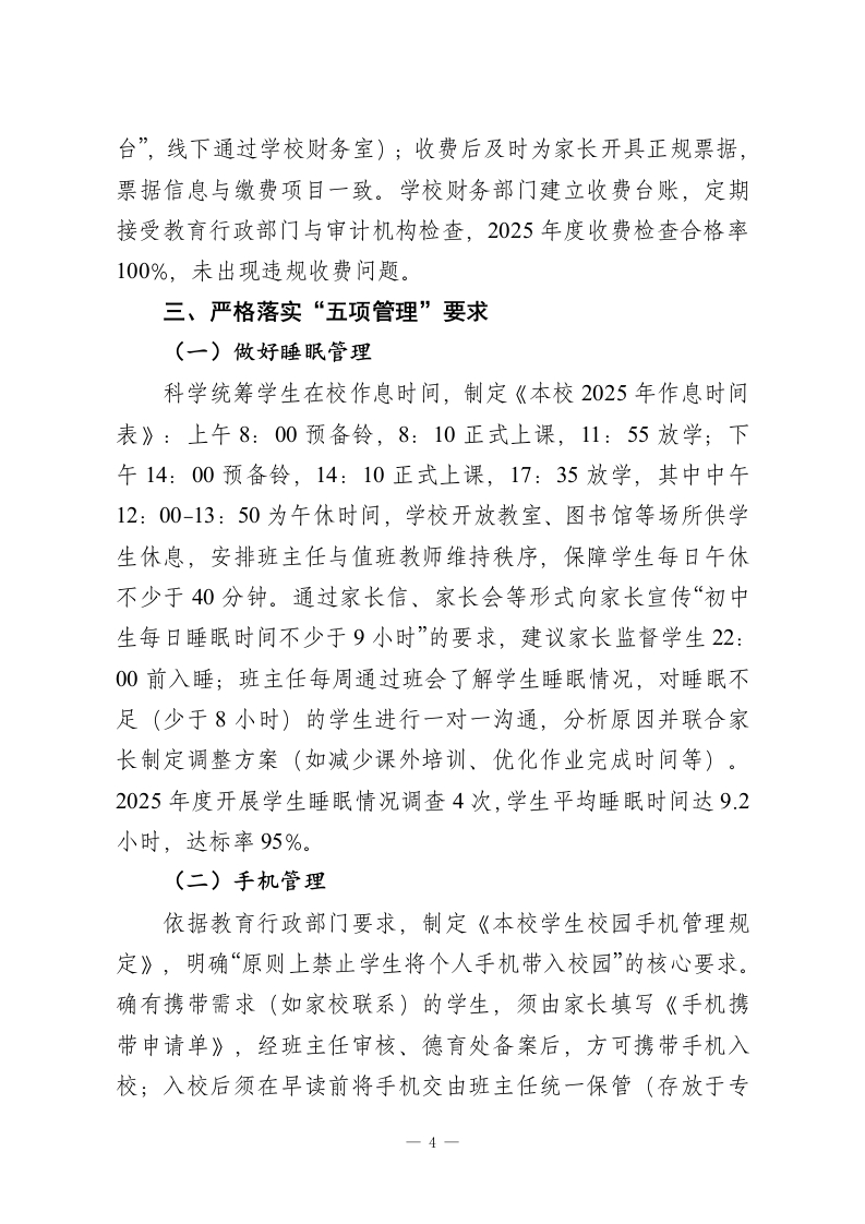 2025年度学校规范办学行为的自查报告一、严格落实国家“双减”政策(一)控制作业总量本校高度重视“双减”政策落地,成立以校领导为组长的作业管理专项小组,制定《本校作业统筹实施细则》《本校作业管理细则》,明确各学科作业分配比例与时长标准一一学生每日书面作业平均完成时间严格控制在90分钟内,其中语文、数学、英语等核心学科单次作业时长不超过25分钟,其它学科学科以课后巩固为主,原则上不布置书面作业。针对周未、寒暑假及法定节假日,实行“作业总量报备制”,由年级组提前一周审核各学科作业计划,确保假期每日书面作业时间不超过60分钟,且预留至少3天无作业时段,保障学生充足休息与自主安排时间。同时,通过家校群定期推送“作业时长调研问卷”,动态收集学生反馈,及时调整作业量,2025年度共开展12次调研,作业时长达标率保持100%。(二)提高作业质量将作业设计研讨纳入每周年段集体备课核心内容,每周安排1课时专门开展作业设计交流,要求各学科教师结合课程标准与学生学情,形成“基础巩固+能力提升+拓展实践”的分层作业体系。基础类作业面向全体学生,聚焦知识点掌握;提升类作业针对中等水平学生,侧重思维训练;拓展实践类作业(如语文名著阅读手抄报、数学生活应用题、英语情景对话录制等)供学有余力的学生自主选择,全年累计开发特色实践作业1561