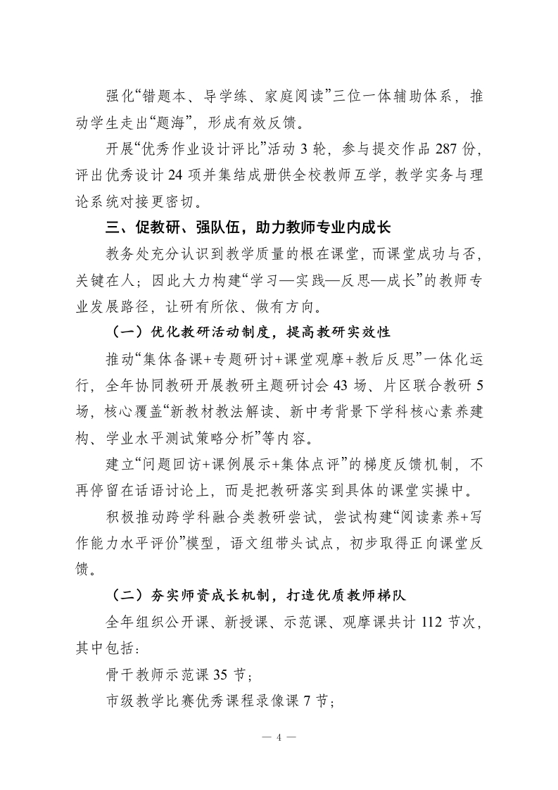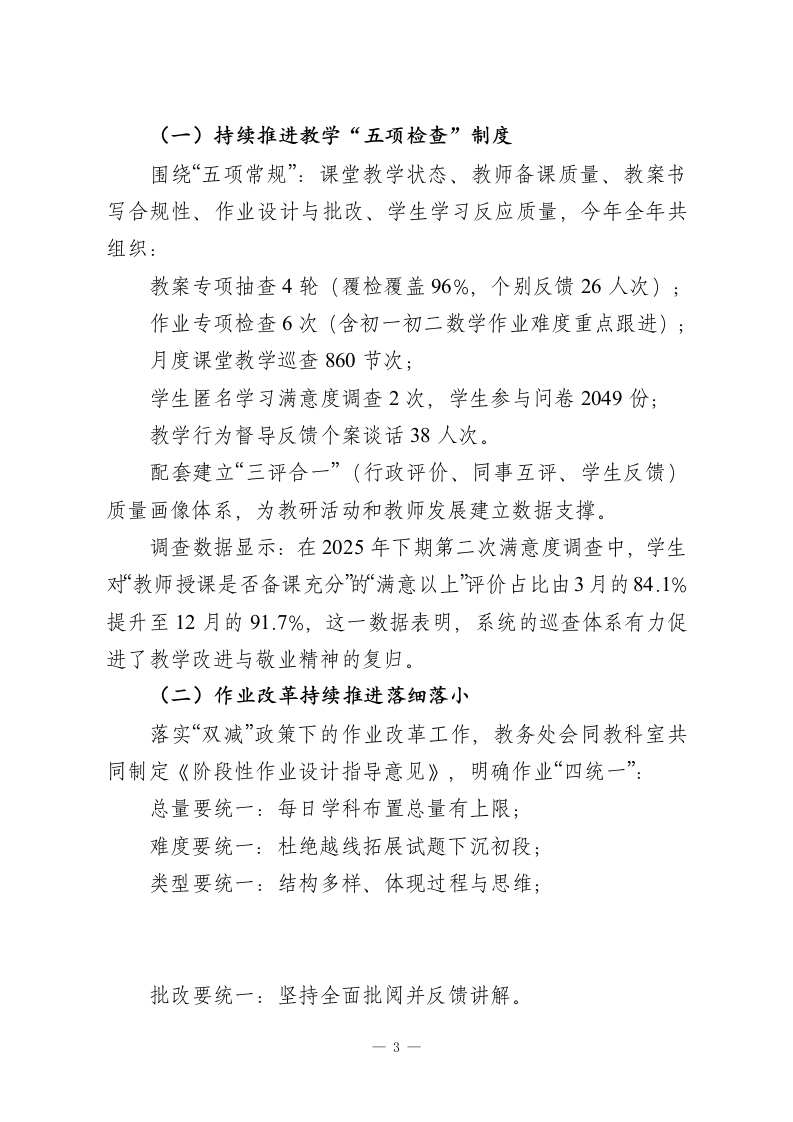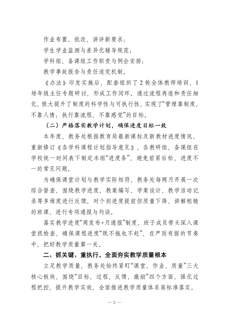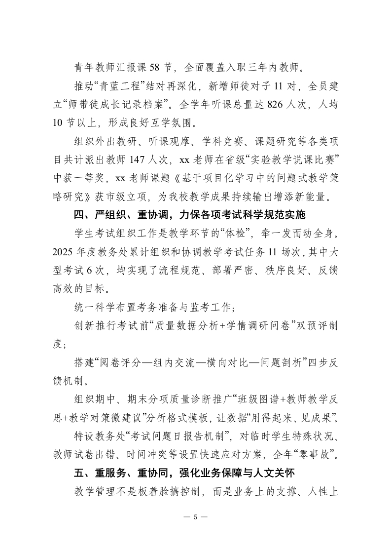 2025年度学校教务处工作汇报:沉心笃行保常规,守正创新提质量!2025年,是任务繁重的一年,是变化众多的一年,也是挑战与希望并存的一年。教务处在Xx校长的准确决策指引下,在赵Xx校务委员的悉心指导下,始终坚持“教学为中心、质量为生命,管理为保障、服务为核心”的理念,围绕“规范流程、优化过程、提升质量、发展教师”几条主线,做细做实日常工作,把握好节点进度,落实好改革任务,推进好创新举措,较好地完成了年初制定的各项工作目标任务。现将一年来的主要工作汇报如下:一、立机制、明规范,扎实筑牢常规管理之基常规工作是学校教学质量的“地基”,看似琐碎,实则决定学校的核心竞争力。教务处始终坚持“规范操作、落实责任、不走过场”的管理理念,把一项项常规工作做细、做实、做全,切实守好教学工作的基本盘。(一)完善规章制度,提升执行效能年初,教务处牵头组织教研组长、学科带头人、骨干教师等20余人组成《教学常规管理办法(2025年修订版)》修订小组,广泛征求一线教师意见,历时一个多月,全面修订各项教学流程、工作要求与职责清单。新管理办法内容覆盖:课程安排与调课制度;教案撰写格式与深度要求;课堂教学基本流程与教学监控要点;—1
