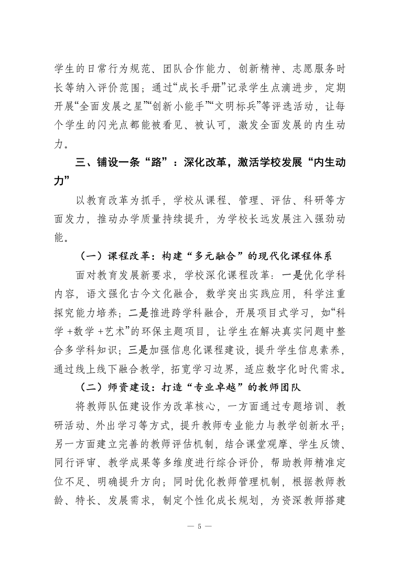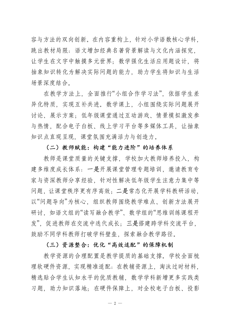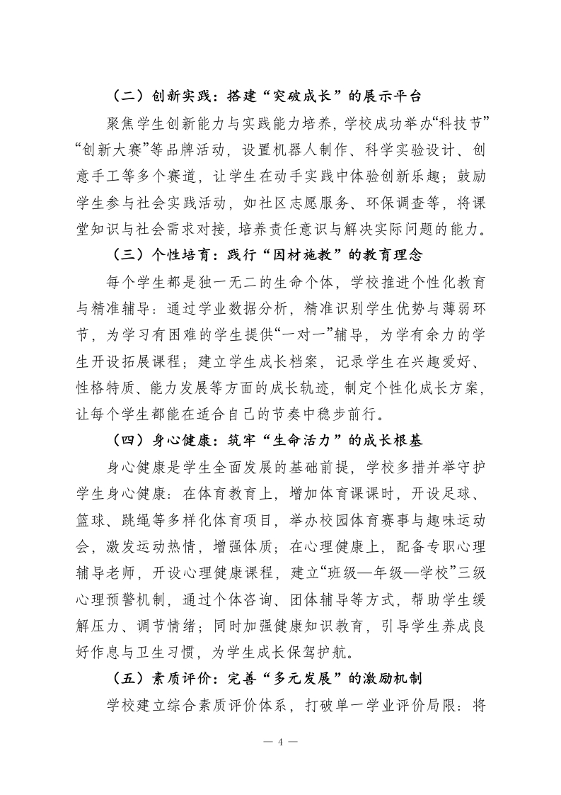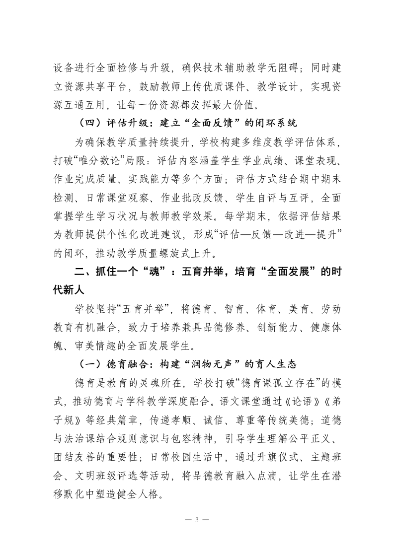 2025年度学校整体工作总结:以多元为壤,育万物生长岁律更迭,我们以深耕为犁;朝乾夕惕,我们以笃行作墨。最近电影《疯狂动物城》第2部正热映,影片中“差异成就独特,协作铸就强大”的成长内核,与我校“每个生命都能绽放独特光芒”的教育信仰高度契合。我们以此为精神指引,在多元包容的教育土壤中深耕不辍。回望一年历程,全校师生、家长以“和而不同”的初心,在教学提质、五育并举、改革创新等方面稳步前行,用共同的努力书写了学校高质量发展的新篇章。本年度,学校始终以“尊重差异、追求卓越、温暖共生”为教育核心,将“育一粒种子,心耕一片田”的理念转化为具体实践,在教学质量、学生培养、师资建设、管理服务等领域取得阶段性成效。这一切离不开全体教职工的恪尽职守、学生们的奋勇争先,更离不开家长与社会各界的鼎力支持。现将全年整体工作情况总结如下:一、守好一个“本”:聚焦课堂,筑牢教学质量“核心赛道”课堂是教育教学的核心阵地,唯有优化课堂生态、激活教学效能,才能为每个学生提供充足的成长动能。2025年,学校以课堂改革为突破口,从内容、方法、资源、评估四个维度精准发力,推动教学质量稳步提升。(一)课堂优化:打造“多元互动”的成长空间立足多元教育理念,我们打破传统课堂边界,推动教学内-1
