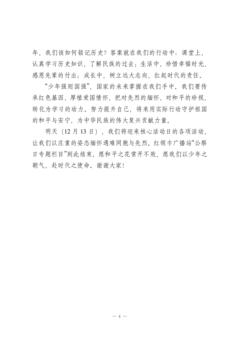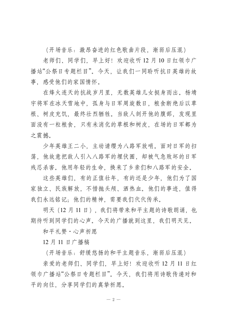 2025年国家公祭日广播特辑四篇历史回响·公祭溯源12月9日广播稿(开场音乐:低沉庄重的纯音乐,渐弱后压混)亲爱的老师们、同学们,早上好!欢迎收听12月9日红领巾广播站“公祭日专题栏目”。今天,我们一同回望那段刻骨铭心的历史,探寻国家公祭日的由来。1937年12月13日,侵华日军攻占南京,制造了长达六周的南京大屠杀惨案。30多万手无寸铁的平民和放下武器的士兵,惨遭杀戮。这是中华民族永远的伤痛,也是人类文明史上的黑暗一页。为了铭记这段苦难历史,缅怀遇难同胞,2014年2月27日,十二届全国人大常委会第七次会议表决通过决议,将每年的12月13日设立为南京大屠杀死难者国家公祭日。设立公祭日,不是为了延续仇恨,而是为了以史为鉴、珍爱和平;不是为了沉溺伤痛,而是为了凝聚力量、奋勇前行。明天(12月10日),我们将继续分享抗日英雄的感人故事。如果你有搜集到的历史史料或感悟,欢迎投稿给广播站,让我们一起传递对历史的敬畏与对和平的祈愿。今天的广播到此结束,我们明天再见。英雄事迹·薪火相传12月10日广播稿一1
