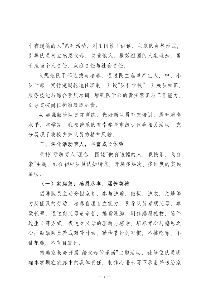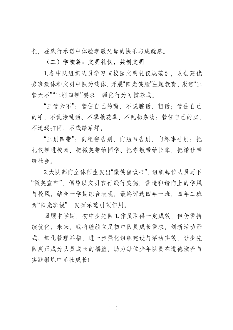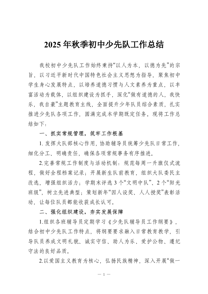 2025年秋季初中少先队工作总结我校初中少先队工作始终秉持“以人为本,以德为先”的宗旨,以习近平新时代中国特色社会主义思想为指导,聚焦初中学生身心发展特点,以培养道德习惯与人文素养为重点,以丰富活动为载体,以组织建设为抓手,深化“做有道德的人,我快乐,我自豪”主题教育主线,全面提升少年队员综合素质,扎实推进少先队各项工作,圆满完成本学期既定任务。现将工作总结如下:一、抓实常规管理,筑牢工作根基1.发挥大队部核心作用,协助辅导员统筹少先队日常工作,细化分工、明确责任,确保各项常规事务有序推进。2.完善常规工作制度与活动机制:规范每周一升旗仪式流程,做好全程档案记录;开展新生队前教育,组织大队委民主改选,增强组织活力;学期未评选3个“文明中队”、2个“阳光班级”,树立先进典型;策划新年“因人设奖、人人授奖”表彰活动,让每位队员都能收获成长认可。二、强化组织建设,夯实发展保障1.组织各班辅导员定期学习《少先队辅导员工作纲要》,结合初中少先队工作特点,将纲要要求融入日常教育教学,引导队员养成文明礼貌、诚实守信、助人为乐、爱护公物、遵纪守法的良好品质。2.以爱国主义教育为核心,弘扬民族精神,深入开展“做一一1