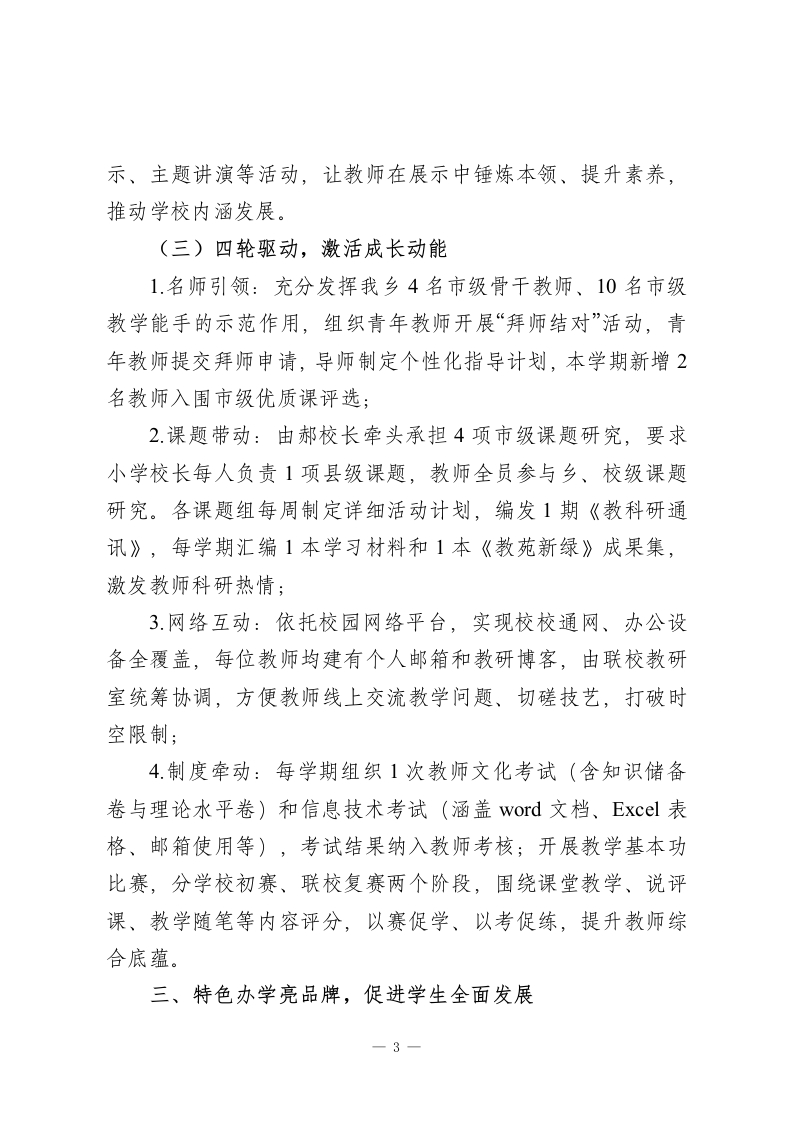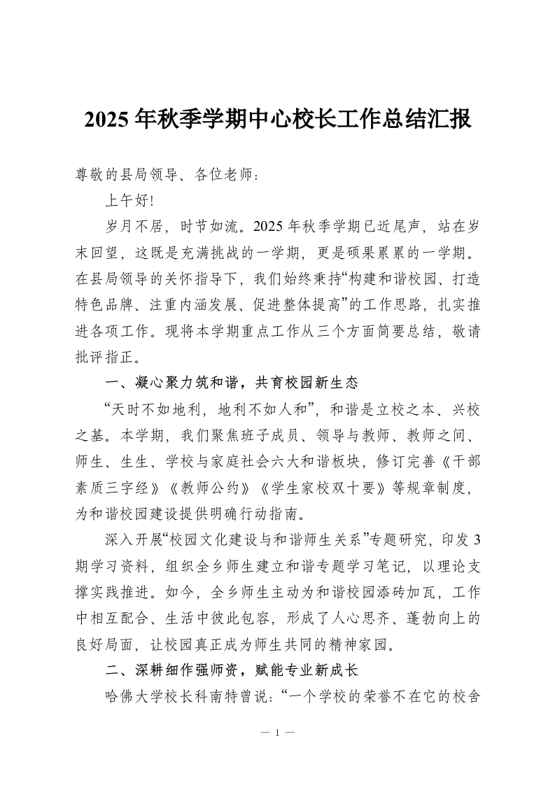 2025年秋季学期中心校长工作总结汇报尊敬的县局领导、各位老师:上午好!岁月不居,时节如流。2025年秋季学期已近尾声,站在岁末回望,这既是充满挑战的一学期,更是硕果累累的一学期。在县局领导的关怀指导下,我们始终秉持“构建和谐校园、打造特色品牌、注重内涵发展、促进整体提高”的工作思路,扎实推进各项工作。现将本学期重点工作从三个方面简要总结,敬请批评指正。一、凝心聚力筑和谐,共育校园新生态“天时不如地利,地利不如人和”,和谐是立校之本、兴校之基。本学期,我们聚焦班子成员、领导与教师、教师之间、师生、生生、学校与家庭社会六大和谐板块,修订完善《干部素质三字经》《教师公约》《学生家校双十要》等规章制度,为和谐校园建设提供明确行动指南。深入开展“校园文化建设与和谐师生关系”专题研究,印发3期学习资料,组织全乡师生建立和谐专题学习笔记,以理论支撑实践推进。如今,全乡师生主动为和谐校园添砖加瓦,工作中相互配合、生活中彼此包容,形成了人心思齐、蓬勃向上的良好局面,让校园真正成为师生共同的精神家园。二、深耕细作强师资,赋能专业新成长哈佛大学校长科南特曾说:“一个学校的荣誉不在它的校舍1