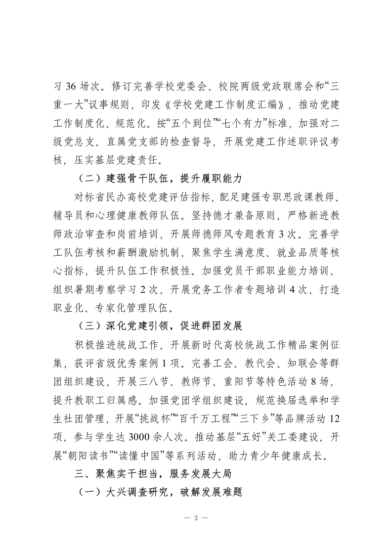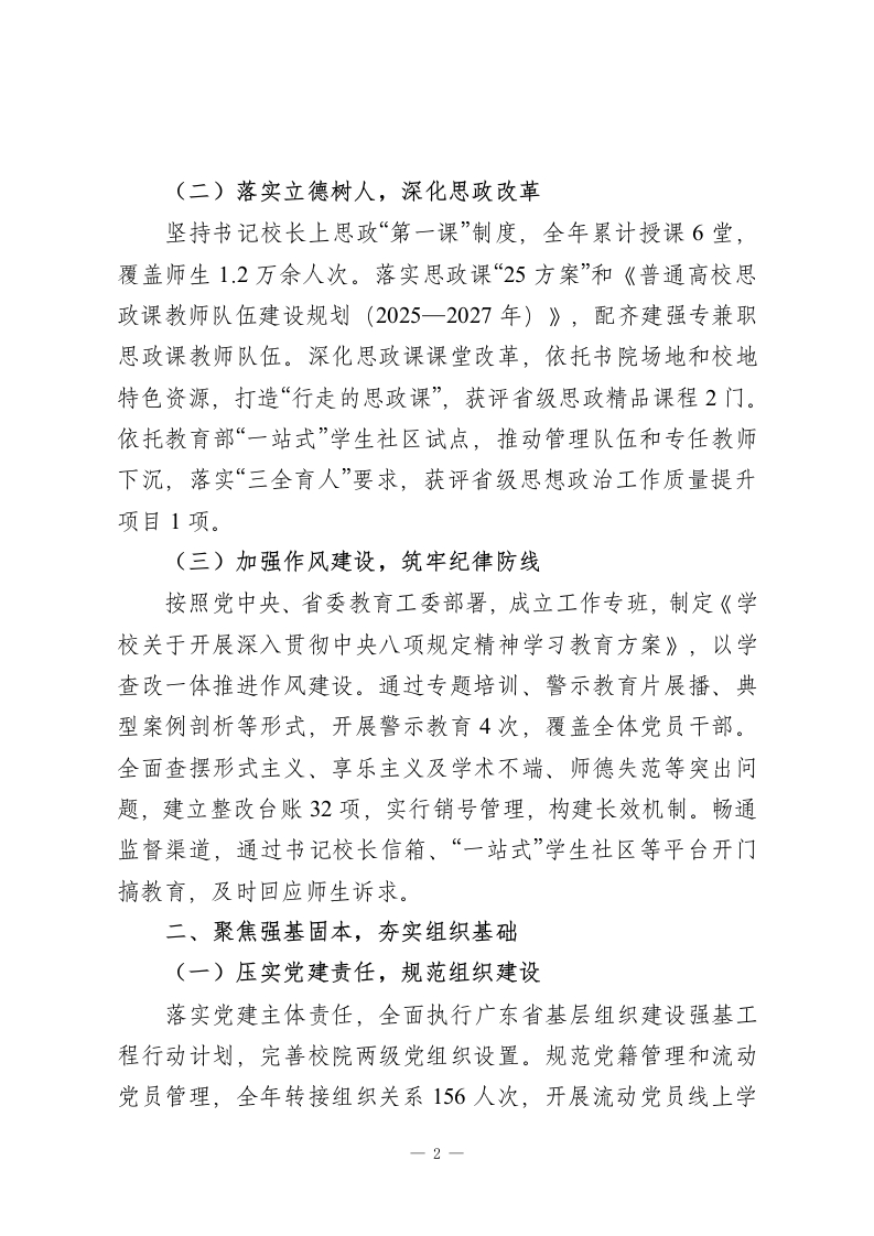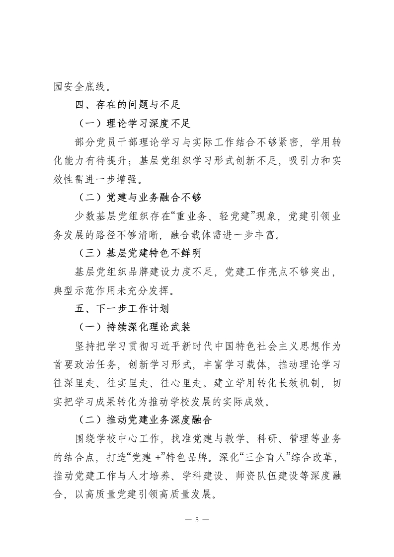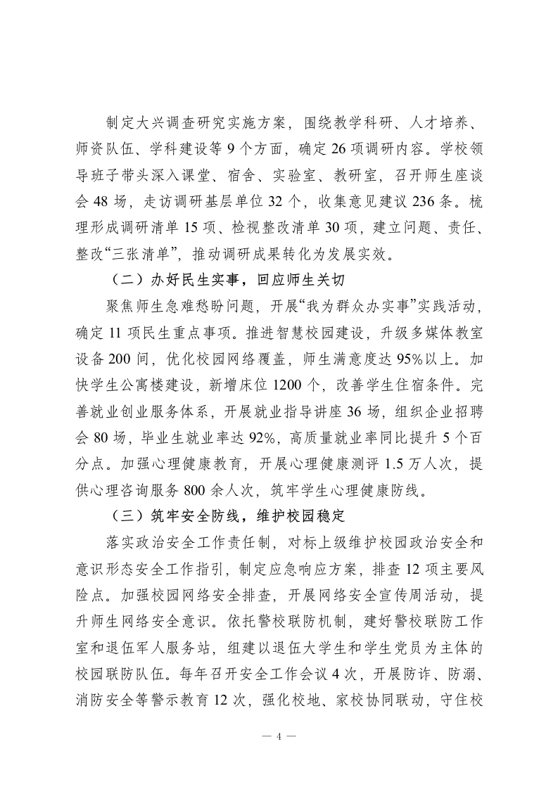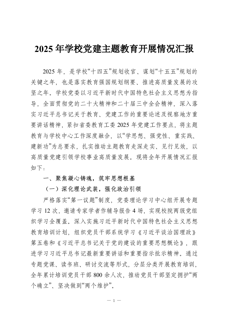 2025年学校党建主题教育开展情况汇报2025年,是学校“十四五”规划收官、谋划“十五五”规划的关键之年,也是落实教育强国规划纲要、推进高质量发展的攻坚之年。学校党委以习近平新时代中国特色社会主义思想为指导,全面贯彻党的二十大精神和二十届三中全会精神,深入落实习近平总书记关于教育、党建工作的重要论述及视察地方重要讲话精神,紧扣省委教育工委2025年党建工作要点,将主题教育与学校中心工作深度融合,以“学思想、强党性、重实践、建新功”为总要求,扎实推动主题教育走深走实、见行见效,以高质量党建引领学校事业高质量发展。现将全年开展情况汇报如下:一、聚焦凝心铸魂,筑牢思想根基(一)深化理论武装,强化政治引领严格落实“第一议题”制度,党委理论学习中心组开展专题学习12次,邀请专家学者作辅导报告4场,实现校院两级党组织学习全覆盖。深入实施习近平新时代中国特色社会主义思想教育培训计划,组织党员干部系统学习《习近平谈治国理政》第五卷和《习近平总书记关于党的建设的重要思想概论》,跟进学习习近平总书记最新重要讲话和重要指示批示精神。通过专题党课、读书班、研讨交流等形式,分层分类开展教育培训,全年累计培训党员干部800余人次,推动党员干部坚定拥护“两个确立”、坚决做到“两个维护”。1
