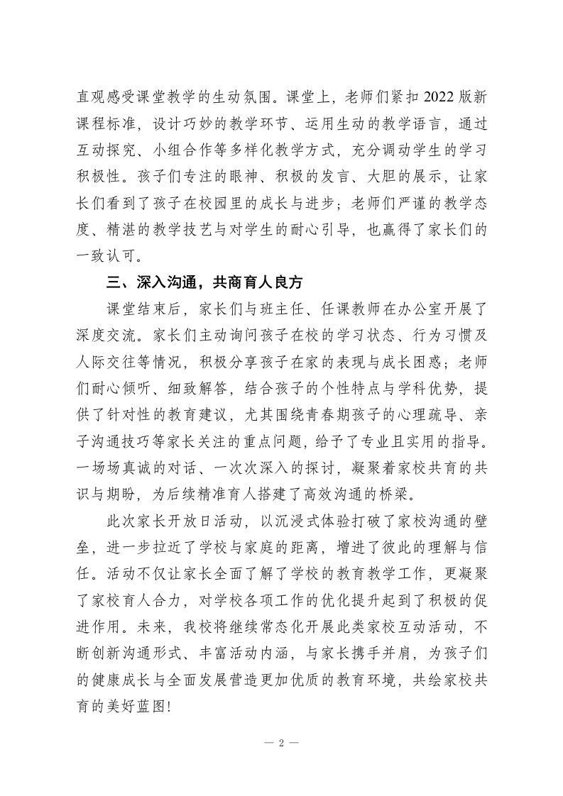 2025年学校家长开放日活动总结:家校携手话成长,同心共育向未来借冬日暖阳,赴一场爱与信任的邀约:以教育为桥,赴一次陪伴与成长的见证。为进一步深化家校协同育人机制,凝聚学校、家庭、社会三方教育合力,助力孩子全面发展,提升教育教学质量,我校于2025年12月12日成功举办家长开放日活动。活动以“关注教育、参与管理、促进成长”为核心,让家长沉浸式走进校园、深入课堂,全方位了解学校办学理念与孩子在校状态,为家校共育筑牢坚实基础。一、漫步校园,感受文化底蕴活动伊始,带队教师向家长们详细介绍了学校的发展历程、办学理念、校风校训及校徽校歌等核心文化元素,让家长对学校有了更系统、深刻的认知,进一步增强了对学校的认同感与信任感。在校园小引导员的热情带领下,家长们先后参观了校园文化长廊、功能教室(实验室、图书馆、艺术教室等)及各类社团活动现场。小解说员们细心讲解、从容展示,从社团活动成果到功能教室的使用情况,全方位展现了学校的办学特色与发展活力。家长们不时驻足交流,对学校丰富的育人资源与浓厚的校园文化氛围给予高度评价,部分家长还主动为学校发展建言献策,积极参与到学校管理中来。二、走进课堂,见证教学风采家长们走进孩子的班级,与孩子们同堂学习、同步思考,-1