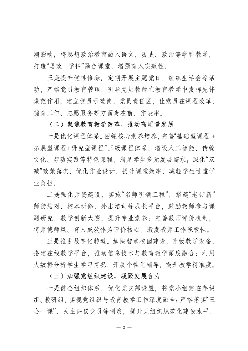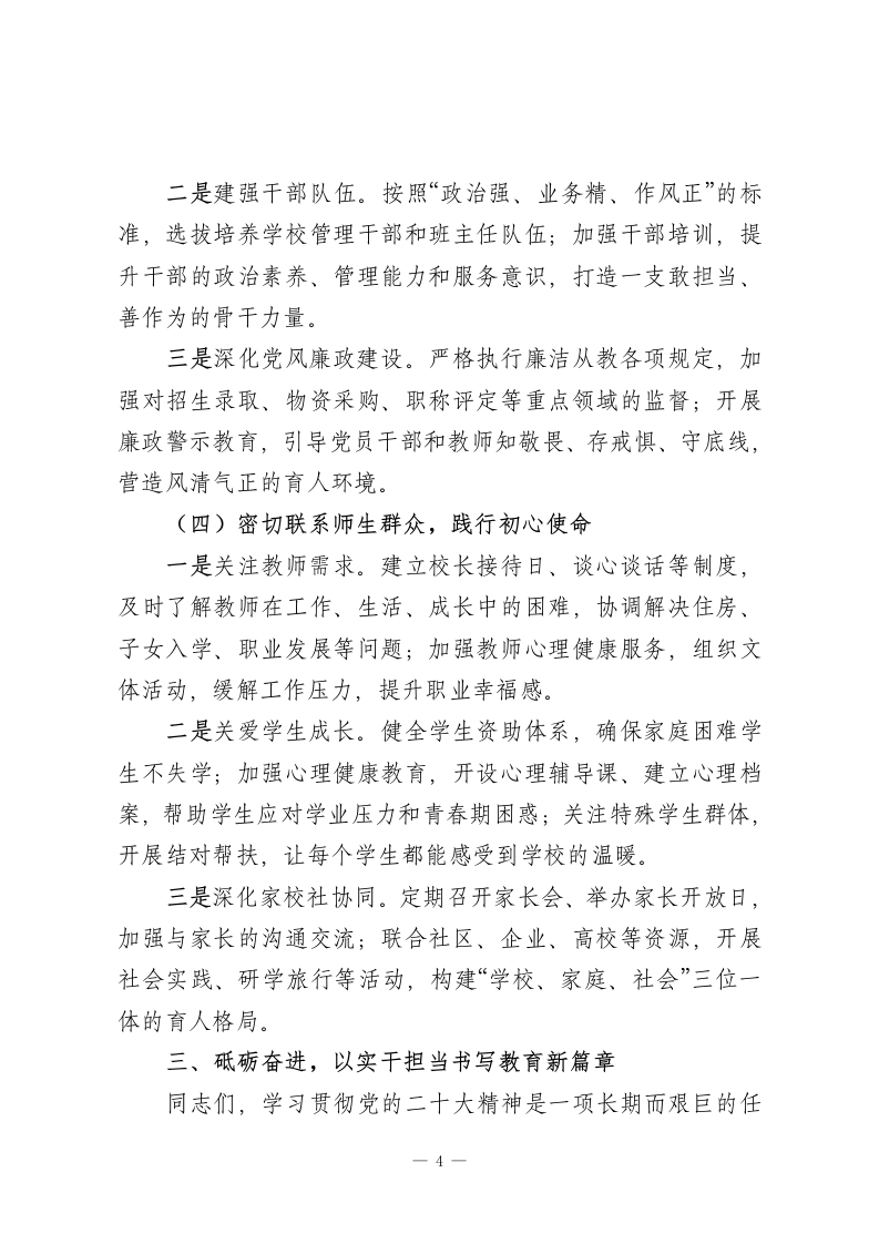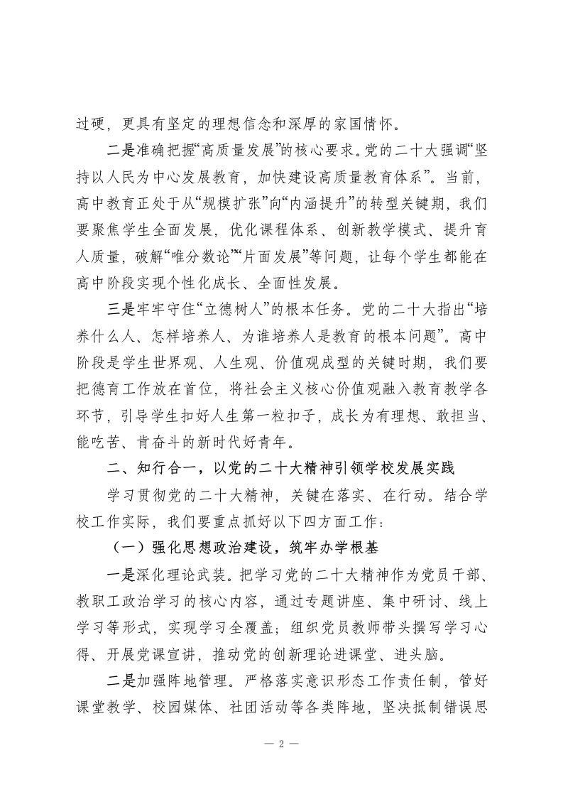 2025年主题教育专题党课:深学笃行党的二十大精神为高中教育高质量发展凝心铸魂同志们:大家好!今天我们召开主题教育专题党课,核心是深入学习贯彻党的二十大及二十届历次全会精神,把思想和行动统一到党中央决策部署上来,结合高中教育办学实际,探讨如何以党建引领育人事业高质量发展,为培养担当民族复兴大任的时代新人筑牢根基。作为学校校长、党支部带头人,我将围绕“学思想、强党性、重实践、建新功”的总要求,与大家交流三点认识和体会。一、深学细悟,把握党的二十大精神核心要义党的二十大是在全党全国各族人民迈上全面建设社会主义现代化国家新征程、向第二个百年奋斗目标进军的关键时刻召开的重要会议。其精神内涵丰富、思想深邃,对教育工作具有极强的指导意义。一是深刻领悟“为党育人、为国育才”的根本使命。党的二十大明确提出“教育、科技、人才是全面建设社会主义现代化国家的基础性、战略性支撑”,把教育摆在优先发展的战略地位。作为高中教育工作者,我们肩负着为高等教育输送优质生源、为社会培养合格公民的双重责任,必须始终牢记办学初心,把思想政治引领贯穿教育教学全过程,确保培养的学生不仅学业1