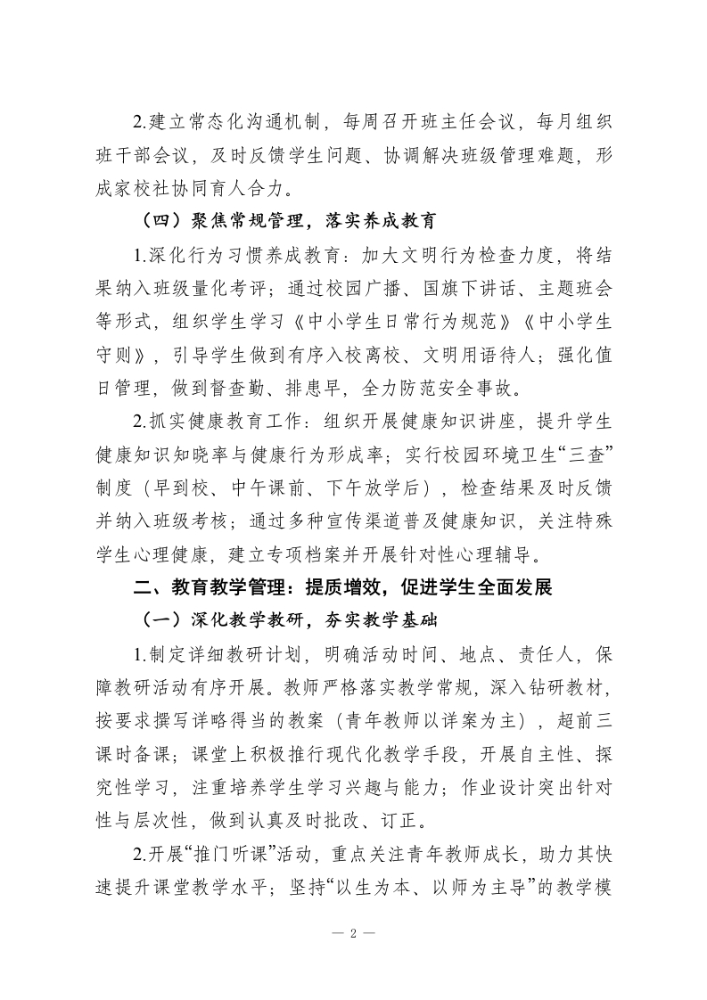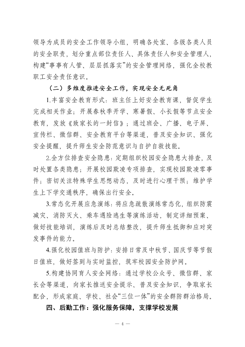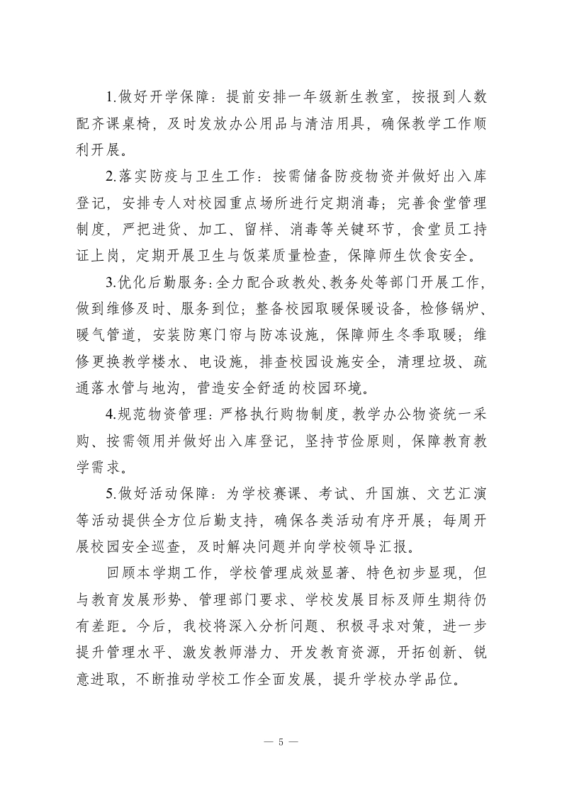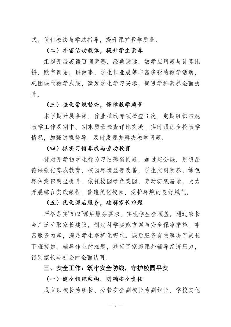 2025秋季第一学期学校工作总结本学期,我校秉持“追求和谐,享受快乐”的办学理念,弘扬“团结、务实、创新”的学校精神,稳步推进教育教学高质量发展,各项工作在全体教职工的共同努力下取得显著成效。现将本学期工作总结如下:一、德育工作:筑牢育人根基,培育时代新人(一)完善制度体系,凝聚德育合力结合学校发展实际,进一步细化《班级流动红旗评比细则》《班主任量化评价方案》等德育管理制度,推动德育工作规范化、常态化。建立值周领导、值周教师、值周生“三位一体”检查机制,对学生日常行为、班级常规管理开展每日检查、每周考核、每月汇总奖评,确保德育要求落到实处。(二)强化队伍建设,提升育人水平1.修订完善《班级量化管理细则》《班主任量化评价方案》,将教学实效、常规落实、工作纪律等纳入考评,激励班主任履职尽责。2加强理论学习与业务培训,定期组织班主任、值日教师、值周学生开展工作培训,提升德育管理能力;组织教师积极参与上级各类德育活动与竞赛,拓宽育人思路。(三)狠抓班级管理,深化德育实效1.规范班会课管理,要求班主任精心设计班会内容、创新活动形式,做好班会记录并及时上交德育处,让班会课成为德育教育的重要阵地。1