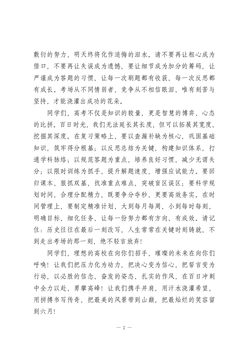 2026年高考百日誓师大会校长发言:百日砺剑破苍穹,六月扬眉铸辉煌尊敬的老师们、亲爱的同学们:大家好!2026年高考的战鼓已轰然擂响,时光的洪流正裹挟着梦想与拼搏,向我们奔腾而来!今天,我们齐聚于此,举行高考百日冲刺誓师大会,就是要吹响圆青春梦想的集结号,扬起展人生宏图的凌云志,擂响攻备考难关的冲锋鼓,唱响夺六月辉煌的必胜曲!首先,请允许我向日夜操劳、潜心育人的全体高三教师,致以最崇高的敬意和最衷心的感谢!向焚膏继晷、奋力追梦的全体高三同学,送上最真挚的祝福和最坚定的期许!同学们,三载寒窗磨一剑,百日冲刺试锋芒。高中三年,你们怀揣“直挂云帆济沧海”的豪情,秉持“千磨万击还坚劲”的信念,在“成人成才”的校园里,踏过书山崎岖,渡过学海浩瀚。你们曾在晨曦中诵读,在星光下演算,一起熬过迷茫的深夜,一起分享进步的喜悦。如今,距离决战仅剩一百天,这是黎明前的最后坚守,是登顶前的最后攀登,是亮剑前的最后淬炼!此刻,逃避无用,退缩无功,唯有硬着头皮向前冲,咬紧牙关不松劲,把每一分每一秒都化作叩响理想之门的力量。同学们,从今天起,让我们以“时不我待”的紧迫感,把握每一天、珍惜每一刻。今天放弃的知识点,明天可能成为失分的遗憾;今天回避的难题,明天依然会成为前进的阻碍;今天1