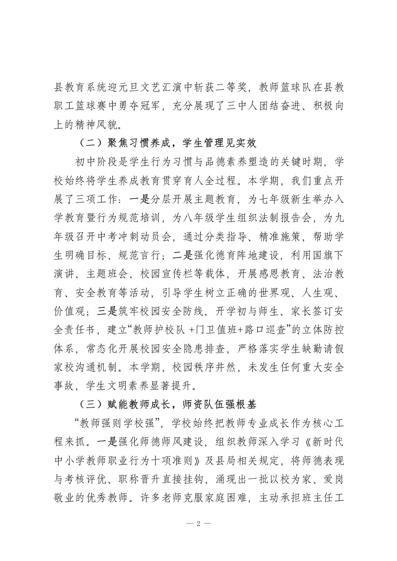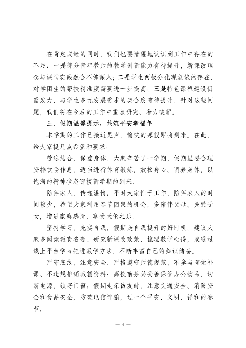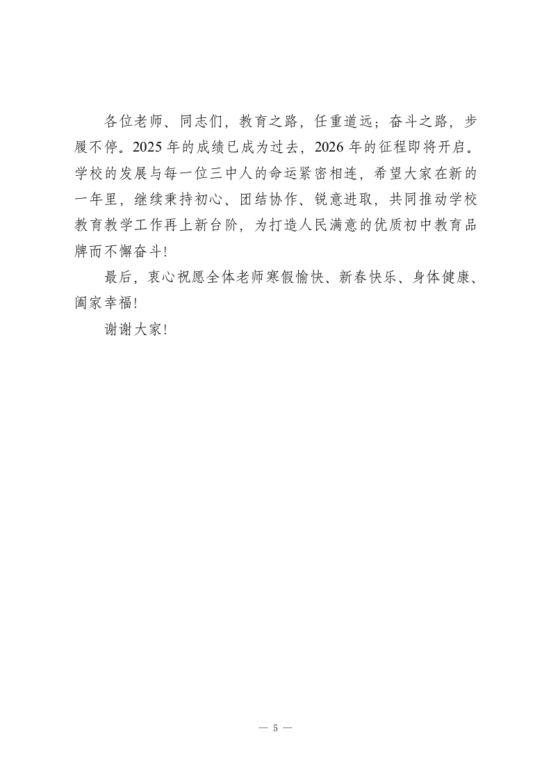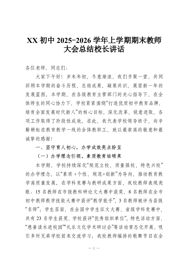 XX初中2025-2026学年上学期期末教师大会总结校长讲话各位老师、同志们:大家下午好!岁末年初,冬意渐浓,我们齐聚一堂,共同回顾本学期的奋斗历程,总结成果、凝聚共识,展望新一年的发展蓝图。本学期,在各级教育主管部门的关心指导下,在全体师生的同心协力下,学校紧紧围绕“打造优质初中教育品牌,培育全面发展时代新人”的核心目标,深化改革、锐意进取,各项工作取得了阶段性成效。在此,我代表学校领导班子,向辛勤耕耘在教育教学一线的全体教职工,致以最崇高的敬意和最诚挚的感谢!一、坚守育人初心,办学成效亮点纷呈(一)办学理念引领,素质教育结硕果本学期,学校持续深化“规范立校、质量强校、特色兴校”的办学理念,以“素质+个性、规范+创新”为导向,推动教育教学高质量发展。在学科竞赛与教研成果方面,我校教师表现亮眼:15名教师在市级教科研论文大赛中获奖,8名教师在全市初中教师教学技能大赛中获评“教学能手”,3名教师被评为县级“名师”;学生层面,在全国中学生征文大赛、省级学科竞赛中,共有23名学生获奖,学校获评“优秀组织单位”。特色活动方面,“慈善读本进校园“礼乐文化学术研讨会”等活动常态化开展,吸引多所兄弟学校前来交流学习;我校教师编排的歌舞节目在全1