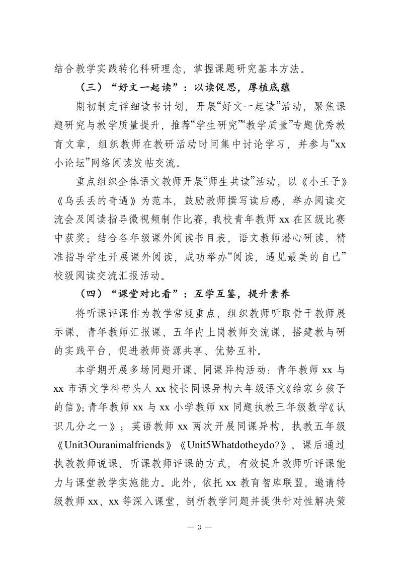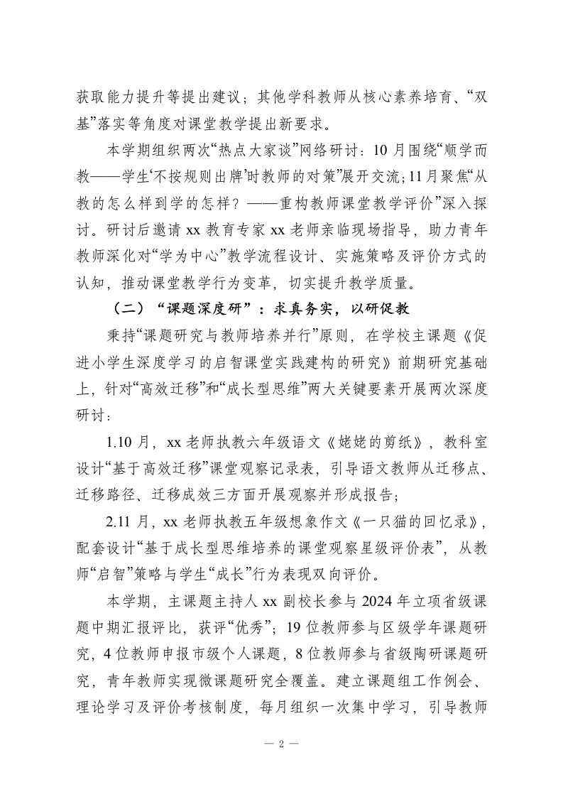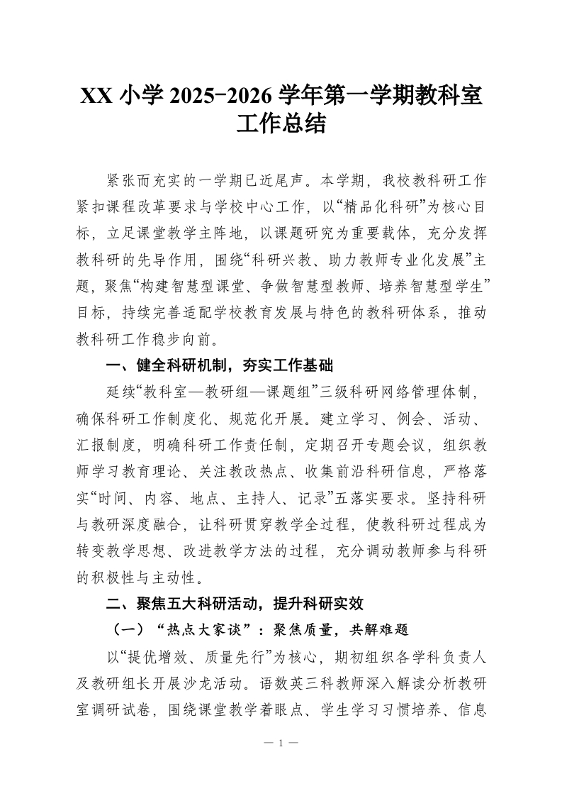 XX小学2025-2026学年第一学期教科室工作总结紧张而充实的一学期已近尾声。本学期,我校教科研工作紧扣课程改革要求与学校中心工作,以“精品化科研”为核心目标,立足课堂教学主阵地,以课题研究为重要载体,充分发挥教科研的先导作用,围绕“科研兴教、助力教师专业化发展”主题,聚焦“构建智慧型课堂、争做智慧型教师、培养智慧型学生”目标,持续完善适配学校教育发展与特色的教科研体系,推动教科研工作稳步向前。一、健全科研机制,夯实工作基础延续“教科室一教研组一课题组”三级科研网络管理体制,确保科研工作制度化、规范化开展。建立学习、例会、活动、汇报制度,明确科研工作责任制,定期召开专题会议,组织教师学习教育理论、关注教改热点、收集前沿科研信息,严格落实“时间、内容、地点、主持人、记录”五落实要求。坚持科研与教研深度融合,让科研贯穿教学全过程,使教科研过程成为转变教学思想、改进教学方法的过程,充分调动教师参与科研的积极性与主动性。二、聚焦五大科研活动,提升科研实效(一)“热点大家谈”:聚焦质量,共解难题以“提优增效、质量先行”为核心,期初组织各学科负责人及教研组长开展沙龙活动。语数英三科教师深入解读分析教研室调研试卷,围绕课堂教学着眼点、学生学习习惯培养、信息-1