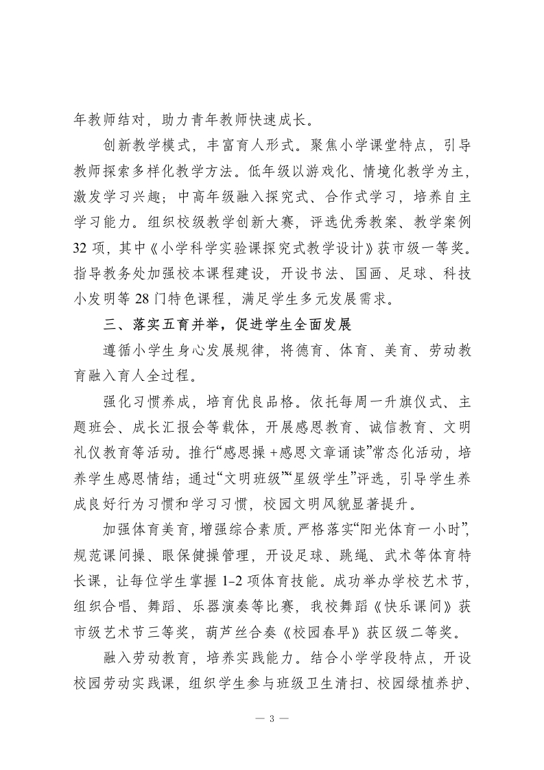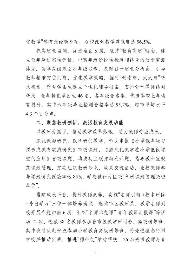 XX小学2025年度教学校长述职报告尊敬的各位领导、老师们:大家好!2025年,在市教育局的正确领导下,在校长的悉心指导与全体教职工的全力支持下,我始终坚守“立德树人”初心,聚焦小学教育教学核心任务,统筹推进教学管理、教研改革、队伍建设等各项工作,既圆满完成了年度目标,也在实践中积累了宝贵经验。现将本年度履职情况汇报如下,恳请各位批评指正。一、深耕教学管理,筑牢育人质量根基教学是学校工作的核心,规范有序的管理是质量提升的保障。完善制度体系,优化教学运行。协助校长修订《小学教学常规管理细则》《课堂教学评价标准》等5项制度,结合小学学段特点,细化备课、上课、作业批改、课后服务等关键环节要求,广泛征求一线教师意见,确保制度科学实用。全年组织4次教学专项检查,针对作业设计、教案撰写等问题整改18项,教学秩序持续规范。强化过程监管,提升课堂效能。建立“校长室+教务处+教研组”三级巡查机制,每天联合行政值班人员对常态课、早读、课间操、眼保健操等进行全覆盖巡查,及时通报问题、督促整改。我个人深入各年级听课72节,覆盖所有学科,重点关注低年级习惯培养、中高年级课堂互动,总结推广“情境教学“游戏1