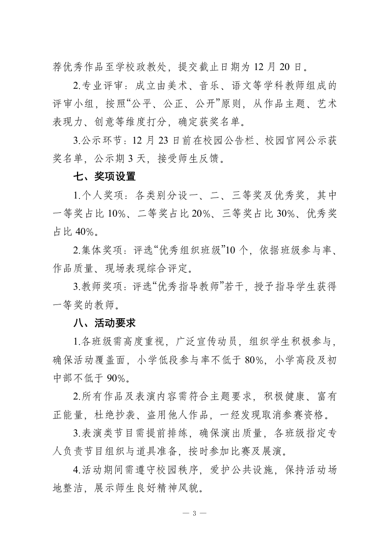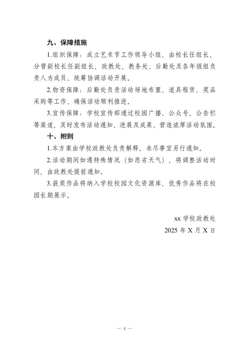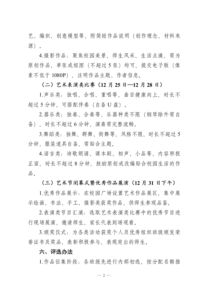 XX校园艺术节活动方案一、活动主题艺彩绘校园,童心向未来二、活动宗旨以本学期校园文化建设为核心,践行“五育并举”教育理念,丰富师生校园文化生活,搭建展示艺术才华的平台。通过多元艺术活动,激发师生艺术创作热情,提升审美素养与人文底蕴,营造积极向上、格调高雅的校园氛围,助力学生全面发展。三、活动时间2025年12月1日一2025年12月31日(贯穿秋季学期末,分阶段开展各类活动)四、参与对象全校师生(分小学低段、小学高段、初中部三个组别开展评比)五、活动内容与安排(一)艺术作品类征集(12月1日一12月20日)1.绘画作品:题材不限(校园生活、传统文化、未来畅想等),形式包括水彩画、素描、漫画、国画等,尺寸不小于A4纸,需注明作者姓名、班级、作品名称。2.书法作品:软笔、硬笔均可,内容为经典古诗文、校园正能量标语等,软笔尺寸不超过四尺整纸,硬笔使用专用书法纸,需规范落款。3.手工作品:利用环保材料、废旧物品制作,如剪纸、陶一1