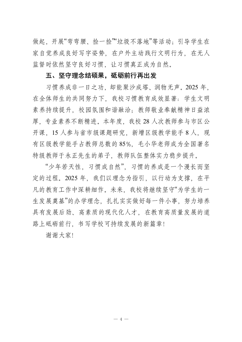 XX校长论坛发言:坚守办学理念,赋能可持续发展尊敬的各位领导、各位同仁:大家好!先进的办学思想是治校之本,一所学校的崛起,离不开校长科学的教育理念与清晰的发展思路。作为校长,应树立现代教育观、管理观、教师观、学生观和质量观,成为理念的倡导者、改革的组织者、发展的引领者。2025年,我与领导班子一道,持续加强自身建设,深入学习《深化新时代基础教育课程改革总体方案》《普通中小学管理基本规范》等文件精神,结合学校发展实际,进一步凝聚共识,坚定践行“为学生的一生发展奠基”的办学理念。下面,我从五个方面分享我校的实践与探索:一、养成好习惯,奠基好人生爱因斯坦曾说,忘记学校所学后剩下的才是教育,而这份“剩下的”核心,正是在学校养成的习惯。叶圣陶先生也强调“教育就是培养习惯”,可见习惯对学生终身发展的重要性。2025年,我校始终将习惯培养作为核心教育目标,持之以恒、常抓不懈,推动学生知、情、意、行和谐统一。1.教师示范引领:出台《教师行为规范“十不准”》,从仪表、言行、沟通方式等方面明确要求,倡导教师放下身段与学生平等交流。推行教师课间值班制,每层楼安排专人指导学生课间活动;学生集会时全体教师全程参与,广播操做到整齐划一,1