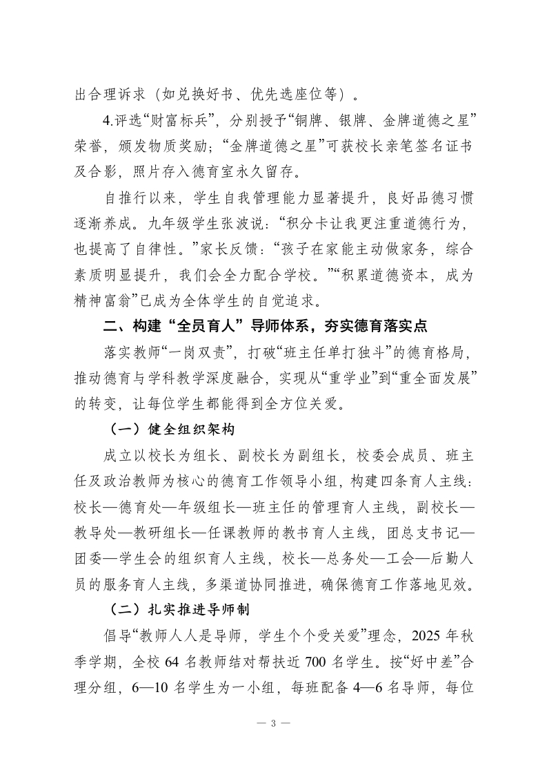 XX校长论坛演讲:三维发力筑德育,立德树人谱新篇尊敬的各位领导、各位同仁:非常荣幸站在“xx县2025年校长论坛”的讲坛上,与大家共同探讨德育工作的创新路径。本次论坛既是学习贯彻县委教育工作会议精神的重要契机,也是落实学校发展联盟改革理念的具体实践,对推动我县教育理念更新、实现跨越式发展意义深远。随着我校课改的深入推进,德育工作也面临着“从制约性转向自主性”的转型需求。我们始终致力于构建让学生自由、自然、自主、自觉快乐成长的育人环境,回归教育本源。2025年秋季学期,我校在“书香润心,翰墨树人”特色德育模式的基础上,进一步创新实践,打造“梦想成长基金”德育模式,构建“全员育人”德育体系,取得了阶段性成效。现将具体做法与思考汇报如下,恳请各位批评指正。一、创新“学生成长梦想基金”模式,抓牢德育支撑点为实现对学生思想道德行为的全面动态评价,唤醒道德意识、培养良好品德习惯,我校创新推出“学生成长梦想基金”德育管理模式,将无形的道德表现转化为有形的成长记录,激发学生自我提升的内生动力。(一)健全运行机制与机构设置成立“学生成长梦想基金”管理委员会,由校长担任顾问,分管德育副校长任理事长,中层干部及全体班主任为成员。在-1-