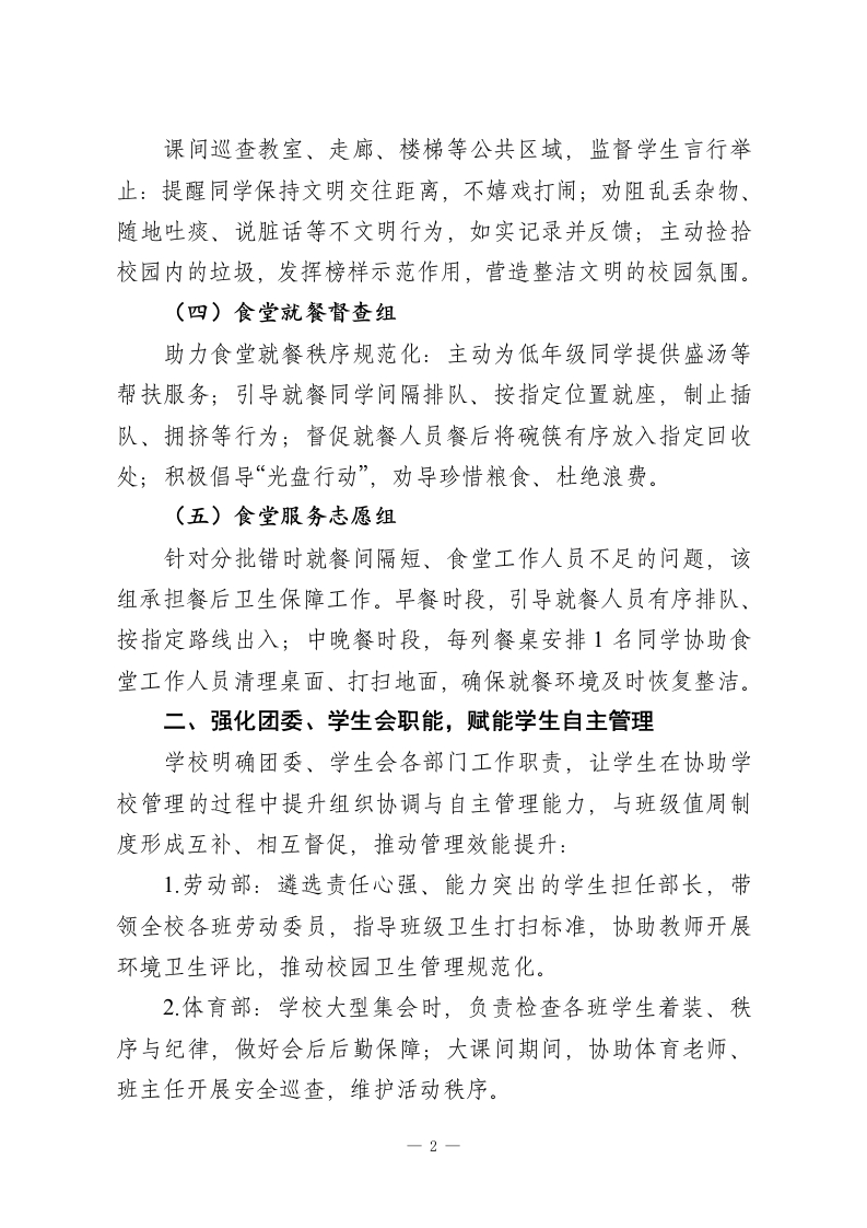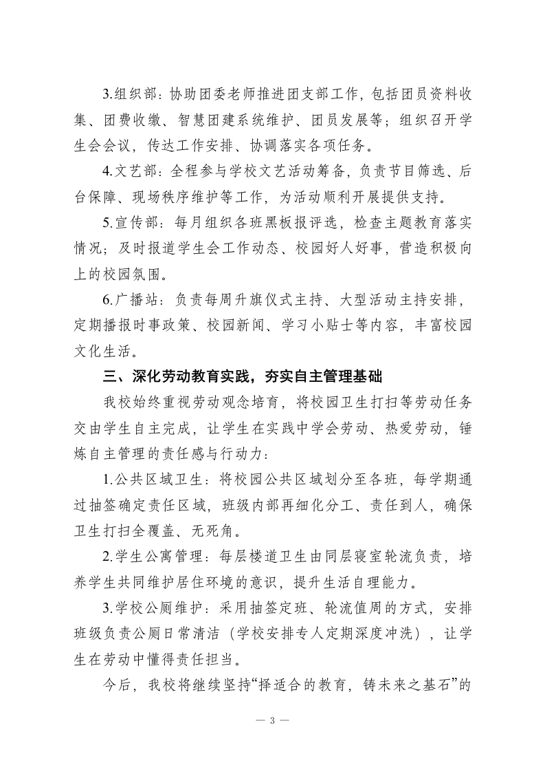 XX学校2025年秋季第一学期培养学生自主管理能力经验总结我校始终秉承“以人为本、多元发展”的办学思想,深耕素质教育,在夯实学生学科素养的同时,聚焦劳动观念、服务意识与自主管理能力等核心素养培育,通过制度化设计、多元化实践,让学生自主管理落地生根、成效凸显,助力学生成长为“爱学习、爱劳动、善管理、乐服务”的新时代中学生。一、推行班级值周制度,构建“人人参与”管理格局2025年,我校持续深化班级值周制度,在值周领导与教师的专业指导下,让学生全面参与学校日常管理,践行“人人都是管理者”的育人理念。团委牵头设立五大专项管理组,明确职责、细化分工,保障学校各项工作有序运转:(一)校门礼仪组统一着装、佩戴礼仪标志,以礼貌姿态迎接师生入校。主要负责提醒学生规范佩戴校牌、有序入校;协助门卫引导骑行入校的同学下车推行;及时纠正校门口喧哗、打闹等不文明行为,展现校园文明窗口形象。(二)车辆秩序管理组聚焦校园周边及校内车辆停放秩序,督促校门外两侧电瓶车规范停放、不占用盲道;引导骑行入校的同学将车辆停放到指定区域,确保停放整齐;对乱停乱放行为进行耐心教育并协助整改,严禁一切车辆进入教学区,保障校园通行安全。(三)文明行为督查组1