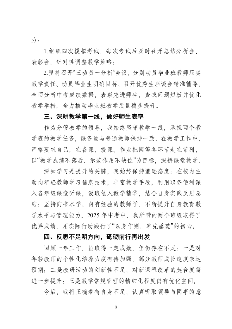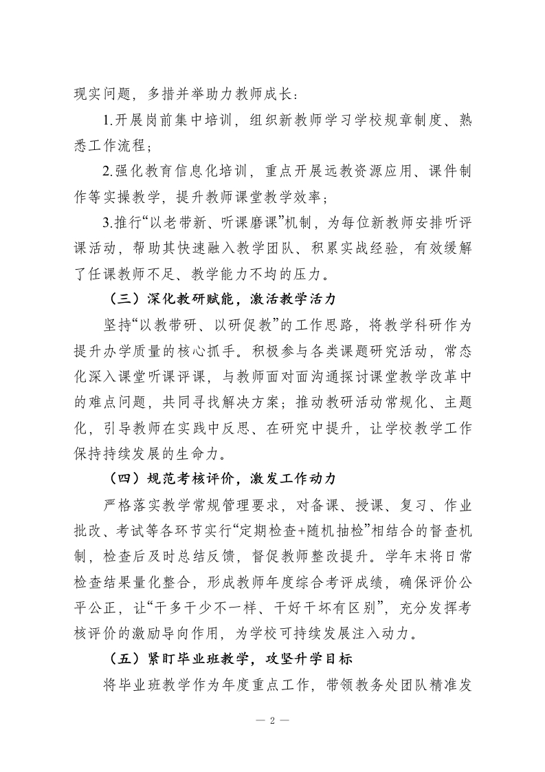 XX学校2025秋季第一学期分管教学副校长工作总结2025年,在县委县政府的正确领导、上级教育行政部门的指导关心下,在全校全体教师的通力协作下,我校教育教学事业稳步推进、成效显著。作为分管教学的副校长,我始终坚守教育初心、牢记职责使命,全力当好校长助手,聚焦教学核心、深耕管理服务,圆满完成年度各项工作任务。现将本年度个人工作情况总结如下:一、坚守初心担使命,筑牢教育思想根基我始终坚持贯彻党的教育方针,积极推进素质教育,在大是大非面前立场坚定、旗帜鲜明,主动维护民族团结,为建设美丽和谐校园建言献策。自觉恪守教师职业道德规范,以身作则当好教师带头人、学生引路人,始终以饱满的事业心和责任感投入教学管理与自身教学工作,全力推动学校教育教学质量提升。二、履职尽责抓管理,推动教学工作提质(一)当好校长助手,统筹教学运转始终以服务学校发展为核心,配合校长开展各项工作。协同调配各科任课教师,结合师资实际优化教学资源配置:针对学校教学管理、资源保障等工作提出合理化建议,协助校长建立规范有序的教育教学秩序,确保教学工作高效运转。(二)聚焦师资建设,破解队伍难题面对我校教师队伍不稳定、年轻教师占比高、经验不足等-1