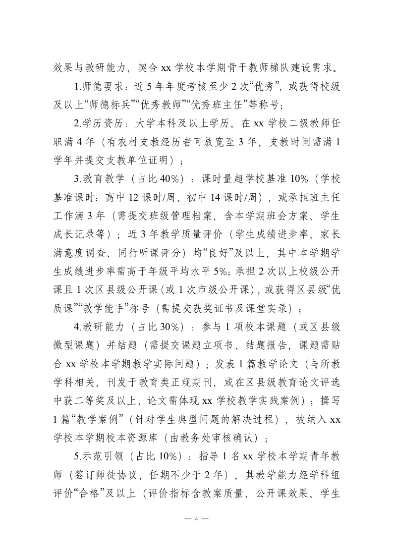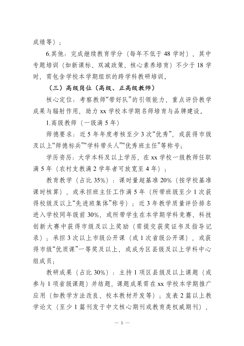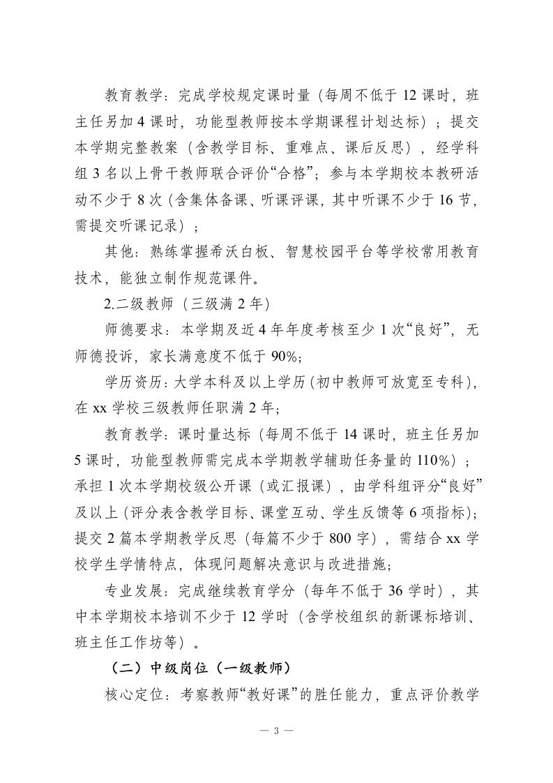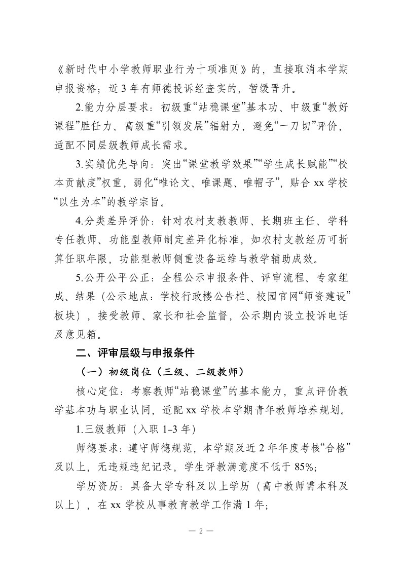 xx学校教师职称聘任与岗位晋级实施方案一、总则(一)指导思想以“立德树人”根本任务为核心,紧扣《中共中央国务院关于全面深化新时代教师队伍建设改革的意见》《教师专业标准》要求,立足Xx学校“厚德博学、笃行致远”的办学理念,聚焦教师“教书育人”核心职责,构建“师德为先、能力为本、实绩为要、分类评价”的晋升体系。引导教师从“论文导向”转向“实践导向”,从“身份认定”转向“专业成长”,推动全校教师队伍向“有理想信念、有道德情操、有扎实学识、有仁爱之心”的“四有好老师”转型,为学校本学期及长远高质量发展提供坚实人才支撑。(二)适用范围本方案适用于Xx学校本学期在职在岗全体公办教师(含初中部、高中部各学科专任教师,实验、心理、信息技术等功能型教师,班主任及德育工作人员)。评审层级涵盖:初级岗位:三级教师、二级教师;中级岗位:一级教师;高级岗位:高级教师(副高)、正高级教师(正高)。民办学校调入教师参照本方案执行,其原有任职年限按相关规定折算。(三)基本原则1师德一票否决:将师德表现作为晋升的“第一门槛”,违反-1