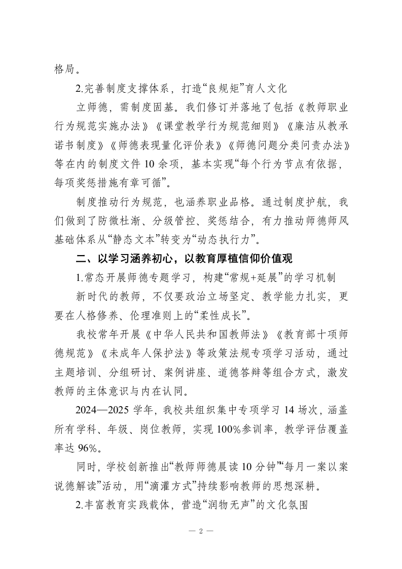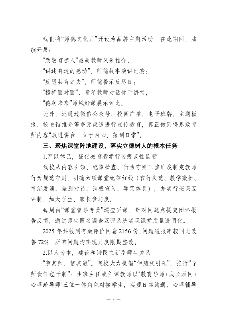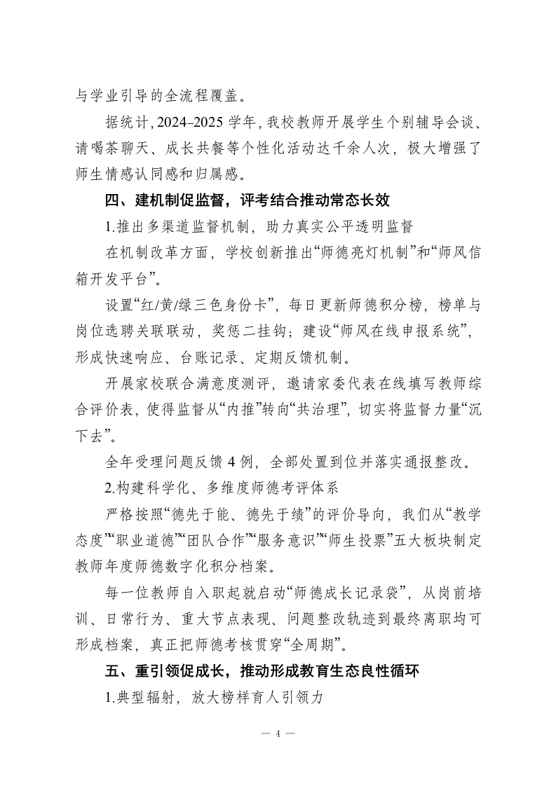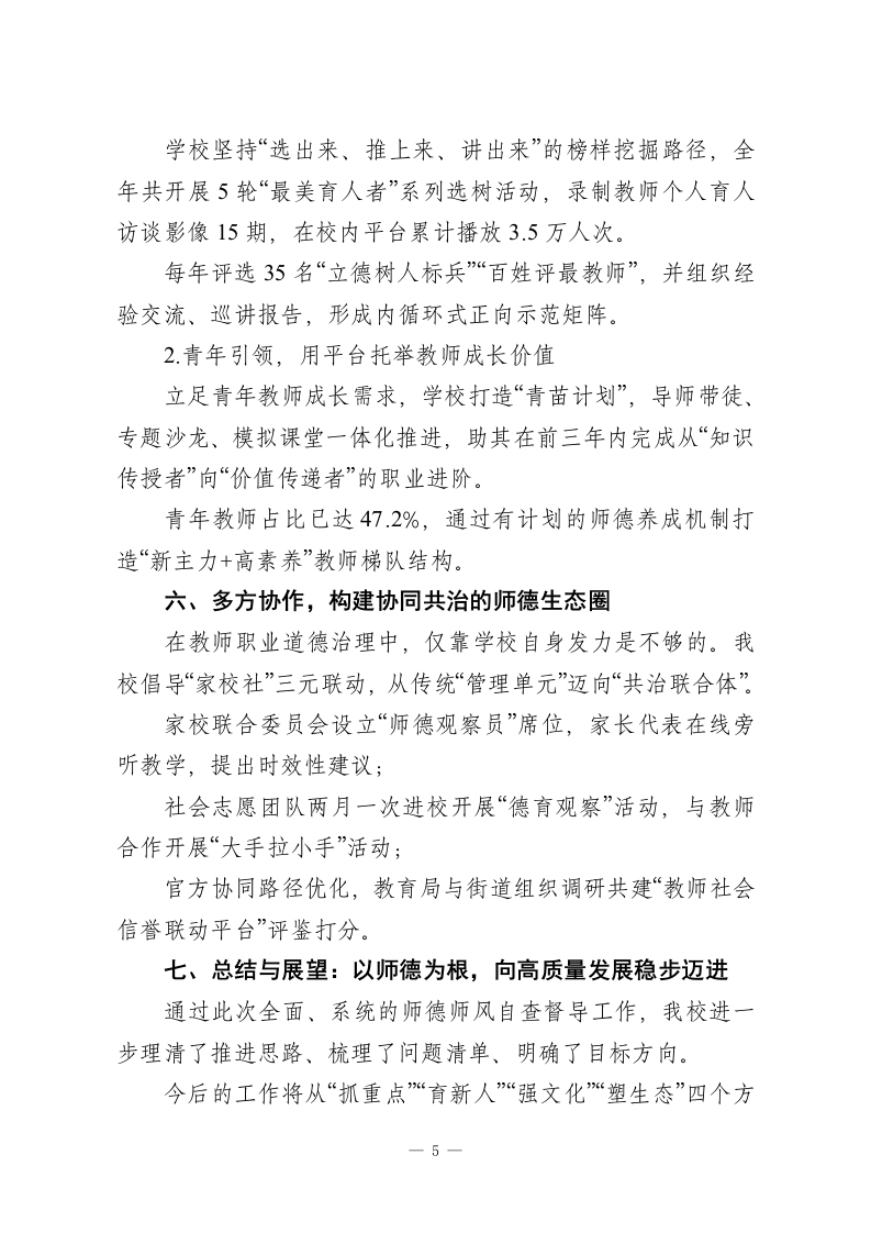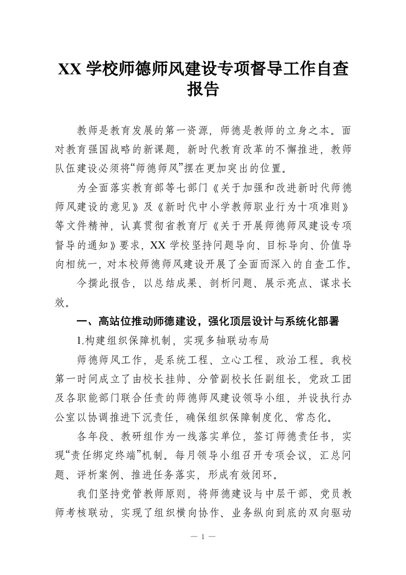 XX学校师德师风建设专项督导工作自查报告教师是教育发展的第一资源,师德是教师的立身之本。面对教育强国战略的新课题,新时代教育改革的不懈推进,教师队伍建设必须将“师德师风”摆在更加突出的位置。为全面落实教育部等七部门《关于加强和改进新时代师德师风建设的意见》及《新时代中小学教师职业行为十项准则》等文件精神,认真贯彻省教育厅《关于开展师德师风建设专项督导的通知》要求,XX学校坚持问题导向、目标导向、价值导向相统一,对本校师德师风建设开展了全面而深入的自查工作。今撰此报告,以总结成果、剖析问题、展示亮点、谋求长效。一、高站位推动师德建设,强化顶层设计与系统化部署1.构建组织保障机制,实现多轴联动布局师德师风工作,是系统工程、立心工程、政治工程。我校第一时间成立了由校长挂帅、分管副校长任副组长,党政工团及各职能部门联合任责的师德师风建设领导小组,并设执行办公室以协调推进下沉责任,确保组织保障制度化、常态化。各年段、教研组作为一线落实单位,签订师德责任书,实现“责任绑定终端”机制。每月领导小组召开专项会议,汇总问题、评析案例、推进任务落实,形成有效闭环。我们坚持党管教师原则,将师德建设与中层干部、党员教师考核联动,实现了组织横向协作、业务纵向到底的双向驱动1