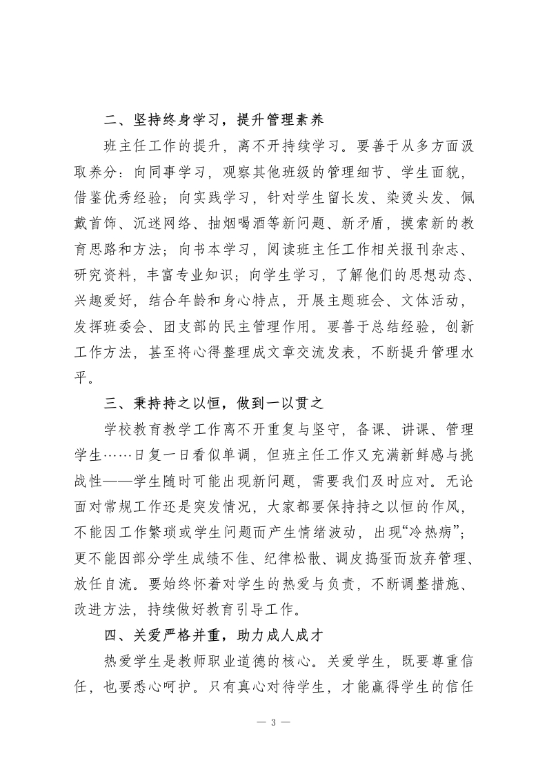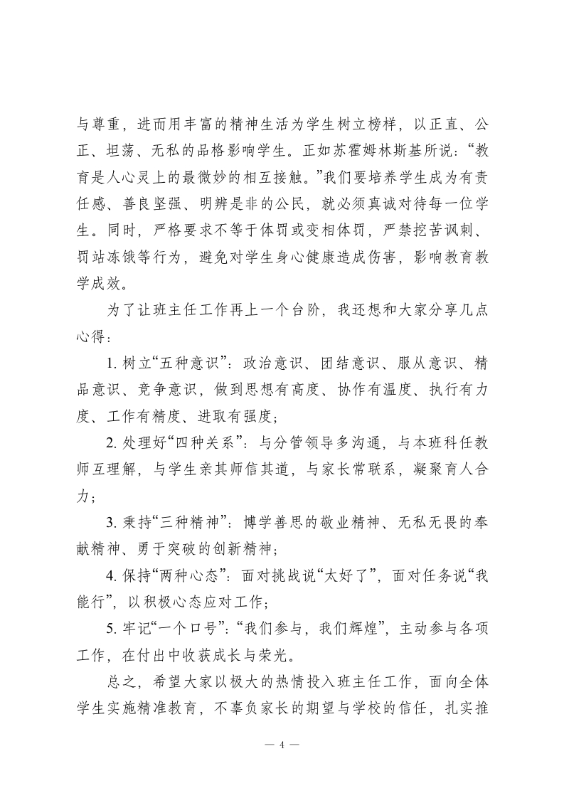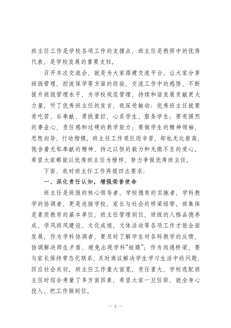 班主任经验交流会校长发言:凝心聚力强班级,匠心育人筑根基老师们、同志们:大家好!今天,我们齐聚一堂召开班主任经验交流会,这是一次十分必要且成果丰硕的会议!刚才,12位班主任分享了各自的班级管理心得,内容实在、经验实用、精神感人。由于时间关系,还有许多经验丰富的班主任未能现场交流,会后政教处将收集整理所有班主任的经验材料,汇编成文印发给大家,方便大家进一步互学互鉴、共同提升。众所周知,班主任是学校工作的骨干力量,是教育教学的主力军。一所学校能拥有一支靠谱、有力的班主任队伍,必然能实现高质量发展。我校的班主任们平时工作踏实务实,始终识大体、顾大局,不计较个人得失与荣誉,展现出了高尚的思想境界。在此,我向全体班主任的无私付出,致以最衷心的感谢!本学期,学校正稳步推进管理改革,朝着精细化管理目标迈进。这就需要我们不断建立完善各项管理制度,狠抓落实,推动学校管理科学化、规范化,确保学校沿着既定目标有序发展。而这一切,核心要靠在座的各位,尤其是班主任同志一你们是学校各项工作和制度的最终执行者、落实者。一个班级的管理成效,直接影响学校整体工作的优劣,从这个意义上说,1