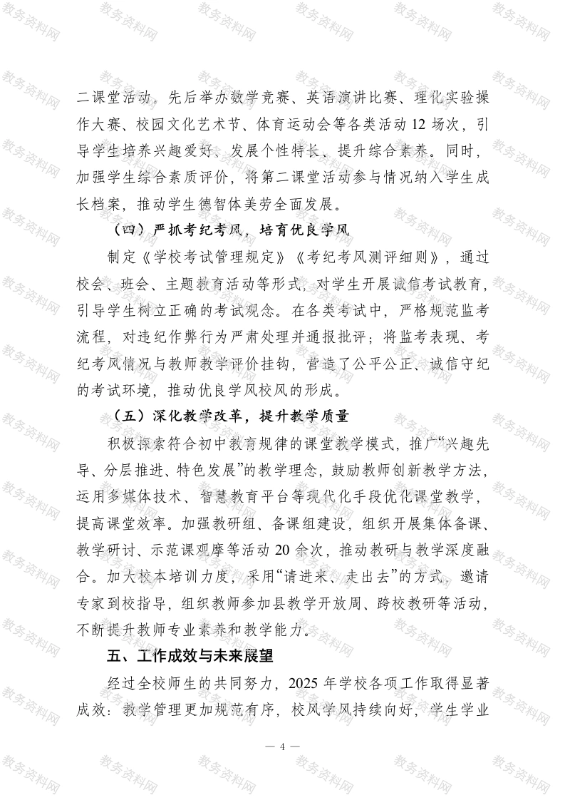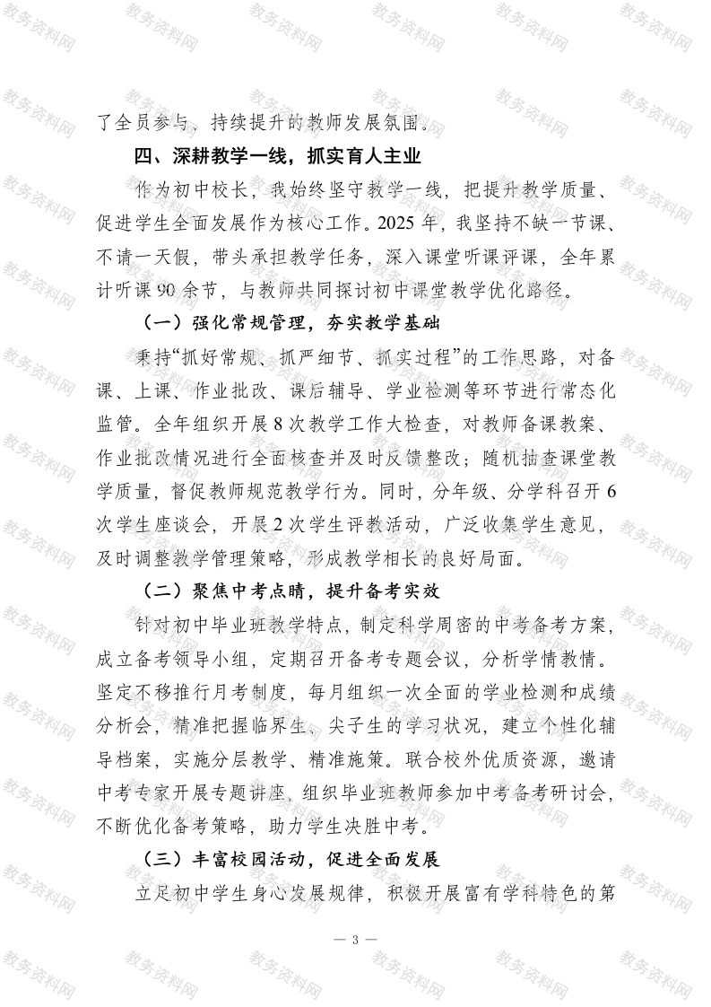 初中校长2025年度个人工作总结2025年,在县委县政府的正确领导下,在县教育局的精准指导下,我始终坚守初中教育立德树人的核心使命,以科学发展观为指引,聚焦课程改革深化与教学质量提升,扎实推进学校各项管理工作,着力培育优良校风学风,较好地履行了校长岗位职责。现将本年度工作情况汇报如下:一、坚守育人初心,筑牢思想根基作为一名共产党员和初中学校校长,我始终把政治建设摆在首位,坚决拥护中国共产党的领导,深入学习贯彻党的教育方针,认真落实立德树人根本任务。在日常工作中,我以身作则、廉洁奉公,严格遵守教育系统各项规章制度,始终保持正派的生活作风和高尚的师德情操。在教育教学中,我坚持以学生为中心,注重全程育人、全方位育人,关心每一位学生的成长成才,引导教师将思想政治教育融入课堂教学与校园生活各环节。工作中,我始终秉持团结协作理念,主动与领导班子成员沟通配合,在学校重大任务攻坚、突发事件处置等关键节点,主动担当、冲锋在前,充分发挥共产党员的先锋模范作用,凝聚起全校师生干事创业的强大合力。二、坚持勤学善思,提升履职能力初中教育处于学生成长的关键阶段,面临着课程改革深化、学生成长需求多元等新形势新挑战。作为校长,我深知唯有持续学习才能跟上时代步伐。2025年,我积极参与上级教育部门1