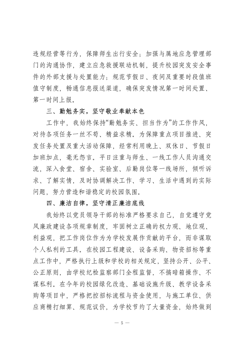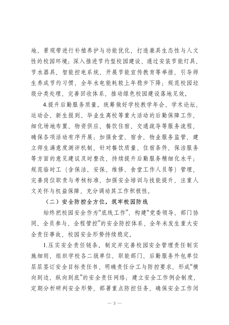 大学分管安全和后勤副校长2025年度述职报告各位领导、老师们:20XX年,我担任本校分管安全管理与后勤保障工作的副校长。在学校党委和校委会的坚强领导下,我始终坚守“安全为基、服务为本、保障有力”的工作理念,紧扣大学办学规律与师生需求特点,以服务教育教学、支撑学校高质量发展为核心目标,扎实推进后勤服务提质增效与平安校园建设,圆满完成物资供应、设施运维、卫生防疫、安全防控、环境优化等重点任务,为全校教育教学、科研创新和师生工作学习生活筑牢坚实保障。现将本年度思想、工作情况汇报如下,请各位批评指正。一、铸魂修身,筑牢思想与作风根基(一)深化理论武装,提升履职能力本年度,我持续深入学习习近平新时代中国特色社会主义思想、党的二十大精神及习近平总书记关于安全生产、教育后勤工作的重要论述,积极参加学校党委理论学习中心组学习、专题培训等各类政治活动,不断强化政治判断力、政治领悟力、政治执行力。同时,聚焦大学安全后勤管理的专业性需求,主动钻研应急管理、智慧后勤、高校安全防控等业务知识,借鉴国内先进高校经验,推动理论学习与工作实践深度融合,着力提升应对复杂问题、破解工作难题的能力。(二)坚守道德底线,树立良好形象—1