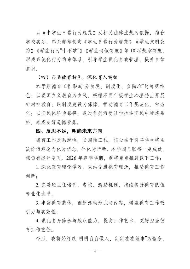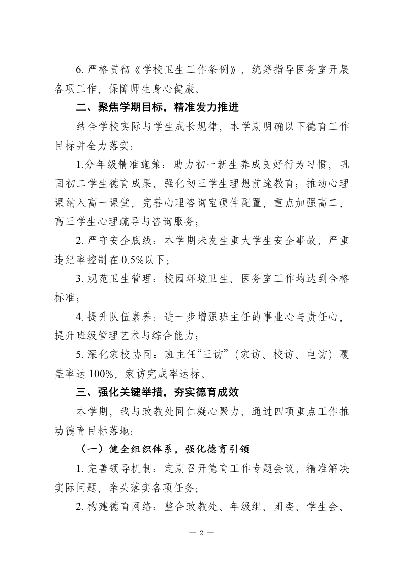 德育副校长个人工作总结:聚焦德育实效,筑牢成长根基2025年秋季学期,在校领导的统筹指导与各位同事的关心支持下,我严格履行德育副校长职责,认真落实学校德育工作部署,围绕“立德树人”根本任务,在体系构建、队伍建设、活动开展、制度完善等方面扎实推进工作,取得了阶段性成效。现将本学期工作情况总结如下:一、明确核心职责,锚定工作方向作为德育副校长,我的核心职责是协助校长分管全校德育教育工作,具体聚焦以下方面:1.坚守社会主义办学方向,统筹协调德育工作开展,保障德育活动的时间、场地、人员及物力财力支持,主持德育工作例会,专题研究部署重点任务,及时处置德育领域重大问题;2.健全德育工作体系,构建学校、家庭、社会“三结合”德育网络,强化班主任队伍建设与师德师风教育,完善德育管理制度,将德育考核结果与班主任奖惩、评聘、使用直接挂钩:3.细化本学期德育工作实施计划,分解目标任务、明确责任分工,加强对各部门德育工作的检查考评,总结推广先进经验,落实奖惩机制;4.推进校园文化建设,培育优良校风、教风、学风,拓展校外德育与社会实践基地,丰富德育实践载体;5.深化德育科研,组建专题研究组,筹备学期末德育工作研讨会,汇编教师德育优秀论文集,提升德育工作专业化水平;一1