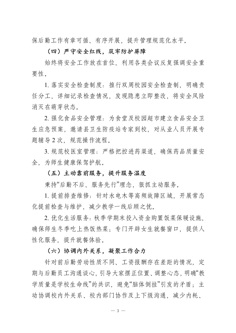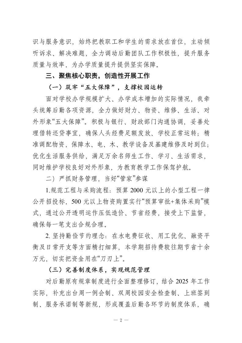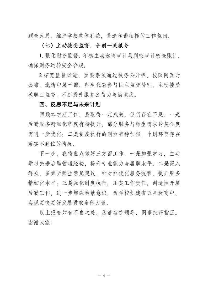 分管后勤副校长2025年秋季学期述职报告今年,在县委、县政府、县教育跨越发展指挥部及主管局的正确领导下,我始终秉持“后勤不后、服务先行”的工作理念,当好校长、书记的得力助手,团结校领导班子成员,紧紧依靠全体教职工,扎实履行后勤管理职责,创造性开展各项工作,在政治学习、廉洁自律、服务保障等方面取得了一定成效。现将本学期履职情况汇报如下,请予评议。一、强化理论武装,提升政治素养本学期,我深入学习党的二十大及二十届历次全会精神,牢固树立和践行新发展理念,严格贯彻省政府关于学校管理的相关规定,积极参加各级各类政治思想教育活动,认真撰写读书笔记与学习心得。在思想上不断完善自我、提升认知,自觉做师德师风建设的表率;工作中坚持以身作则,严格遵守学校各项规章制度,团结班子成员同心同德、齐心协力,以良好的工作、生活、学习形象,带动后勤团队全力保障学校教育教学工作有序开展,为学校高质量发展筑牢后勤根基。二、坚守廉洁底线,强化服务意识“正人必先律己”,廉洁自律是后勤工作的生命线。本学期,我始终坚守勤政廉政准则,协同班子成员严格落实校务公开制度。凡涉及学校重大改革、教职工切身利益的事项,均经校领导班子集体研究,再由校工会牵头广泛征求意见,坚持公平、公正、公开原则和实事求是要求推进工作。工作中强化公仆意—1