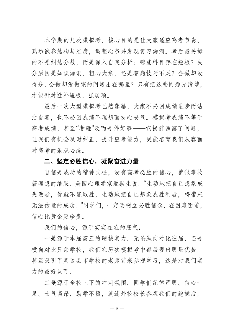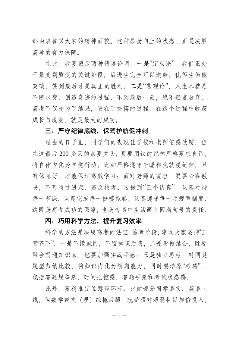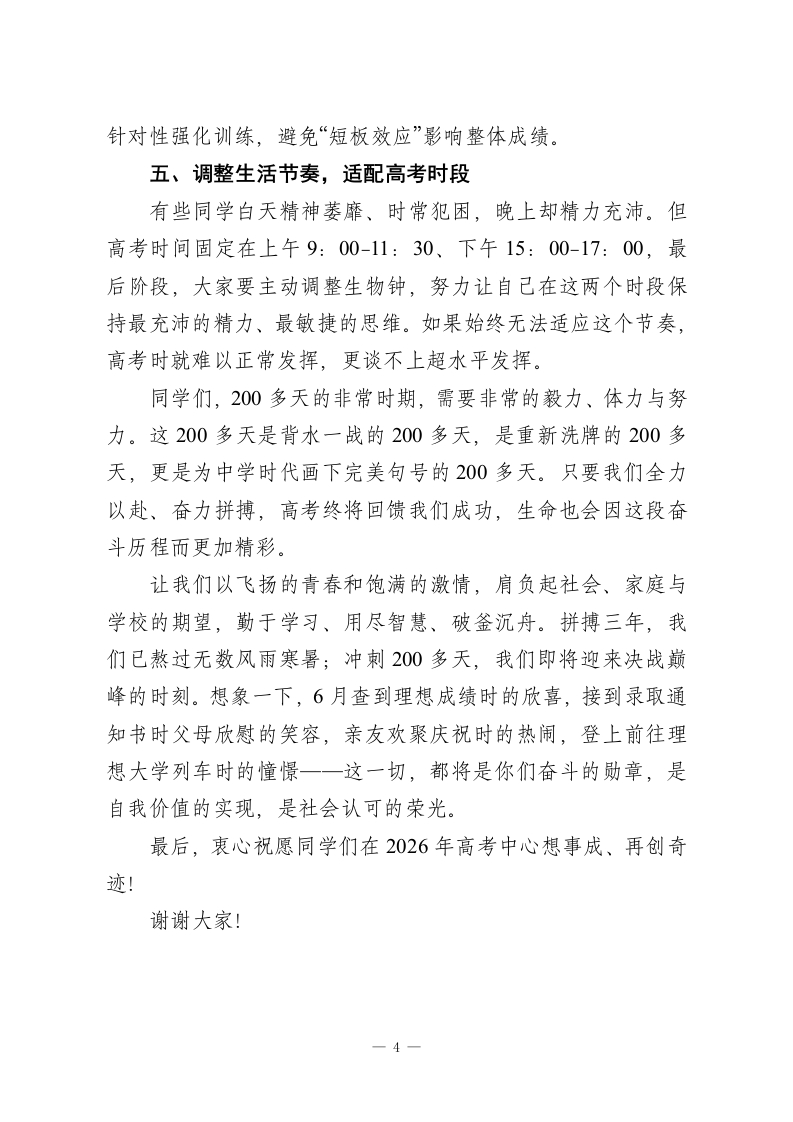 高考冲刺校长励志讲话:以韧劲破局,以冲劲攻坚,以智慧决胜老师们、同学们:大家辛苦了!潮起潮落,花开花谢,时光荏苒,岁月如梭。转眼间,2026年高考已进入最后的冲刺阶段。这200多天看似短暂,却蕴藏着无限可能,你们以怎样的心态迎战,不仅关乎个人人生轨迹的走向,更牵动着每个家庭的期盼与幸福。我相信,在场的每一位同学都不会虚度这关键时光,都会牢牢抓住这证明自我、绽放青春的绝佳机会。无论你的起点如何,这200多天都将是你腾飞的助推器,助力你飞向理想的彼岸。同学们,如果把高考比作一场足球赛,这200多天就是临门一脚,把握得当便能锁定胜局,稍有不慎便可能前功尽弃;如果把高考比作一场马拉松,这200多天就是最后的10公里,决定成败的不是过往的积淀,而是此刻的韧劲、冲劲与智慧。冲刺有力,便能马到成功、金榜题名;冲刺疲软,便可能功亏一篑、留下终生遗憾。根据以往迎战高考的经验,最后200多天往往风云变幻。对班级而言,这200多天可能让优秀班级跌落谷底,也可能让后进班级实现逆袭;对个人而言,200多天足以创造翻天覆地的变化。或许有同学会问:“大局已定,还能改变什么?”我要明确告诉大家:200多天,足以创造奇迹!一、辩证看待模拟考,查漏补缺明方向一1