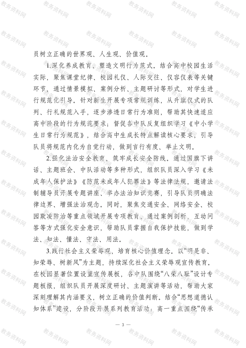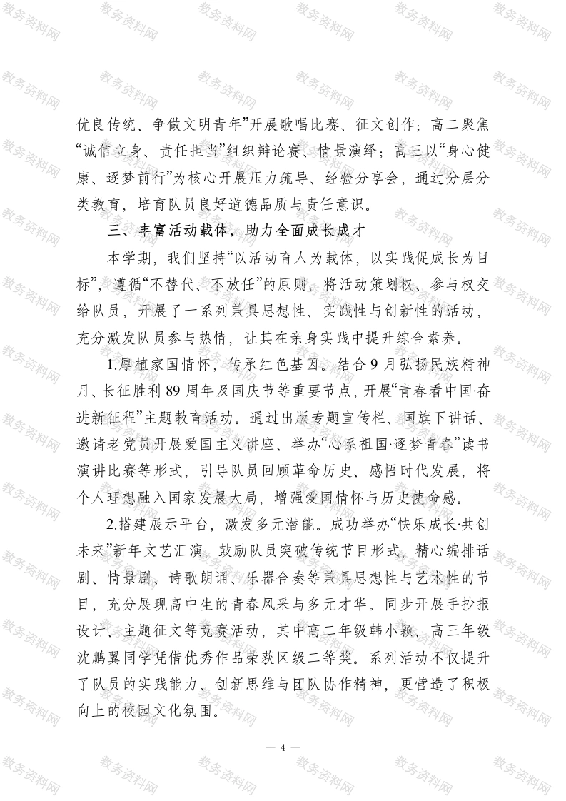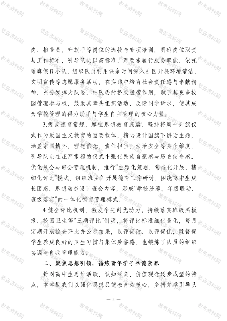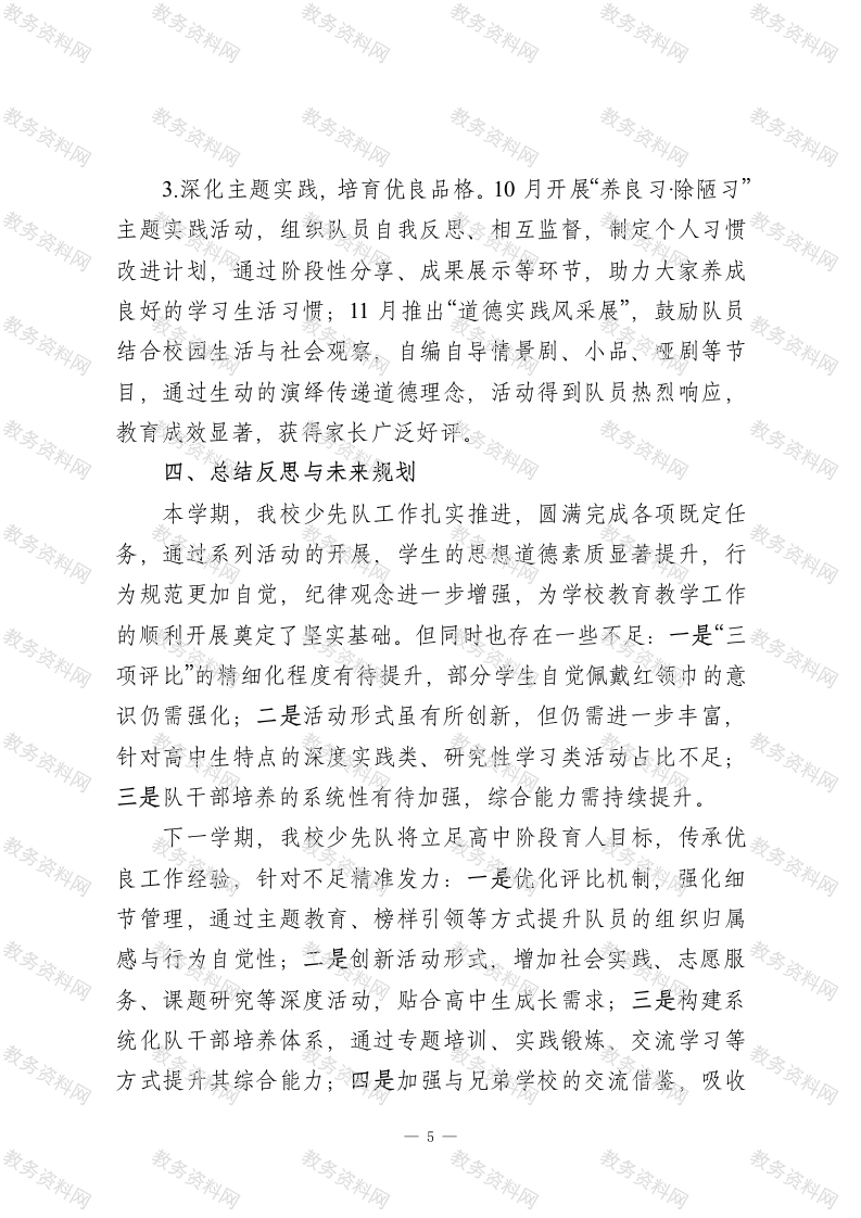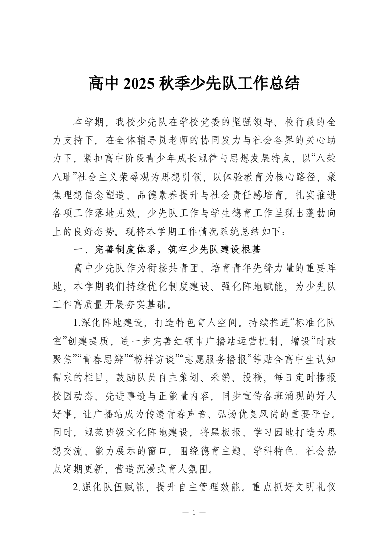 高中2025秋季少先队工作总结本学期,我校少先队在学校党委的坚强领导、校行政的全力支持下,在全体辅导员老师的协同发力与社会各界的关心助力下,紧扣高中阶段青少年成长规律与思想发展特点,以“八荣八耻”社会主义荣辱观为思想引领,以体验教育为核心路径,聚焦理想信念塑造、品德素养提升与社会责任感培育,扎实推进各项工作落地见效,少先队工作与学生德育工作呈现出蓬勃向上的良好态势。现将本学期工作情况系统总结如下:一、完善制度体系,筑牢少先队建设根基高中少先队作为衔接共青团、培育青年先锋力量的重要阵地,本学期我们持续优化制度建设、强化阵地赋能,为少先队工作高质量开展夯实基础。1.深化阵地建设,打造特色育人空间。持续推进“标准化队室”创建提质,进一步完善红领巾广播站运营机制,增设“时政聚焦”“青春思辨”“榜样访谈”“志愿服务播报”等贴合高中生认知需求的栏目,鼓励队员自主策划、采编、投稿,每日定时播报校园动态、先进事迹与正能量内容,同步宣传各班涌现的好人好事,让广播站成为传递青春声音、弘扬优良风尚的重要平台。同时,规范班级文化阵地建设,将黑板报、学习园地打造为思想交流、能力展示的窗口,围绕德育主题、学科特色、社会热点定期更新,营造沉浸式育人氛围。2.强化队伍赋能,提升自主管理效能。重点抓好文明礼仪-1-