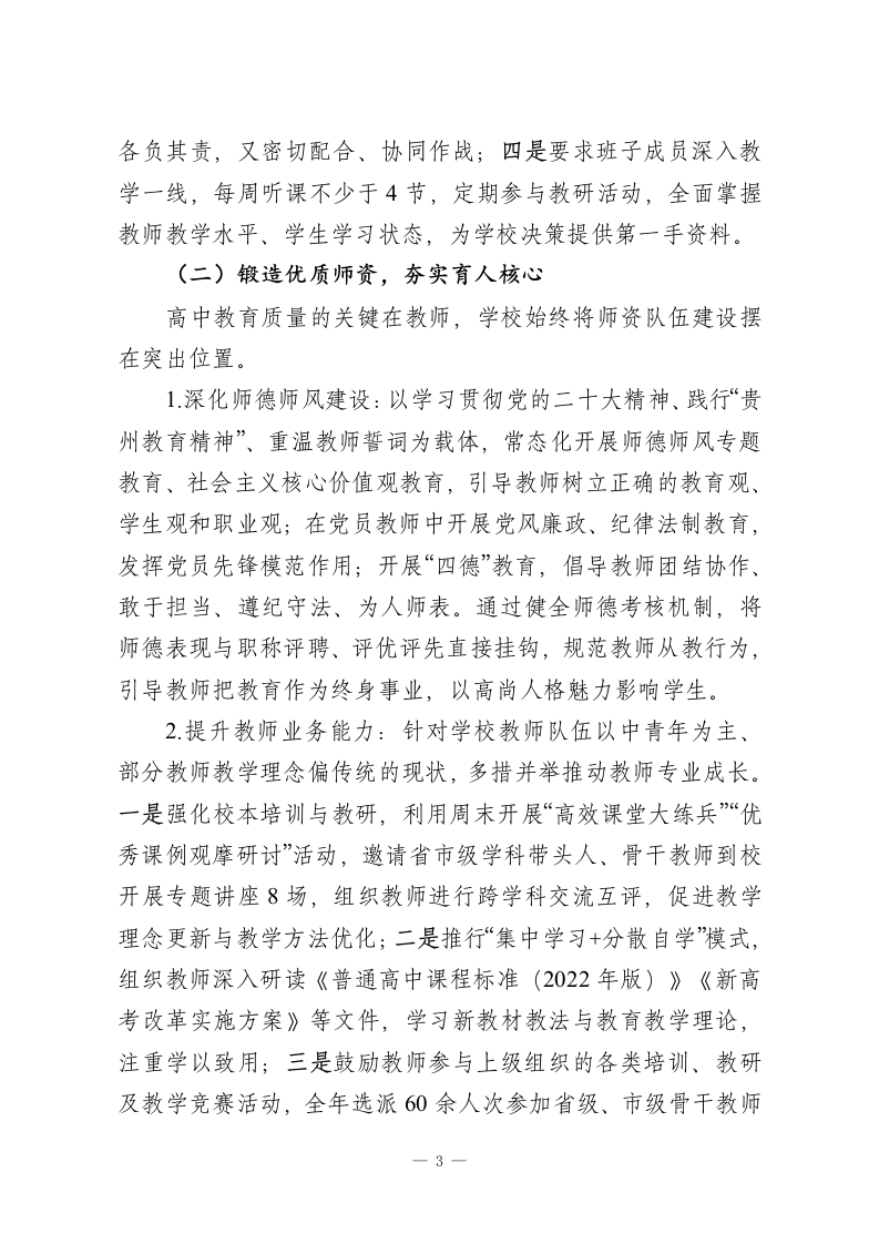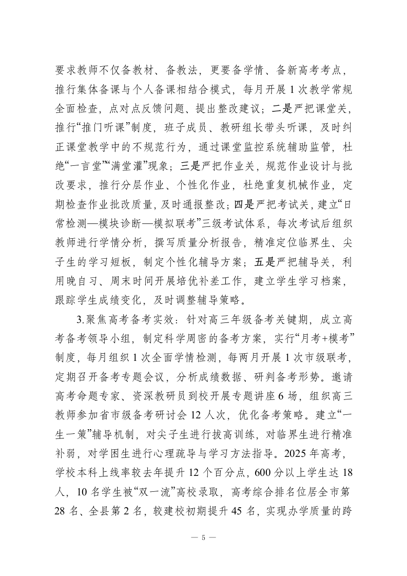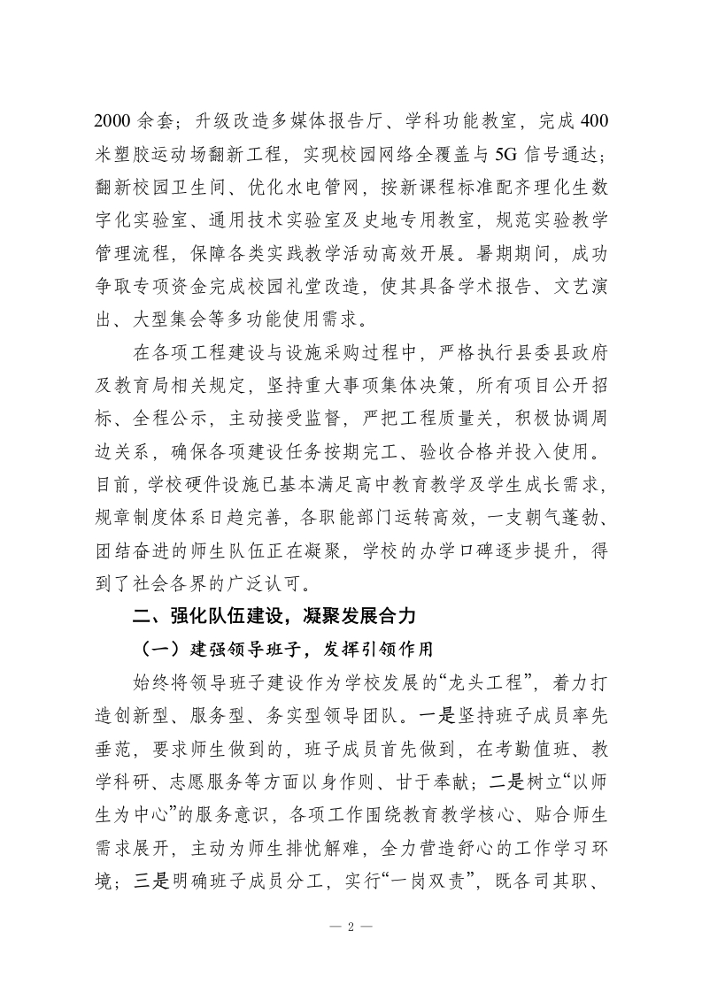 高中校长2025年度述职报告各位领导、同志们:受县委县政府、县教育局的委托,我于2023年8月从县第二高中校长岗位调任Xx县实验高级中学筹建组组长,全面负责学校筹建与办学起步工作。现将2025年度工作情况向各位作详细汇报,恳请组织和同志们提出宝贵意见,以助力我进一步改进工作。2025年,是实验高级中学稳步发展、蓄力提质的关键一年。在县委、县政府的坚强领导下,在县教育局的精准指导下,在社会各界及广大家长的大力支持配合下,学校紧紧围绕全县教育高质量发展重点任务,以学习贯彻党的二十大及二十届历次全会精神为引领,聚焦办学条件优化、师资队伍建设、教学改革深化、育人质量提升、校园安全保障等核心工作,实施精细化管理,各项事业实现有序推进、成效初显。现将具体工作汇报如下:一、攻坚硬件建设,筑牢办学根基实验高级中学在原县一中老校区基础上组建而成,传承了“崇德笃学、砺行致远”的校训精神。筹建初期,我们仅用两周时间完成了新教师岗位调配、班主任任命、高一新生招生及高二、高三年级重组工作,确保学校快速步入正常办学轨道。2025年,学校持续发力硬件升级,将办学保障落到实处。9-11月,利用专项经费完成“智慧校园”二期建设,为全体教师配齐高性能办公设备及教学终端,更新学生标准化课桌凳1