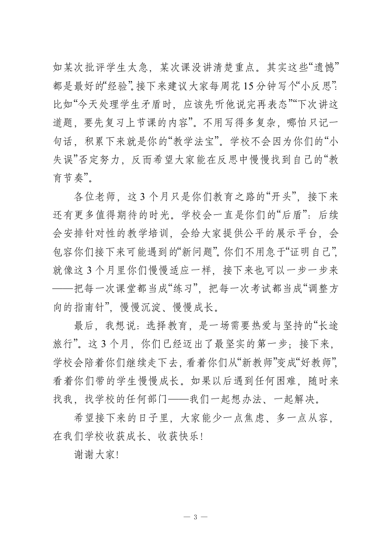 工作3个月后,校长在新教师座谈会上讲话:细数三月耕耘路,助力新师破茧行尊敬的各位新老师:大家下午好!今天和大家坐在一起,特别有感触一从2025年9月开学至今,我们已经并肩走过3个月了。这3个月,是大家从“校园人”到“教育人”真正落地扎根的阶段,也是学校看着你们快速成长的珍贵时光。首先,我代表学校,再次为各位顺利度过入职初期、正式融入我们这个大家庭,送上最真诚的肯定与欢迎!你们带着年轻的活力走进课堂,把新鲜的教育理念带进班级,这份初心与冲劲,正是我们学校向前走的重要动力。我清楚,这3个月对大家来说,是“挑战与收获并存”的一段路。刚开学时,你们可能抱着满心期待站上讲台,却发现要同时应对备课、上课、管班这“三座小山”;中期遇到第一次月考,看着成绩表上的数字,难免会和自己的预期对比,产生焦虑;甚至到现在,可能还会在某个早晨,因为学生的突发矛盾、未交的作业,又一次陷入“手忙脚乱”。但我更知道,这3个月里,你们也在悄悄进步:从最初不敢直视学生的眼睛,到现在能从容处理课堂小插曲:从第一次开班会的紧张卡顿,到现在能和学生聊到一起一一这些看得见的变化,都是你们用时间和心血换来的,学校都看在眼里、记在心里。请大家一定记住:这3个月的“忙乱”,不是你们的“不足”,而是每个新教师成长的“必经课”。就像农民播种后要经历浇水、1