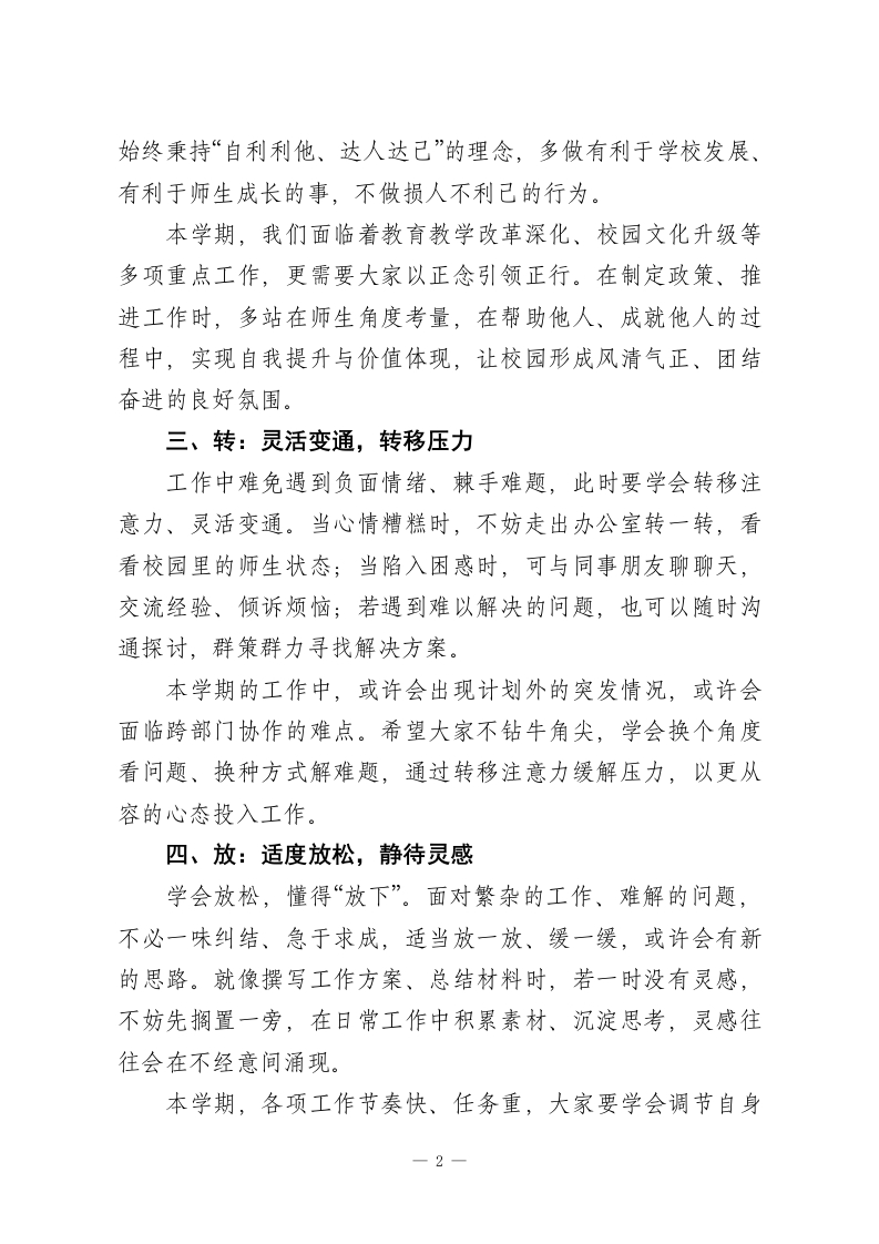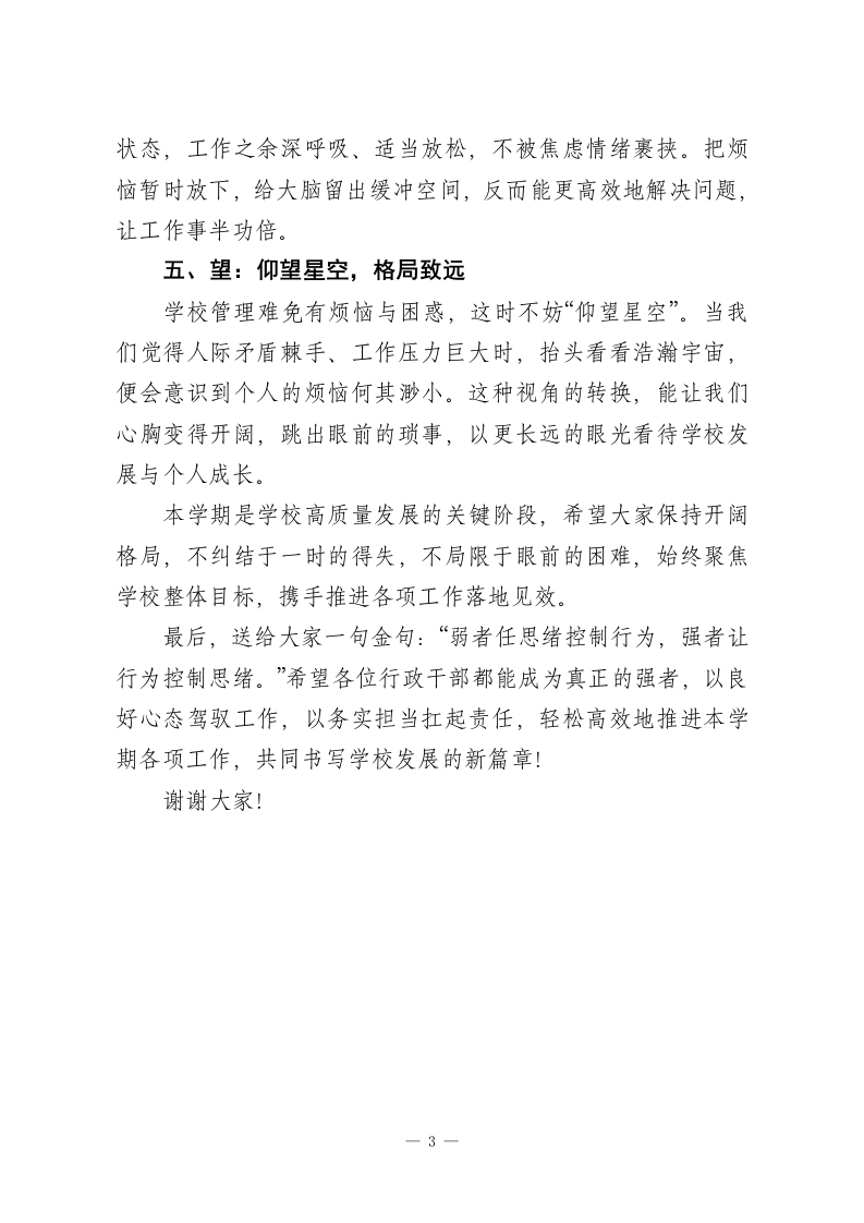 行政班子会议校长讲话:以好心态赋能管理,以硬担当护航发展各位行政、各位主任:大家好!“以平常心观不平常事,则事事平常。”作为学校管理者,若能兼具清晰的逻辑思维与良好的心态,便能在复杂工作中从容应对、行稳致远。今天,我想和大家分享五个字,掌握这五个字,既能让我们的心态愈发平和,也能赢得老师们的认可与支持,更好推进本学期各项工作。一、慢:谋定而后动,沉稳不急躁凡事慢一点,思考慢一点、说话慢一点。“人贵语迟”,放慢语速的背后,是让思考跟上行动的节奏。工作中,若急于表态、仓促决策,很容易陷入情绪化表达,忙中出错。人的大脑有两套系统:快系统是本能反应,易冲动冒进;慢系统是理性思考,虽耗时但周全。本学期学校各项任务繁杂,从教学常规落实到校园安全保障,从德育活动推进到后勤服务优化,每一项都关乎学校发展。希望大家启动“慢系统”,遇到问题先冷静分析,多权衡利弊、多听取意见,克制急躁情绪,避免因一时冲动引发矛盾或造成工作疏漏。二、正:心正行端,利他共赢心态好的核心是心怀正能量,坚守“君子有所为有所不为”的底线。作为管理者,我们要行事光明磊落,不搞暗箱操作,1