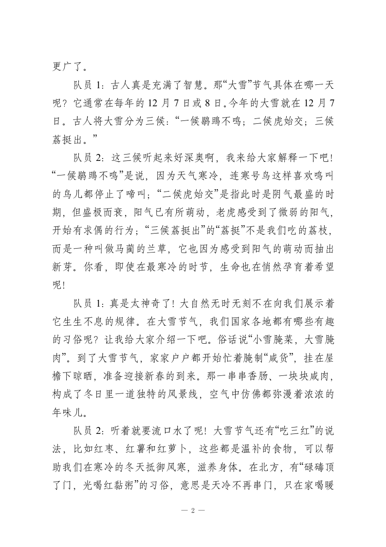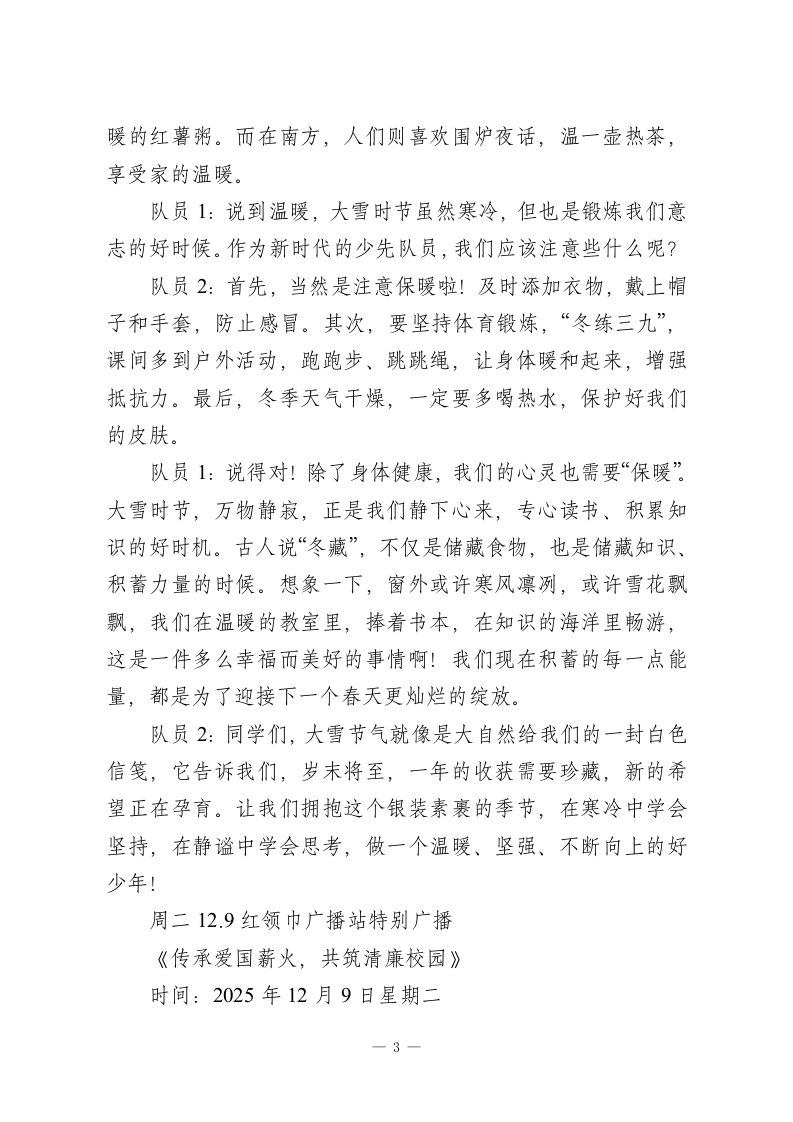 红领巾广播站2025年秋季学期第15周广播稿(12.8-12.12)周一12.8二十四节气之大雪《雪落启冬韵,暖育少年心》时间:2025年12月8日星期一地点:红领巾广播室播音员:队员1:敬爱的老师们:队员2:亲爱的同学们:合:大家早上好!队员2:唤醒你的耳朵,触摸你的心灵,用电波传递温暖,用声音传播正能量,红领巾广播站与你相约。让我们一起在广播中绽放光彩,书写美好校园篇章。队员1:我是播音员*队员2:我是播音员*队员1:伴随着窗外日渐清冷的空气,昨天我们迎来了冬季的第三个节气一一大雪。一听到“大雪”这个名字,很多同学可能就会想:是不是马上就要下好大的雪,可以打雪仗、堆雪人了呢?队员2:“大雪”节气可不一定意味着一定会下很大的雪哦。它其实是一个气候概念,和小雪、雨水、谷雨等节气一样,是古人用来指导农业生产和生活的“天气预报”。它告诉我们,从这个时候起,天气会越来越冷,降雪的可能性增大了,范围也-1