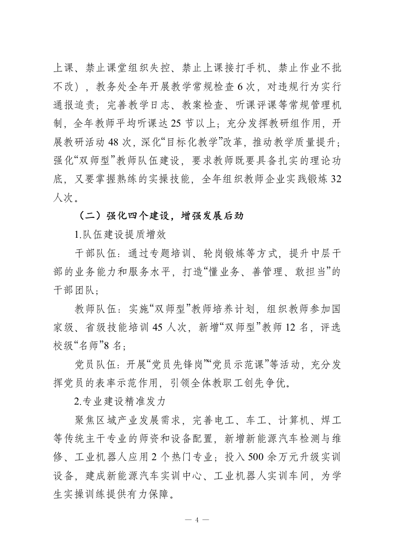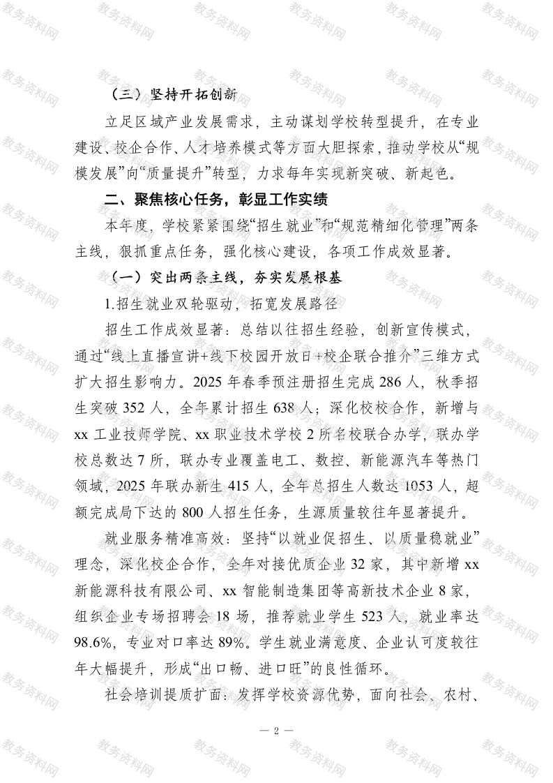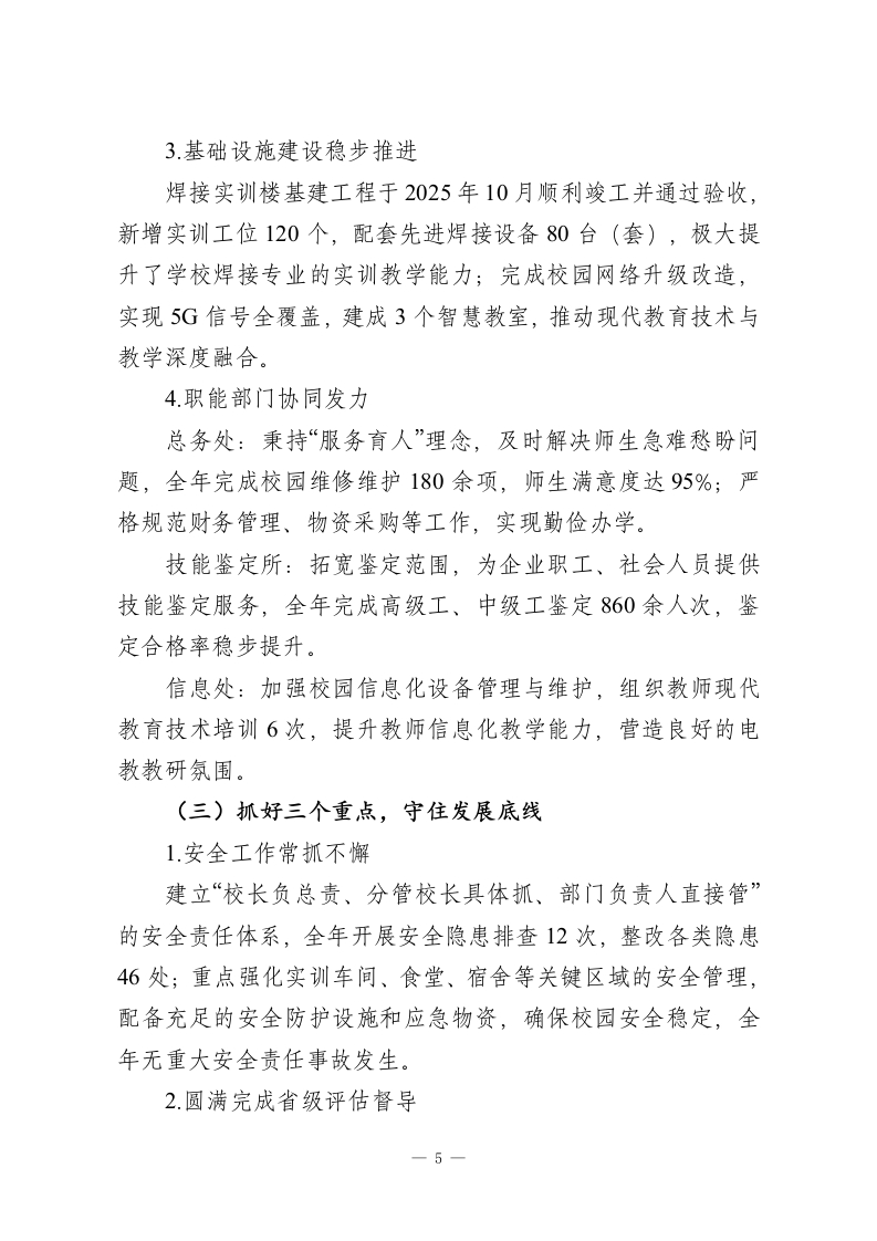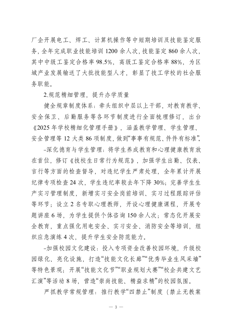 技工学校校长2025年度述职报告各位领导、同志们:2025年是我校深化内涵建设、推进精细化管理、迈向高质量发展的关键一年。作为校长,我始终坚守“办人民满意的职业教育”初心,牵头制定“1234”年度工作工程(贯彻一个育人体系、突出两条发展主线、抓好三个重点任务、强化四个核心建设),与领导班子凝心聚力、统筹部署,推动学校各项工作取得显著成效。现将本年度工作情况述职如下,请予评议。一、筑牢思想根基,提升履职能力(一)强化政治引领始终坚持以习近平新时代中国特色社会主义思想为指导,深入贯彻党的二十大及二十届历次全会精神,严格落实党的职业教育方针政策,牢牢把握职业教育“立德树人、产教融合”的发展方向。全年组织班子成员、党员教师专题学习6次,及时跟进学习最新教育政策理论,不断提升自身政治素养和决策水平。(二)提升领导效能秉持“民主集中、科学决策”原则,广泛听取师生、家长及企业意见建议,全年收集合理化建议38条,均纳入学校发展规;注重发挥班子成员和中层干部的特长,优化部门协同机制,营造“团结协作、务实高效”的工作氛围;面对招生就业、校园安全等复杂问题,冷静果断、科学处置,确保学校发展大局稳定。一1一