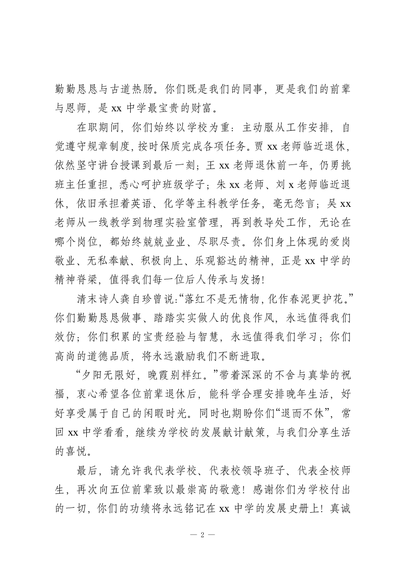 教师退休欢送会校长讲话:薪火传情忆初心,桃李芬芳敬韶华各位老师、亲爱的退休前辈们:大家好!今天,我们欢聚一堂,怀着不舍与敬意,为刘x老师、吴Xx老师、王Xx老师、贾x老师、朱Xx老师五位即将光荣退休的前辈,举办这场温馨的欢送会。让我们一同追忆并肩奋斗的岁月,共同祝愿各位前辈的退休生活美好顺遂!五位老师即将告别挚爱的三尺讲台,但x中学的一草一木、一砖一瓦,都镌刻着你们的奉献,承载着你们的精神。数十年来,你们始终爱岗敬业、教书育人,将青春年华与半生心血,毫无保留地奉献给了学校的建设与发展;你们淡泊名利、无私奉献,用高尚的人格与扎实的专业知识,精心呵护每一位学生的心灵与梦想,助力他们成长为栋梁之材;你们严谨治学、率先垂范,以优良的师德与丰富的经验,影响带动了一批又一批年轻教师,支持辅佐了一任又一任学校领导。可以说,学校的每一步发展、每一点成绩,都离不开你们曾经的汗水与付出,正是有了你们的坚守,x中学才拥有了如今的和谐美丽与生机盎然。“默默无闻奉献智慧,孜孜不倦耕耘心田”,这正是五位老师的真实写照。你们如春蚕吐尽爱心,似红烛燃尽深情。与你们相处的岁月里,我深深感受到大家的和蔼可亲、忠厚诚恳、1