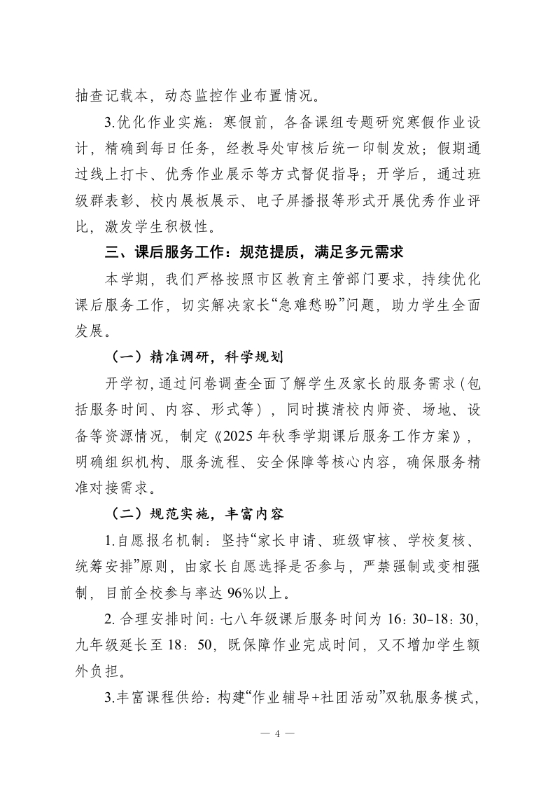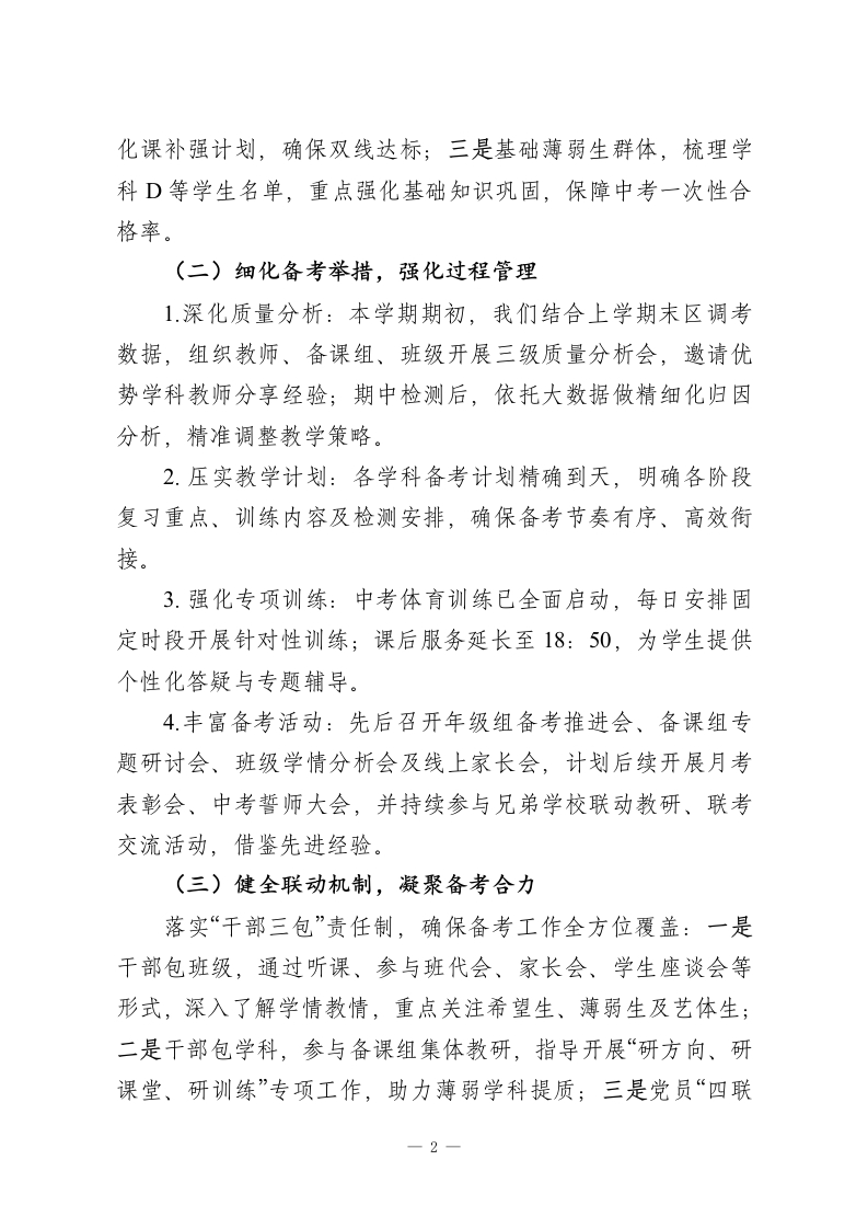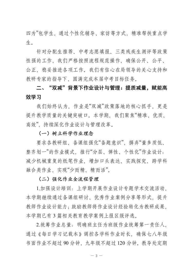 局领导下校调研工作,校长汇报讲话毕业,年级备考和双减政策下等方面工作尊敬的X局、X科、X主任,各位局领导、教研专家:大家好!衷心感谢各位在百忙之中莅临我校调研指导,为我们的教育教学工作精准把脉、传经送宝。下面,我代表学校,重点围绕毕业年级备考、“双减”政策下作业设计管理及课后服务三项核心工作,向各位作详细汇报。一、毕业年级备考工作:精准发力,全力冲刺目标毕业年级是学校教学工作的重中之重,这学期作为中考备考的关键阶段,我们始终坚持“精准定位、分层施策、全员联动”的思路,稳步推进备考各项工作。((一)优化备考布局,明确目标导向在师资紧张的情况下,学校专门为九年级增设“希望生冲刺班”,以八年级下学期全区调考成绩为核心依据,结合学生日常综合表现,甄选出22名普高线临界生集中培养。我们调配校内骨干师资组建专属教学团队,制定个性化备考方案,目标是实现全员上线。目前该班成效显著,从八年级下学期仅3人达普高线,到本学期期中检测已有11人上线,阶段性目标圆满达成。同时,我们通过精准数据分析,明确多层级备考目标:一是核心希望生群体,除冲刺班22人外,另有33名学生处于全区普高希望生划线61%-70%区间,已将这部分学生明确到班级薄弱学科明确到教师,实行“一人一档、盯防到人”;二是艺体特长生群体,共21人,在保障其专业训练的同时,专门制定文—1