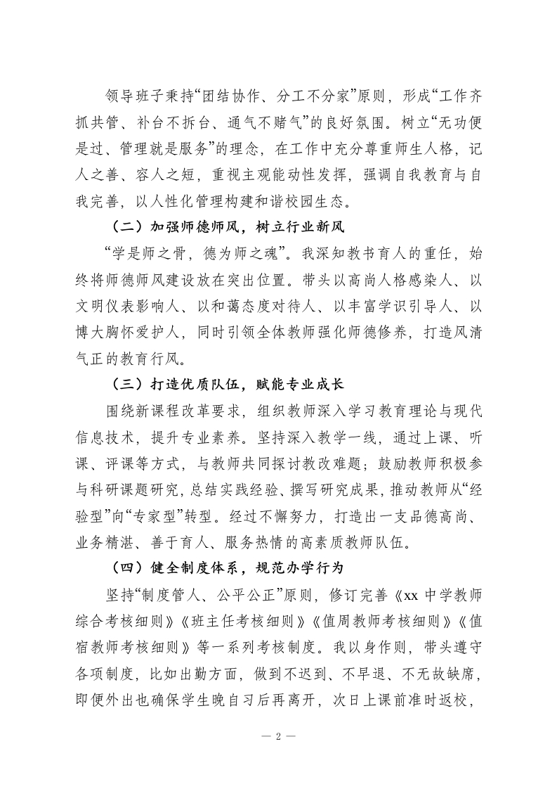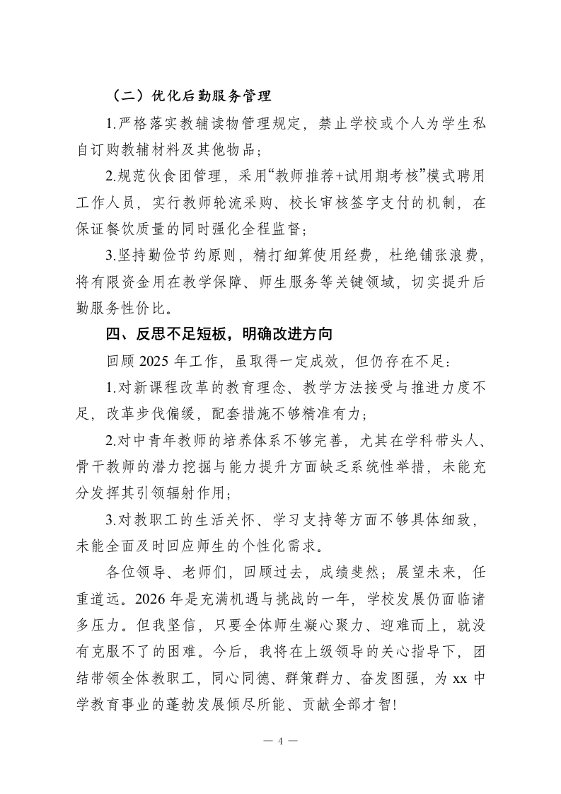 领导班子2025年度校长年度工作总结2025年是学校发展进程中充满挑战与成长的一年,各类事务繁杂、变化显著。这一年里,我始终摆正心态、不计得失,埋头苦干、勤勉履职,全力推动学校稳定与发展,较好地履行了校长职责。现将本年度工作情况汇报如下:一、坚守政治初心,筑牢思想根基我始终热爱祖国、忠诚教育事业,坚定拥护中国共产党的领导,深入学习贯彻习近平新时代中国特色社会主义思想,坚持党的教育方针与正确路线,树立“以人为本、立德树人”的教育思想,形成科学的人才观、质量观。严格遵守国家法律法规、各级规章制度及学校劳动纪律,恪守《教师职业道德规范》,做到不迟到、不早退、不私自离校。工作中关心学生成长、热心学校公务、团结同事伙伴,以强烈的责任感和敬业精神保质保量完成各项任务;生活中遵守社会公德、传承优良传统,不计个人得失、不谋取私利,在学校评优表彰中始终主动谦让,五年内仅获评一次荣誉类奖项;主动关心帮助他人、孝敬父母、爱护家人,时刻维护教师与学校的良好形象。二、强化精细管理,提升育人质量质量是学校的生命线,高效管理是发展的核心驱动力。本年度,我聚焦“师生成长与学校发展”双核心,多措并举推进管理提质。(一)凝聚班子合力,夯实管理基础-1
