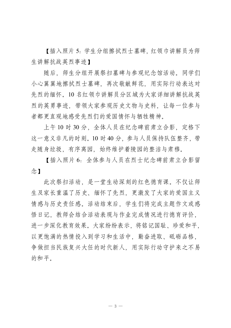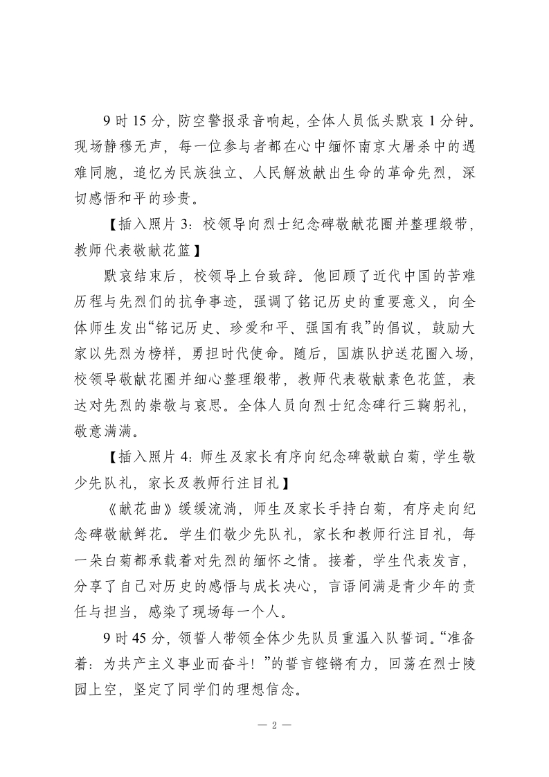 铭记国殇承先烈,吾辈自强护和平我校圆满开展2025年国家公祭日烈士陵园祭扫活动12月13日,南京大屠杀死难者国家公祭日如期而至。为引导师生铭记历史、缅怀先烈,传承爱国主义精神,培育和践行社会主义核心价值观,我校组织小学部四至六年级、初中部七至九年级优秀师生及家长代表,赴XX市烈士陵园开展“铭记国殇承先烈,吾辈自强护和平”主题祭扫活动,在庄重肃穆的氛围中感悟历史重量,凝聚奋进力量。【插入照片1:师生及家长代表在烈士陵园前整齐列队,身着素色服装、佩戴红领巾,神情肃穆】上午8时30分,参与人员准时在烈士陵园集合。工作人员清点人数后,着重强调了活动纪律与安全要求,明确全程需保持肃穆、禁止喧哗,以严谨态度致敬先烈与遇难同胞。9时整,活动正式拉开帷幕。主持人详细介绍了国家公祭日的历史背景、活动意义及流程,瞬间将现场氛围带入庄重肃穆之中。【插入照片2:国旗队队员执党旗、团旗、队旗、校旗整齐入场,全体人员行注目礼】9时05分,出旗仪式举行。12名国旗队队员精神抖擞,执旗迈着整齐的步伐入场,《出旗曲》奏响时,全体人员肃立行注目礼。随后,《义勇军进行曲》激昂回荡,师生及家长齐声高唱国歌,爱国之情在歌声中愈发浓烈。1-