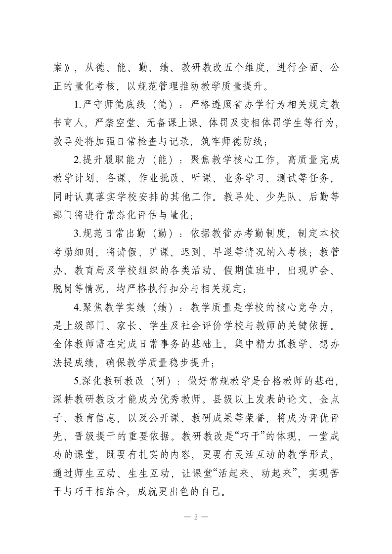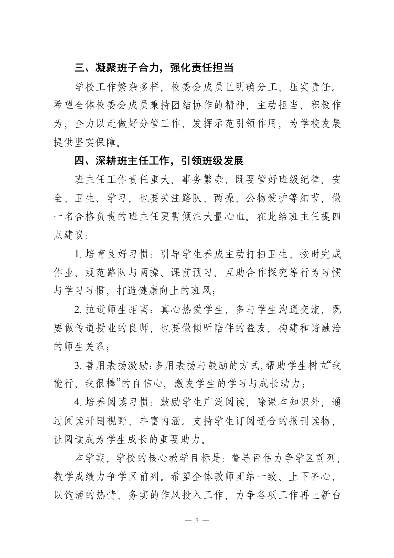 秋季下半学期教学工作会议校长讲话各位老师:大家好!本学期,在上级教育主管部门的正确领导和全体教师的共同努力下,XX学校圆满完成各项教育教学任务,教学质量实现显著提升。下半学期,为进一步推动学校工作再上新台阶,我代表学校向全体教师提出以下工作要求与希望,核心围绕“强安保、抓常规、促教研、提质量”四大关键词展开。一、筑牢安全防线,守护校园平安安全是学校工作的前提和底线,唯有校园平安、师生无恙,教育教学、教研提升等工作才能有序推进。全体教师需共同扛起安全责任:1.坚守课堂安全:认真履职授课,关注课堂上学生的行为与状态,及时化解矛盾、消除隐患,确保课堂教学安全有序;2.强化安全教育:班主任要常态化开展校内外安全教育,覆盖交通、消防、防溺水、食品安全等重点领域,提高学生安全意识与自我保护能力;3.落实值班值守:严格按照学校值班安排履职尽责,在学生上学、放学等关键时段,做好引导与守护工作,保障学生人身安全。希望全体教师上下一心,共同打造平安和谐的校园环境。二、抓实常规管理,夯实教学根基本学期,学校将修订完善《XX学校教学工作量化评估方1
