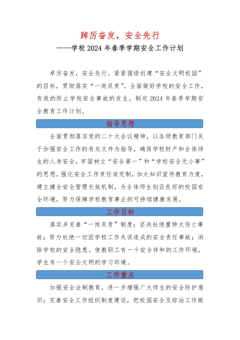 踔厉奋发,安全先行学校2024年春季学期安全工作计划卓厉奋发,安全先行。紧紧围绕创建“安全文明校园”的目标,贯彻落实“一岗双责”。全面做好学校的安全工作,有效的防止学校安全事故的发生,制定2024年春季学期安全教育工作计划。指导思想全面贯彻落实党的二十大会议精神,以各级教育部门关于加强安全工作的有关文件为指导,确保学校财产和全体师生的人身安全,牢固树立“安全第一”和“学校安全无小事”的思想。强化安全工作责任追究制,加大知识宣传教育力度,建立健全安全管理长效机制,为全体师生创设良好的校园安全环境,努力保障学校教育事业的可持续健康发展。工作目标落实并完善“一岗双责”制度;坚决杜绝重特大伤亡事故;努力杜绝一切因学校工作失误造成的安全责任事故;消除学校的安全隐患。使教职工有一个安全祥和的工作环境,学生有一个安全文明的学习环境。工作重点加强安全法制教育,进一步增强广大师生的安全防护意识;完善安全工作组织制度建设,把校园安全及综治工作做