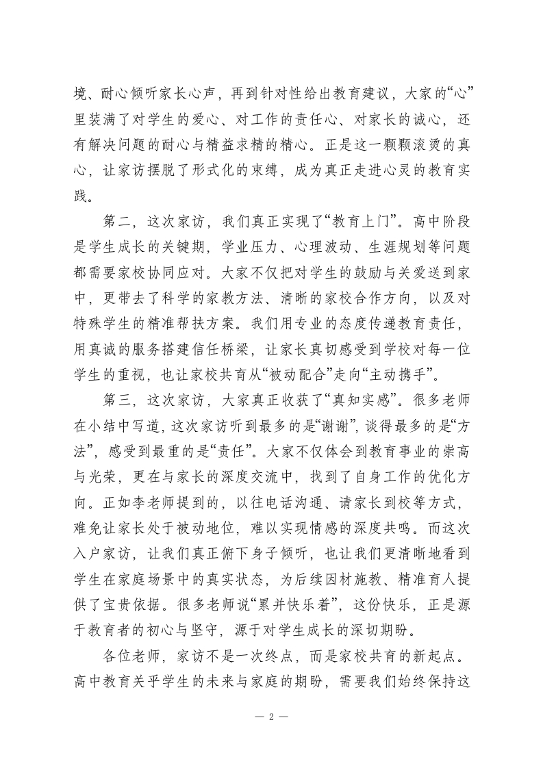 秋季学期家访总结会高中校长发言:以爱为桥,共育成长各位老师:大家好!这学期的家访活动,从精心动员、周密筹备到扎实推进,今天正式进入理性总结的阶段。两个月来,大家克服秋冬季节天气多变、部分学生家住偏远等困难,带着对教育的赤诚与对学生的关爱,走进了一个个家庭。大家用诚恳的交流拉近距离,用耐心的倾听了解诉求,用清晰的解释传递理念,用及时的反馈回应期待,正如很多老师所说,我们不仅感动了学生和家长,更在这场双向奔赴的教育互动中,收获了彼此的信任与认可。在此,我向每一位全力以赴的老师、同事们,致以最诚挚的敬意!刚才四位老师的分享格外精彩,有的诙谐智慧、引人深思,有的平实真挚、娓娓道来,有的激昂有力、饱含深情。从他们的家访故事里,我听到了“爱、责任、沟通、合作、激励、坚守”这些关键词,这也让我想起一位老师在小结中写下的那句话一一“爱是我们共同的语言”。除了今天分享的故事,这次家访中还有太多温暖与感动值得铭记,后续请政教处牵头整理,把这些宝贵的教育智慧汇编成册,让大家互通有无、共享经验。回顾这次家访,我有三点特别深刻的感触,想和大家共勉:第一,这次家访,大家真正做到了“用心用情”。从提前梳理学生学情、定制个性化沟通方案,到入户后细致观察家庭环1