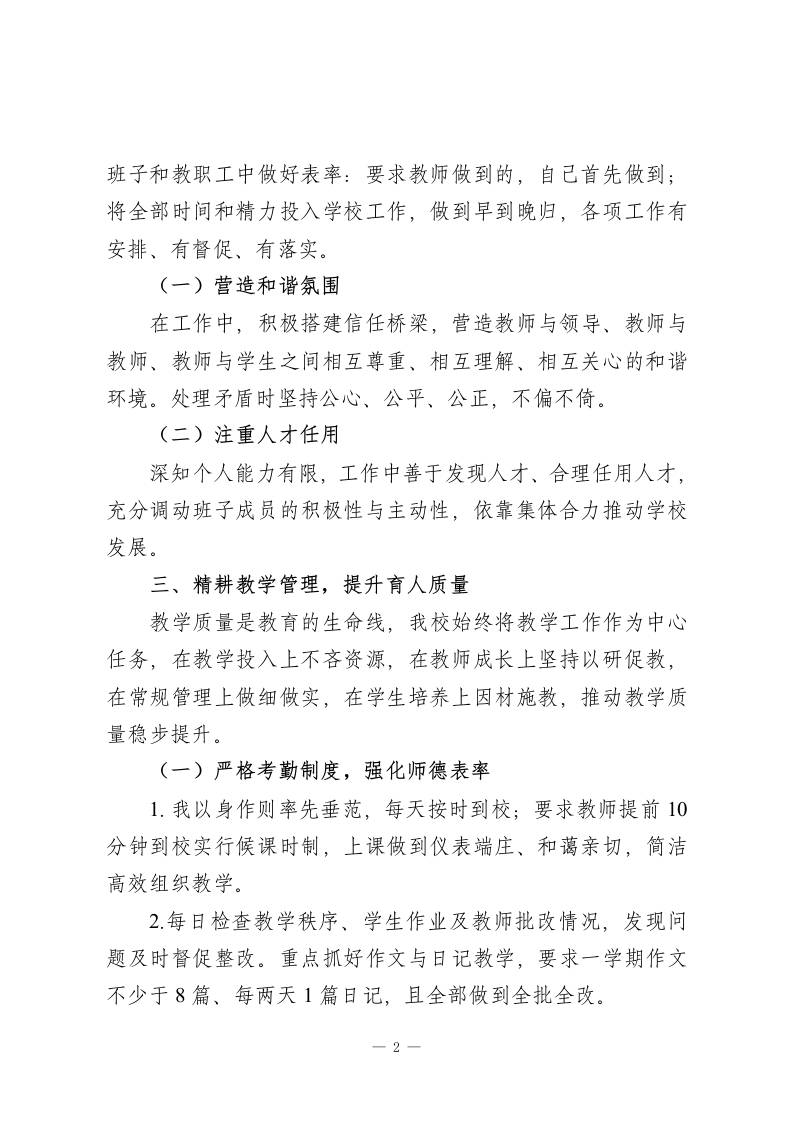 秋季学期校长述职报告:自主发展强根基,守正创新促长效尊敬的各位领导、老师们:大家好!在局领导的信任与全体师生的关怀支持下,今年我继续担任z2小学校长。本学期,学校在教育局和中心校的正确领导下,在镇、村两级政府的关怀支持下,在全体教职员工的共同努力下,克服专任教师短缺的困难,扎实推进各项工作,教学质量显著提升,走出了一条农村小学依靠挖掘自身潜力实现优质发展的道路。现将本学期履职情况汇报如下,核心围绕“坚持以人为本,科学管理,走自主发展道路,确保学校的可持续发展”这一主题展开,请予评议。一、锚定办学方向,明确发展蓝图本学期,我校立足农村教育实际、着眼学生长远发展,确立“以人为本,科学管理,全面发展,学有所长”的办学理念,以培养“行为良好、体魄健康、求知主动、人格健全、生活自主、创新发展”的合格人才为目标,进一步规范校园管理,强化养成教育,大力推进新课程课堂教学模式改革,推动学校整体工作稳步向前。二、建强班子队伍,凝聚奋进合力“一个好校长就是一所好学校”,但办好一所学校更需依靠集体的智慧与力量。作为校长,我始终以高标准要求自己,在1