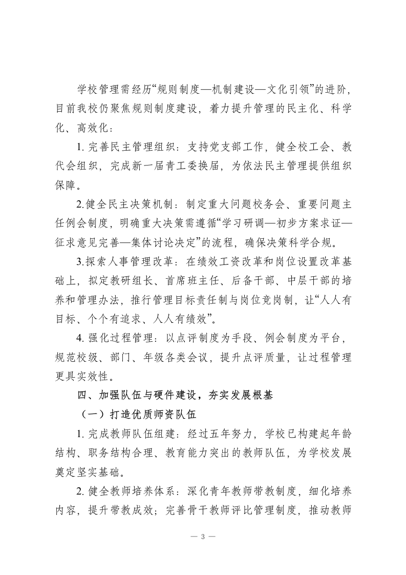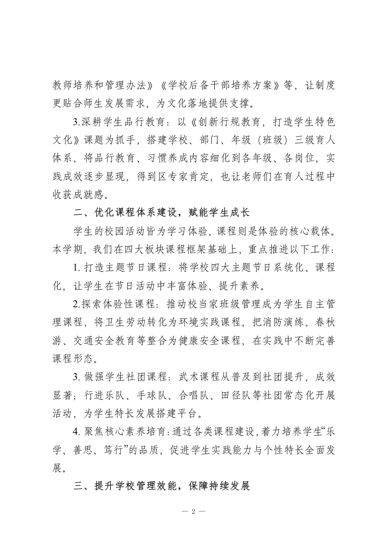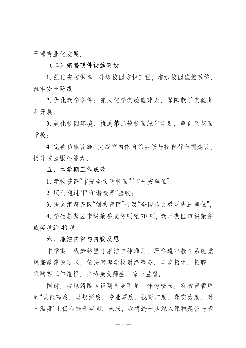 秋季学期中学校长述职述廉报告:以师生发展为核,筑学校优质之基尊敬的各位领导、老师们:大家好!本学期已近尾声,回望任职以来的历程,自2020年5月担任Xx中学校长至今,我始终怀揣创业者的憧憬与责任,以“将老师和学生的发展视为根本使命和目标”为初心,带领全校师生探索前行。这五年,有摸索中的困惑,更有成长后的喜悦。实践让我深刻认识到,办好x中学,需坚守追求卓越的勇气、求真务实的作风、终身学习的习惯与立校为公的品质,唯有凝聚团队共识,以科学、民主、规范的方式推进内涵建设,才能实现学校的优质发展。现将2025年秋季学期述职述廉情况汇报如下:一、深化校园文化建设,筑牢发展灵魂校园文化是学校发展的核心灵魂,承载着全体师生的共同价值追求。在“和谐温馨、科学规范、实践创新”的文化建设目标基础上,本学期我们持续丰富文化内涵、优化落地路径:1.完善教育价值体系:在前期办学理念、培养目标、学风目标的基础上,进一步明确教风和校训,让学校发展方向更清晰,为内涵建设提供坚实框架。2健全制度保障机制:修订完善考核方案、奖励方案等现有制度,强化制度执行力;增订《中学职业道德规范》《骨干1