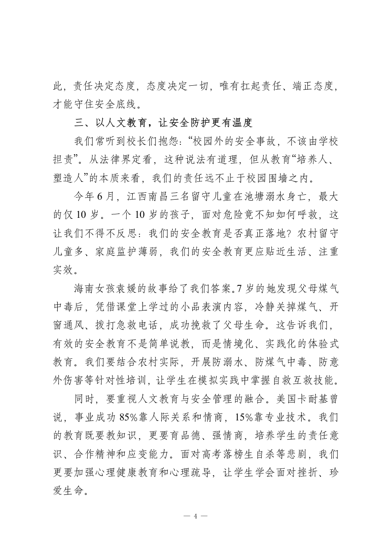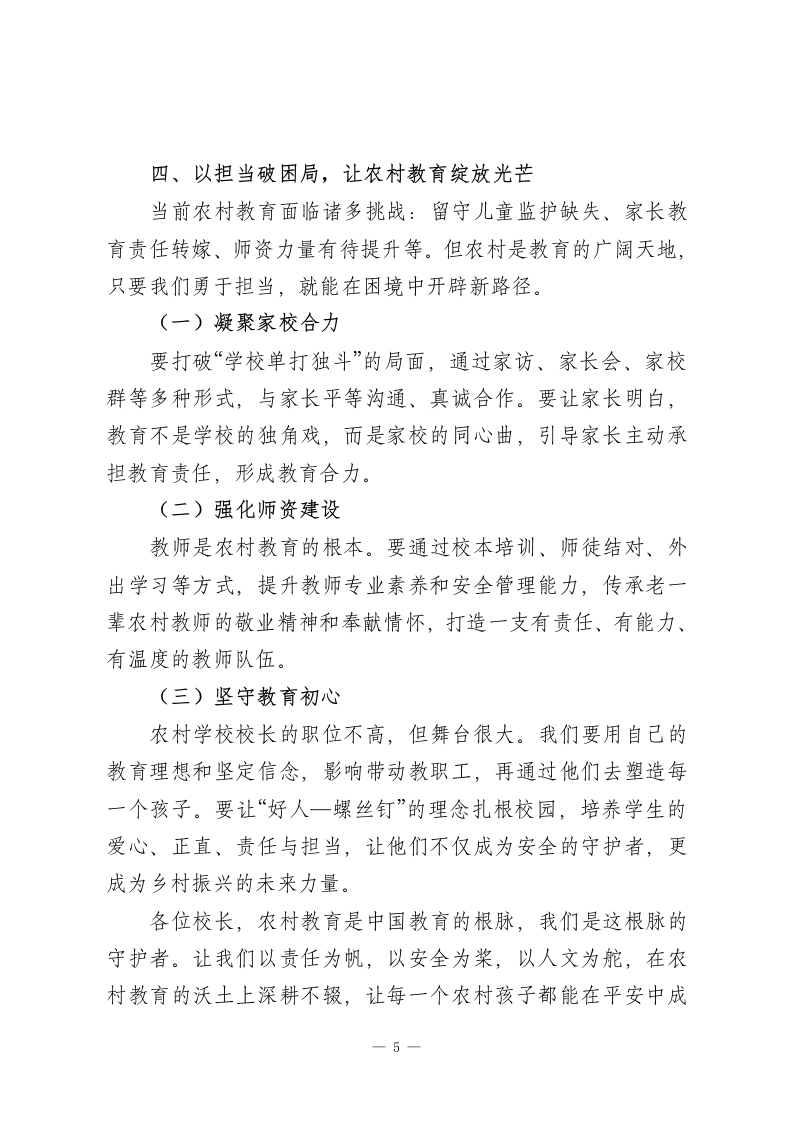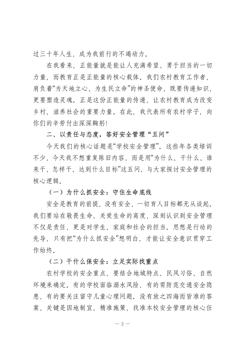 全市农村学校校长培训班发言:守好农村教育根脉,让安全与希望双向绽放尊敬的各位校长:大家好!首先,我要向长年奋战在农村教育一线的各位,致以最真挚的敬意!你们扎根乡野、坚守初心,用“不以物喜,不为己悲”的敬业精神追逐教育梦想,为农村孩子点亮希望,你们辛苦了!也感谢领导给予我这次与大家交流的机会,让我们能共探农村教育的责任与未来。一、以教育正能量,筑牢农村教育之基我是农村教育培养出来的孩子,至今仍深深感念那些曾为我托举梦想的农村校长和老师。小时候,家庭贫困几乎让我辍学,是一任又一任校长和老师,拖着疲惫的身躯一次次登门劝说父母“让孩子把学上完”;当我连铅笔和作业本都买不起时,是老师们悄悄把文具塞到我手里,用慈爱的目光和肩头的轻拍,给了我无限温暖与力量。那时候的农村校长,披星戴月经营着不起眼的乡村学校,带着我们夏季拾麦穗、秋季捡黄豆、冬季刨红薯,在“勤工俭学”中让我们懂得“粒粒皆辛苦”。这种“生活即教育”的实践,比空洞的口号更有力量。他们拿着微薄的薪水,却从未抱怨,用“捧着一颗心来,不带半根草去”的情怀,诠释了教育的真谛。校长送给我的“贫穷才需奋斗,落后就要拼搏”这句话,更是伴随我走1
