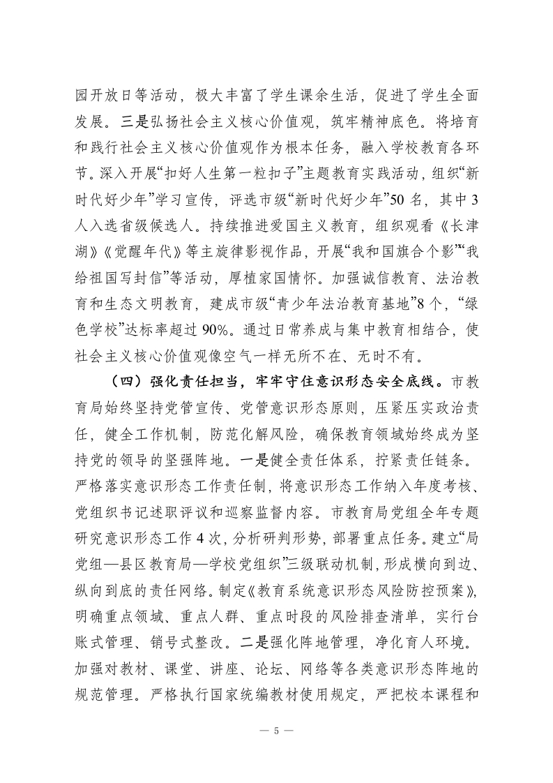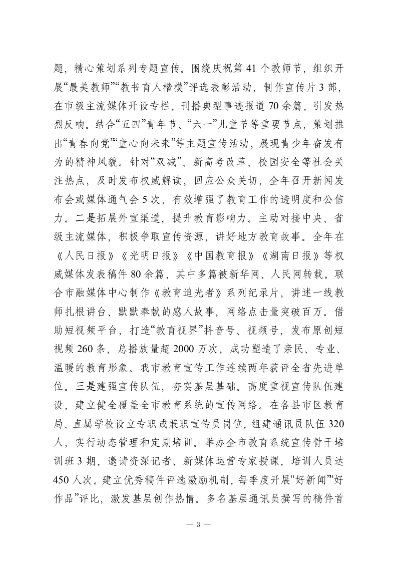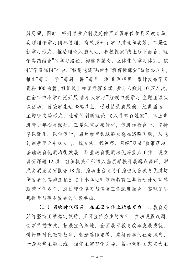 市教育局2025年宣传思想文化工作总结2025年,市教育局坚持以习近平新时代中国特色社会主义思想为指导,深入学习贯彻党的二十大和二十届三中、四中全会精神,全面贯彻习近平总书记关于宣传思想文化工作的重要论述,牢牢把握“举旗帜、聚民心、育新人、兴文化、展形象”的使命任务,紧紧围绕教育改革发展中心大局,守正创新、主动作为,持续深化理论武装、强化舆论引导、厚植校园文化、建强宣传队伍,不断推动全市教育系统宣传思想文化工作提质增效,为加快建设高质量教育体系、办好人民满意的教育提供了坚强的思想保障、强大的精神动力和良好的社会氛围。一、主要工作情况(一)筑牢思想根基,在理论武装上深耕细作。市教育局始终把加强党的创新理论学习作为首要政治任务,坚持用马克思主义中国化时代化的最新成果统一思想、统一意志、统一行动,切实增强广大干部师生的政治认同、思想认同、理论认同和情感认同。一是突出“关键少数”,示范引领学深悟透。严格落实党委(党组)理论学习中心组学习制度,全年组织开展集中学习16次,专题研讨8次,重点围绕《习近平谈治国理政》第四卷、习近平总书记关于教育的重要论述、全国两会精神以及中央关于意识形态工作的决策部署等内容进行系统研学。建立“第一议题”机制,做到重大会议精神第一时间传达、重要文件第一时间学习、重点任务第一时间部署。领导班子成员带头讲党课、作辅导报告共32场次,形成以上率下、层层带动的良1
