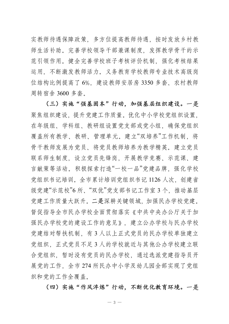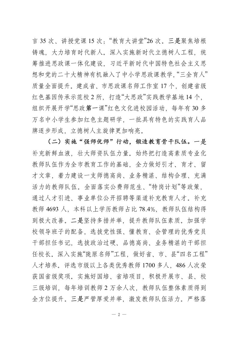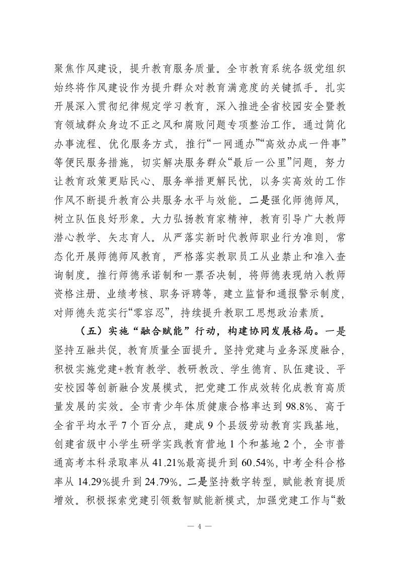 市教育局党组2025年述职述廉述党建工作报告今年以来,市教育局党组坚持以习近平新时代中国特色社会主义思想为指导,深入学习贯彻党的二十届四中全会精神和习近平总书记关于教育工作的重要讲话、重要指示批示精神,实施“政治领航、强师优师、强基固本、作风淬炼、融合赋能”五大行动,不断强化党对教育工作的全面领导,以党建工作高质量开展引领教育事业高质量发展。一、主要工作情况(一)实施“政治领航”行动,筑牢育人根本方向。一是坚持党建引领,把牢正确办学方向。坚持把党建工作作为教育各项工作的生命线,牢牢把握教育的政治属性、人民属性、战略属性,全面实行中小学党组织领导的校长负责制,全市具有独立法人资格的450所公办中小学及幼儿园实现党的组织和党的工作全覆盖,党的领导贯穿办学治校、教书育人全过程各方面,党的教育方针得到全面贯彻落实,社会主义办学方向愈加坚定。二是加强政治建设,筑牢对党忠诚之魂。市教育局党组严格落实“第一议题”制度,建立党组统一领导、机关党委具体负责、党支部狠抓落实、党员干部全员参与的“四位一体”理论学习机制,创新打造“教育大讲堂”学习品牌,构建起层次分明、覆盖全面、形式多样的常态化学习教育体系,持续对党员干部开展对党忠诚教育。2025年以来,局党组理论学习中心组学习14次、交流研讨7次;局机关党委5个支部学习72次、交流发1